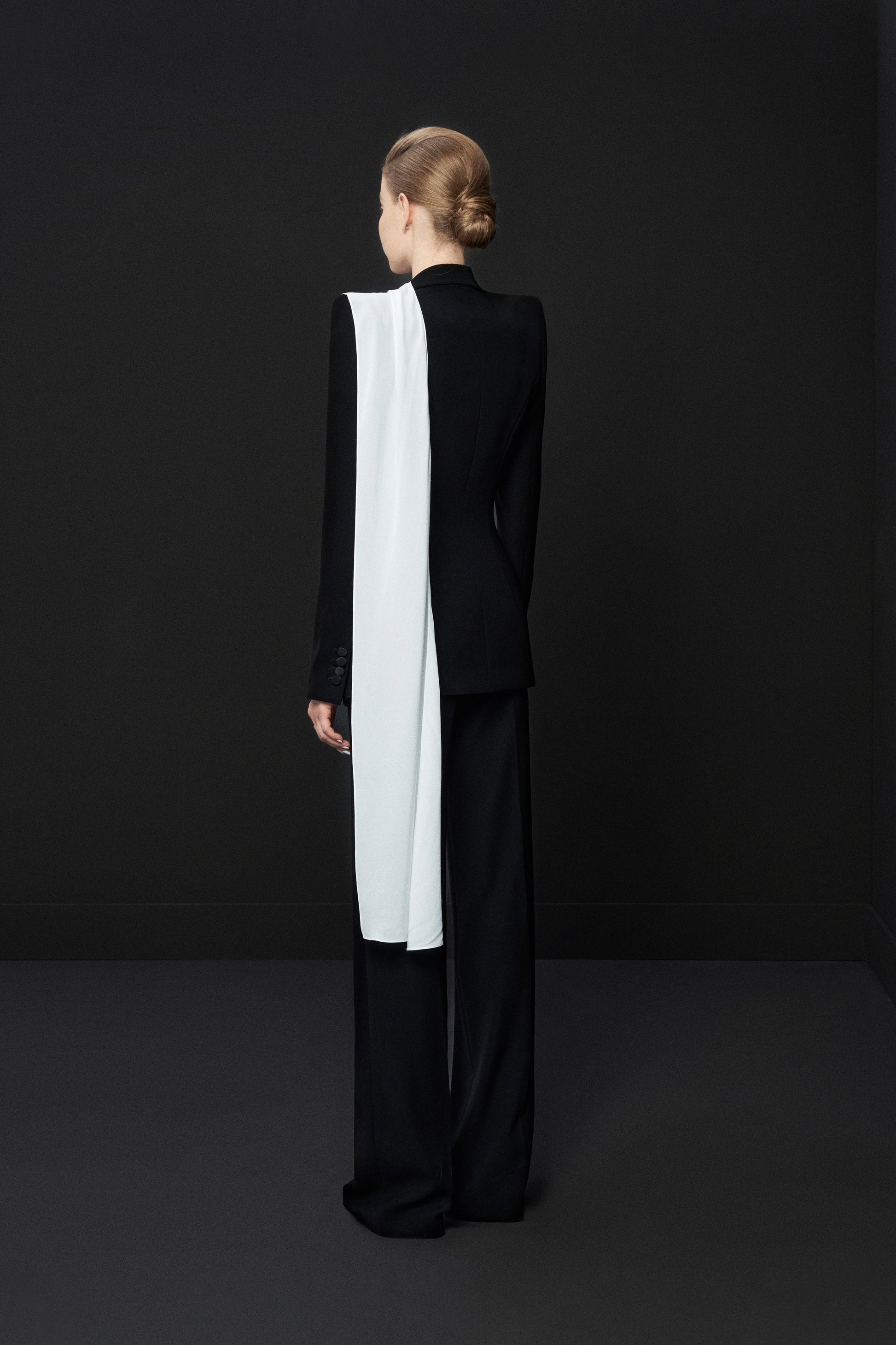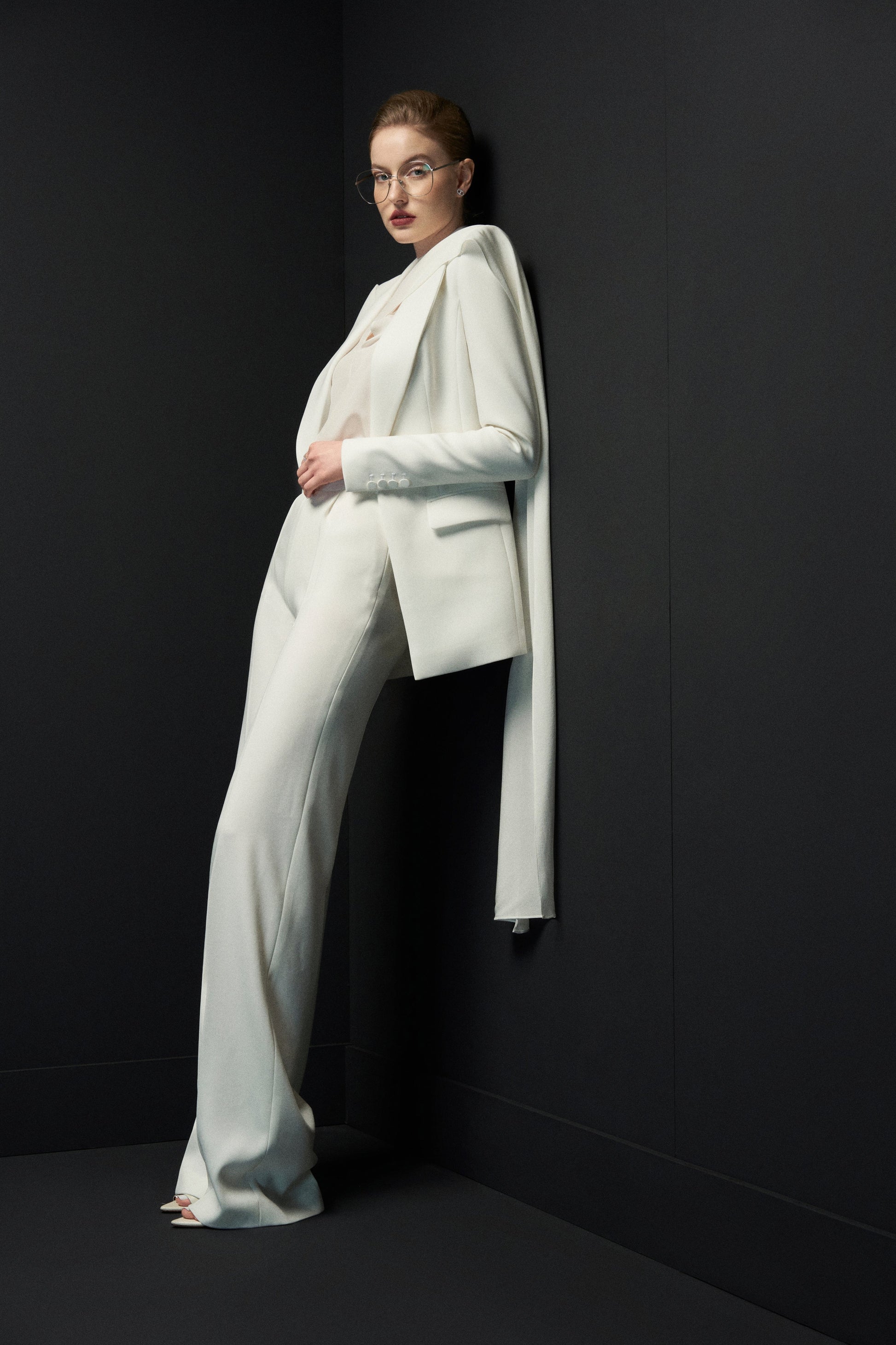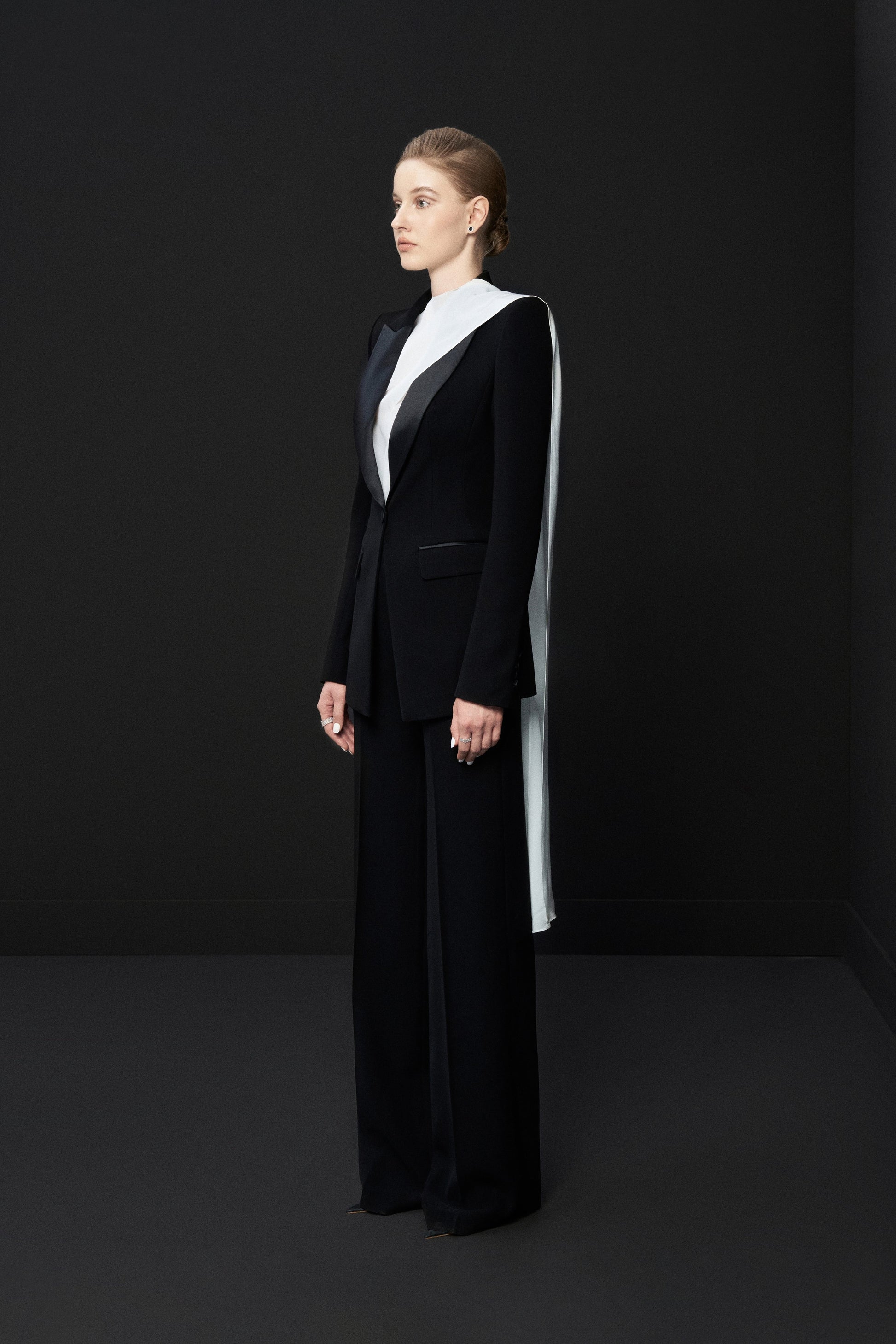 Áo vest cổ ve vếch phom ôm bám, Single – breasted – 1 hàng khuy có 1 khuy. Thân áo bổ mảng tạo eo, form liền thân. Tay kiểu 2 mang may cá tay, đính 4 cúc bọc bằng vải chính. Ve áo vếch bản ve 12,5cm được phối bằng vải satin, vạt nhọn, thân bổ mảng. Có 2 túi cơi có nắp, cơi bằng vải satin.