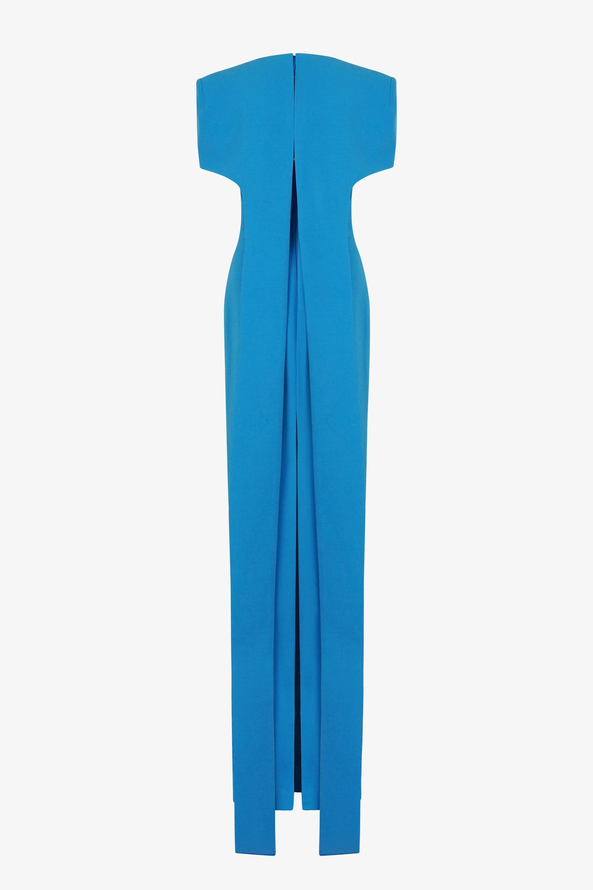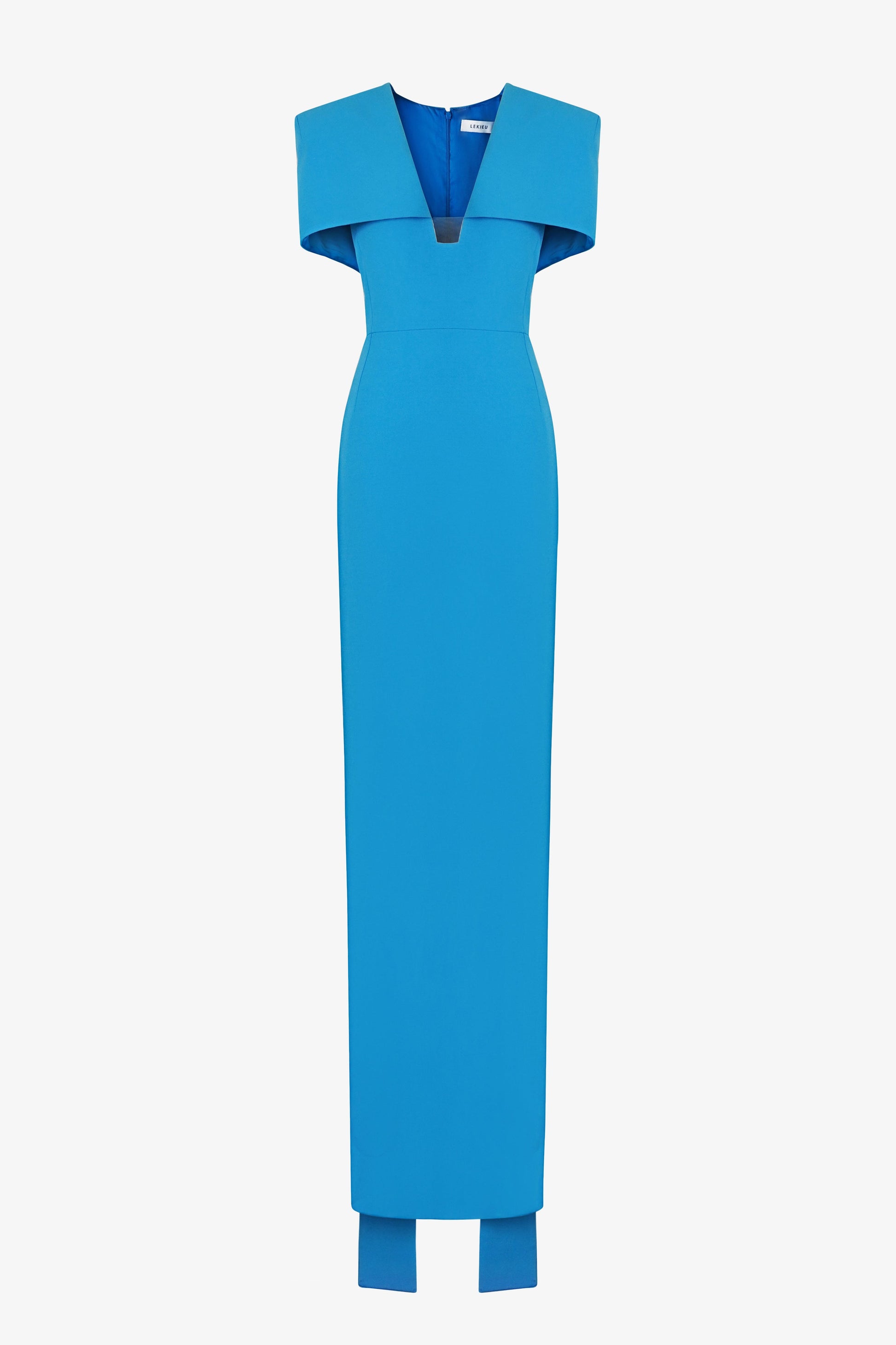 Váy dạ hội với đáp choàng vai, cổ hình V cắt sâu, có miếng đáp bằng vải màu da ở giữa váy để che ngực để tạo sự kín đáo. Áo choàng vai có hai dải dài trang trí ở phía sau.