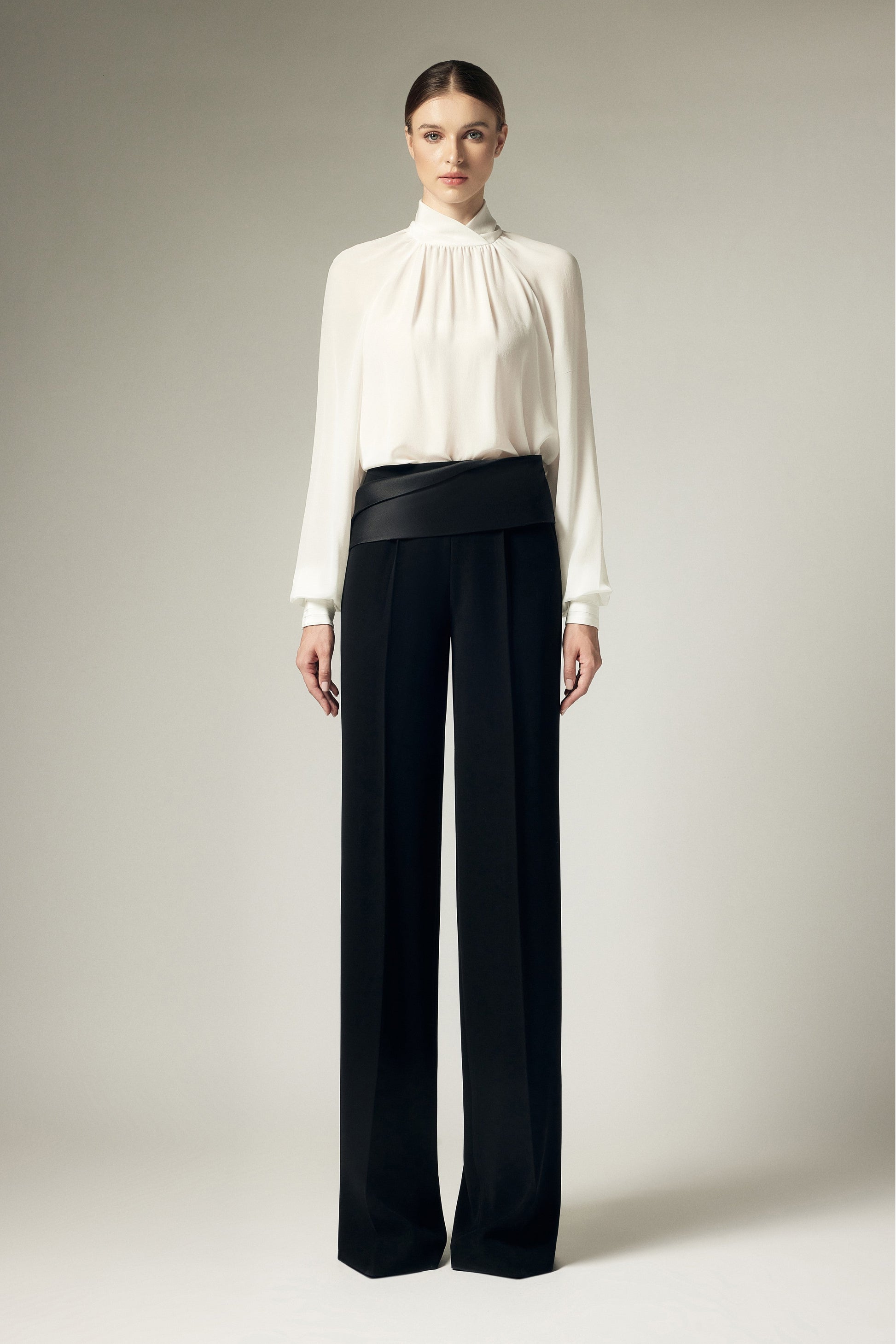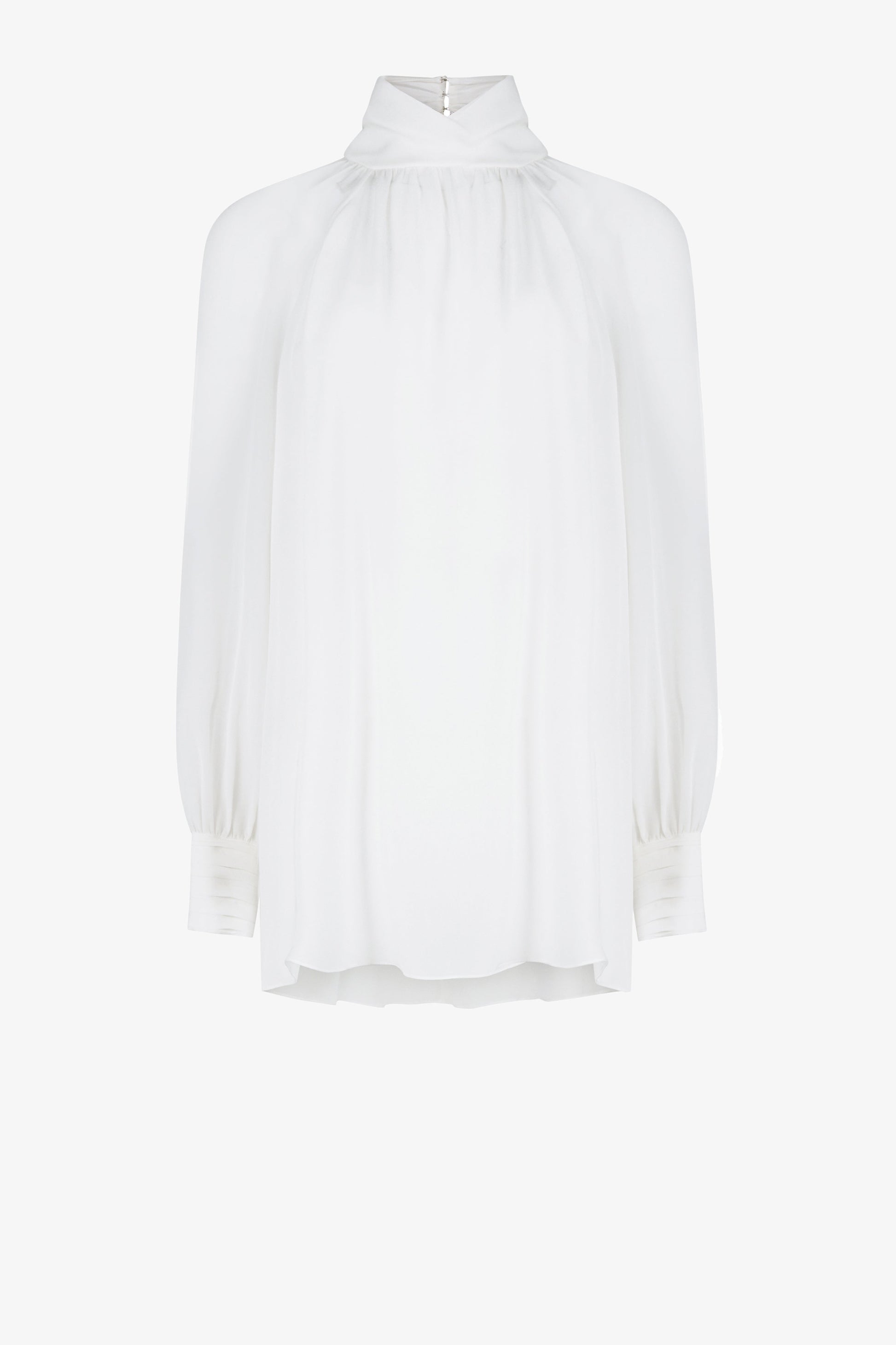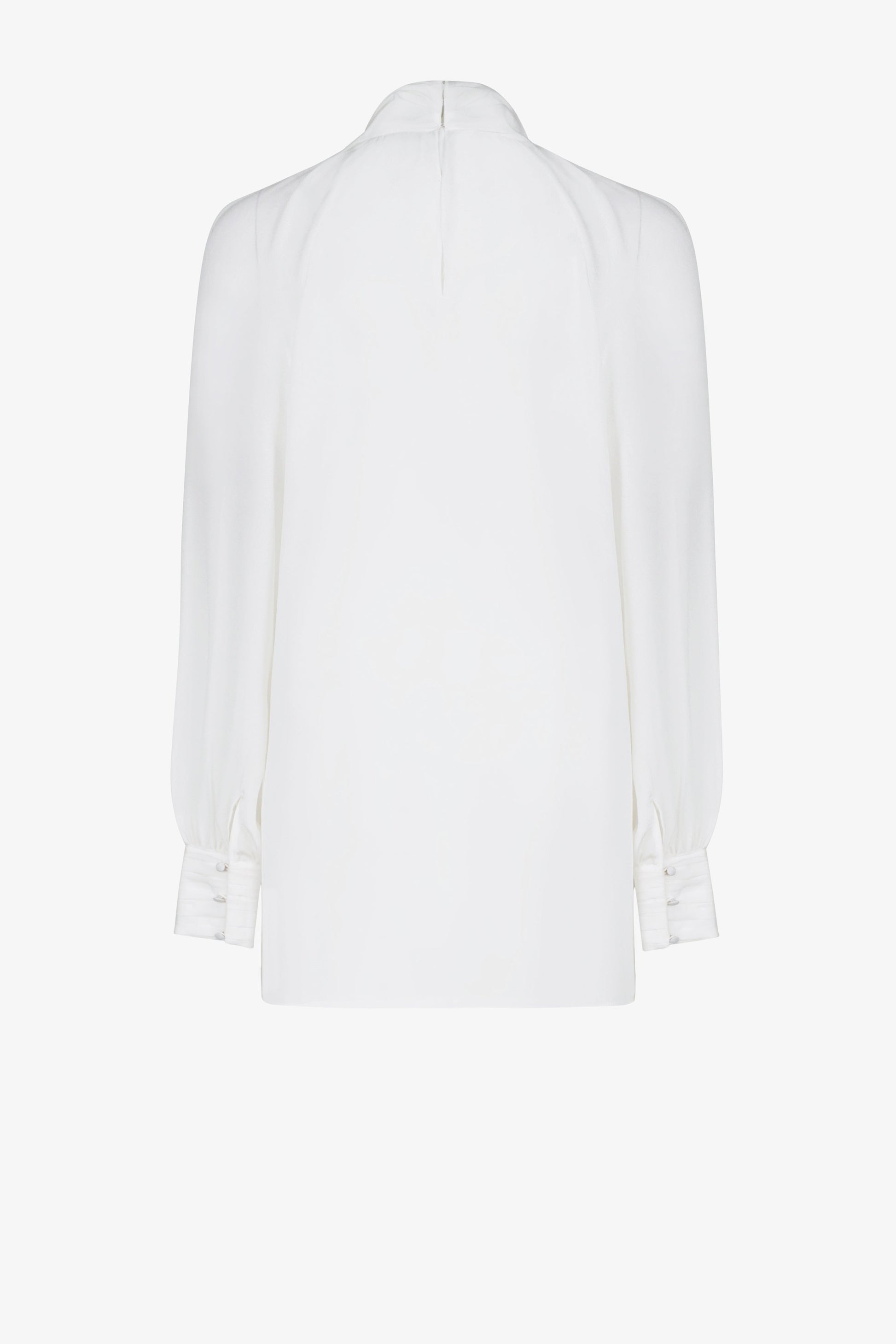 Sơ mi dáng suông, tay dài xếp phồng cửa tay, vai raglan xếp nếp, cổ vắt chéo. Có móc cài sau cổ.