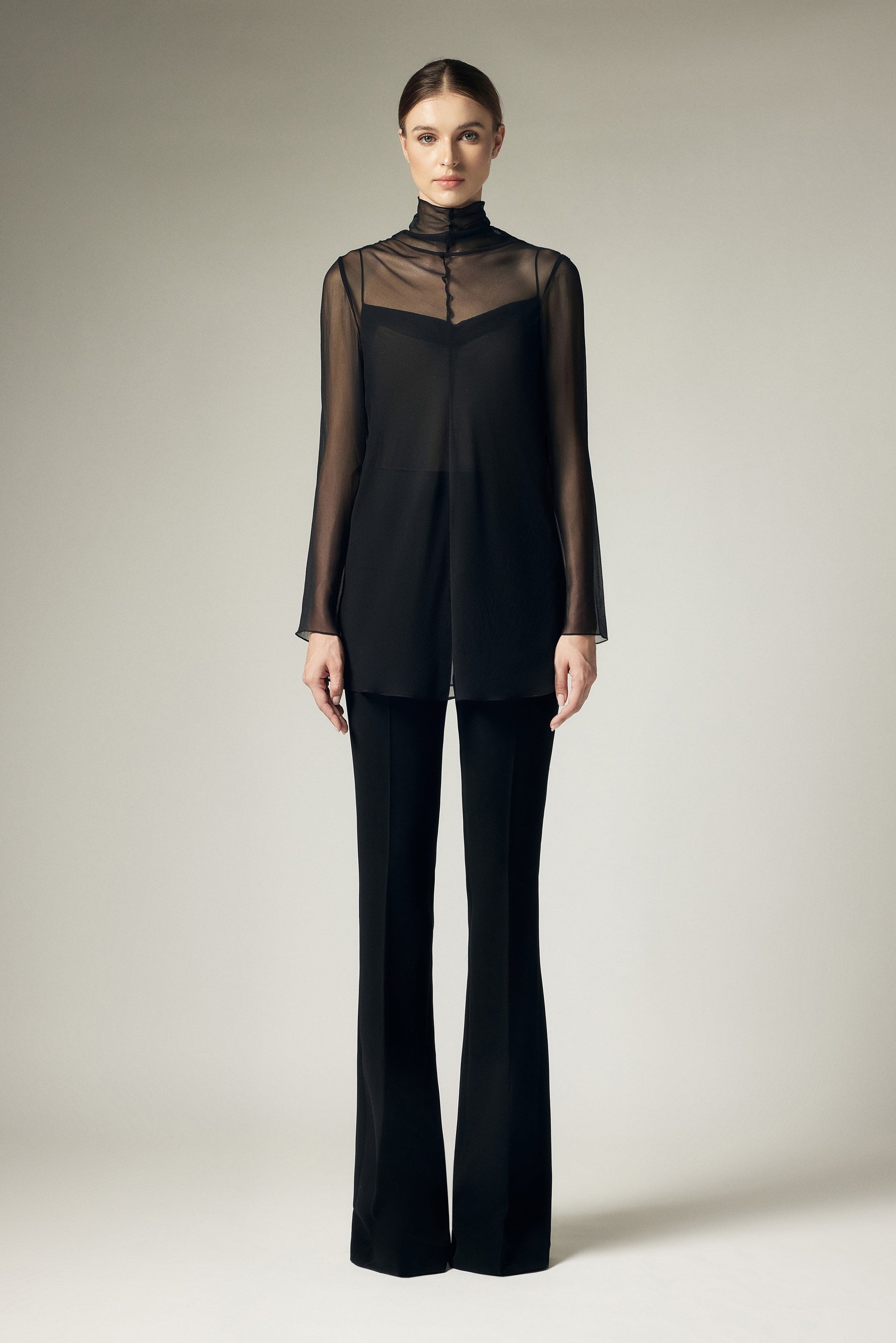 Áo sơ mi cổ leo cao dài tay, dáng suông, bổ giữa thân, may cuộn mí các đường may, có áo 2 dây mặc trong.
