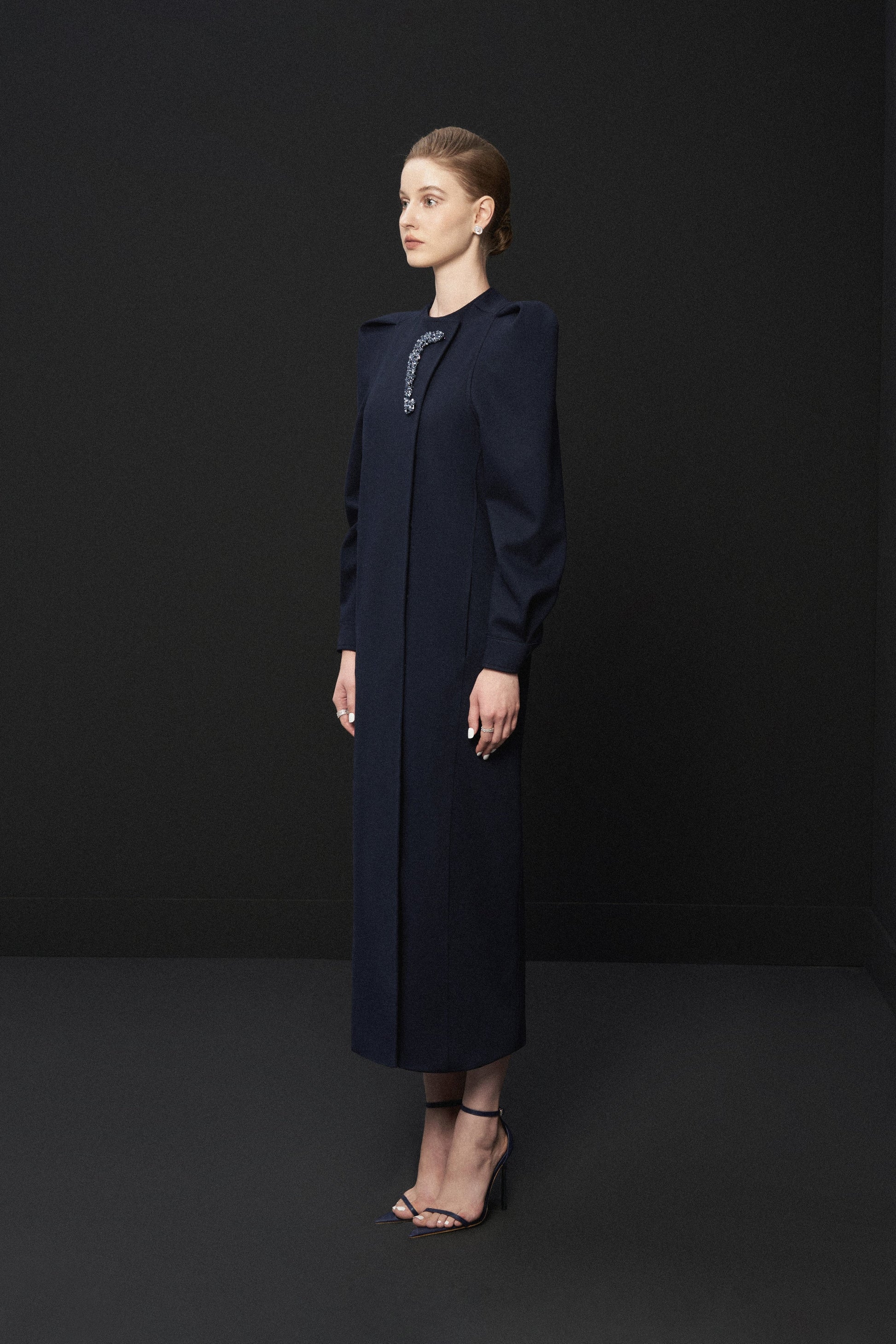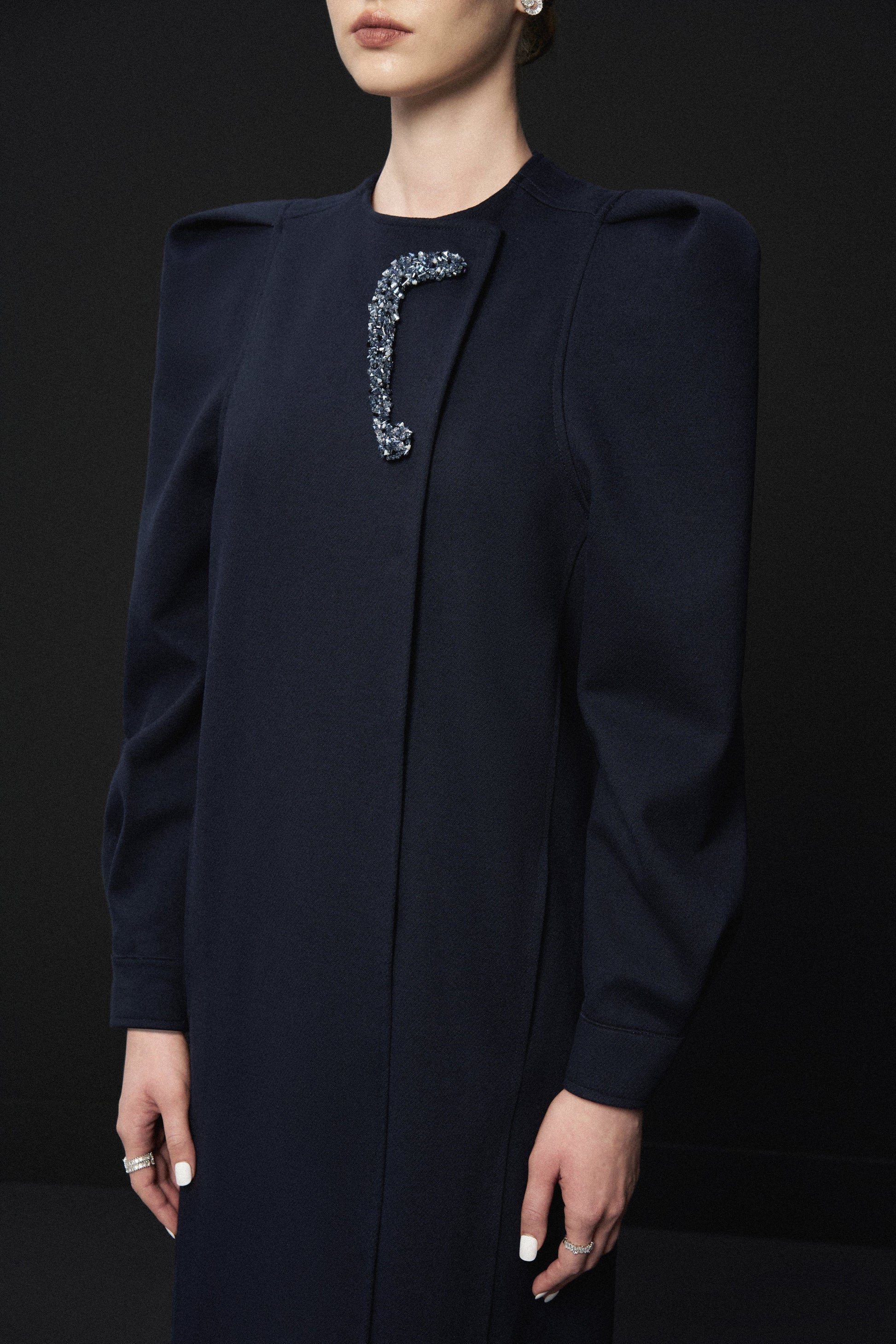 Áo khoác dáng over size dài đến ngang bắp chân, tay xếp ly xúp, phồng to, cửa tay được thu nhỏ bằng đường đính cá tay. Thân áo bổ mang, Túi dọc 2 bên hông. Áo được cố định bằng hàng cúc bấm kim loại. Được trang trí bằng miếng cài áo đính đá Swarovski và phale tinh xảo.