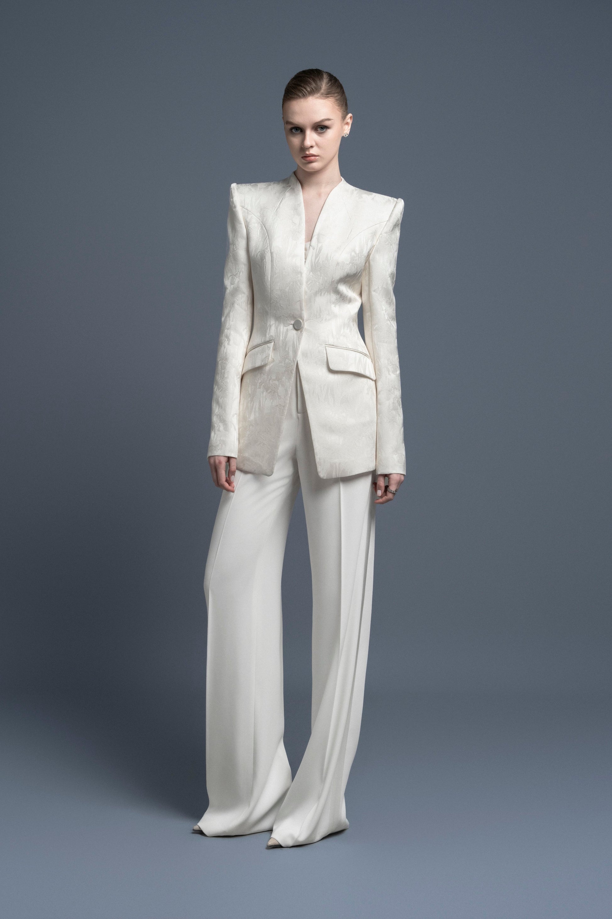 Mandarin collar fitted blazer: Single-breasted with one button, two front darts, and two angled flap pockets on both sides. The sleeves are designed with two parts and feature four buttons covered in the same fabric. The front hem is cut diagonally on both sides, and the back has a center seam.