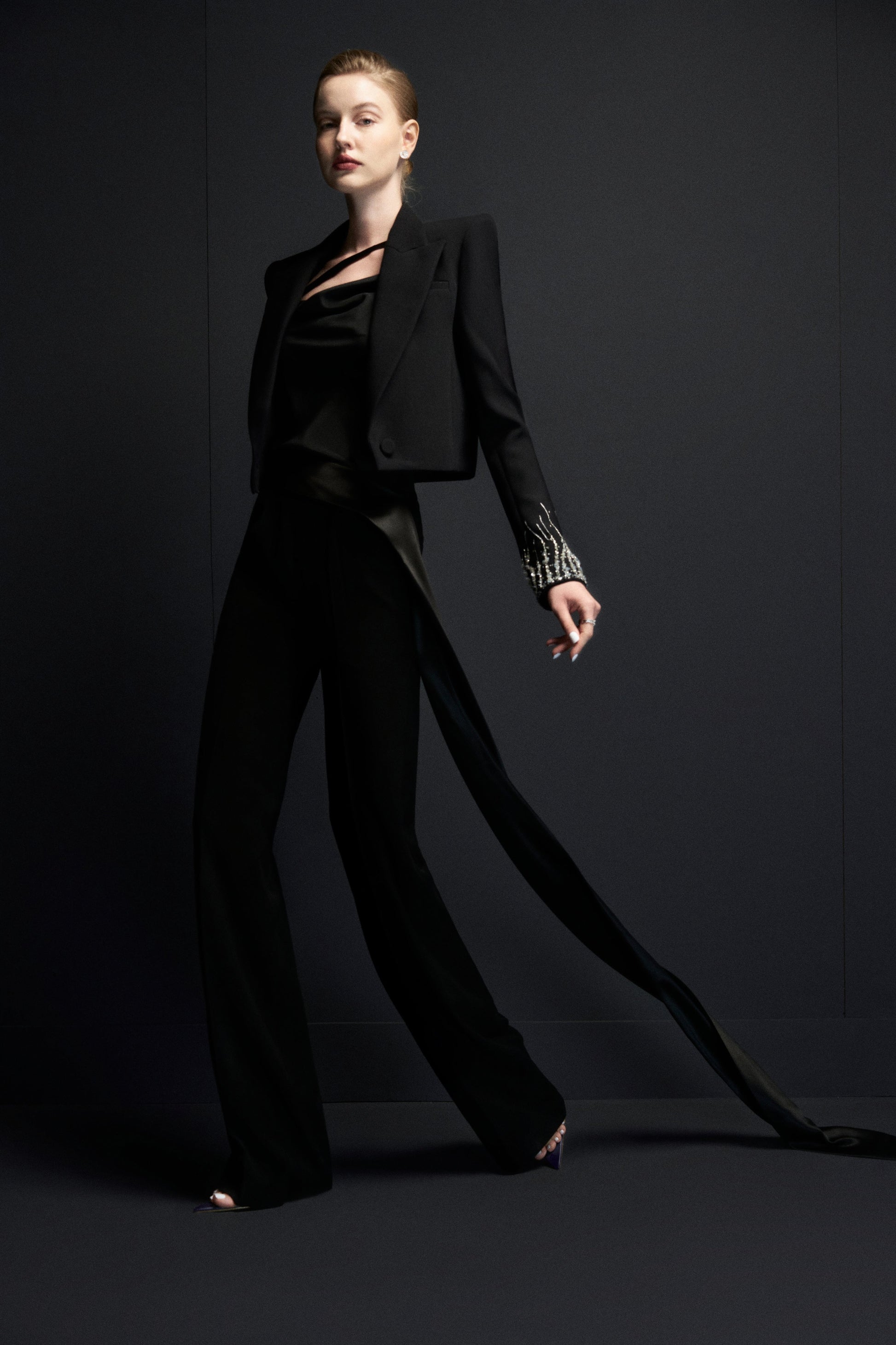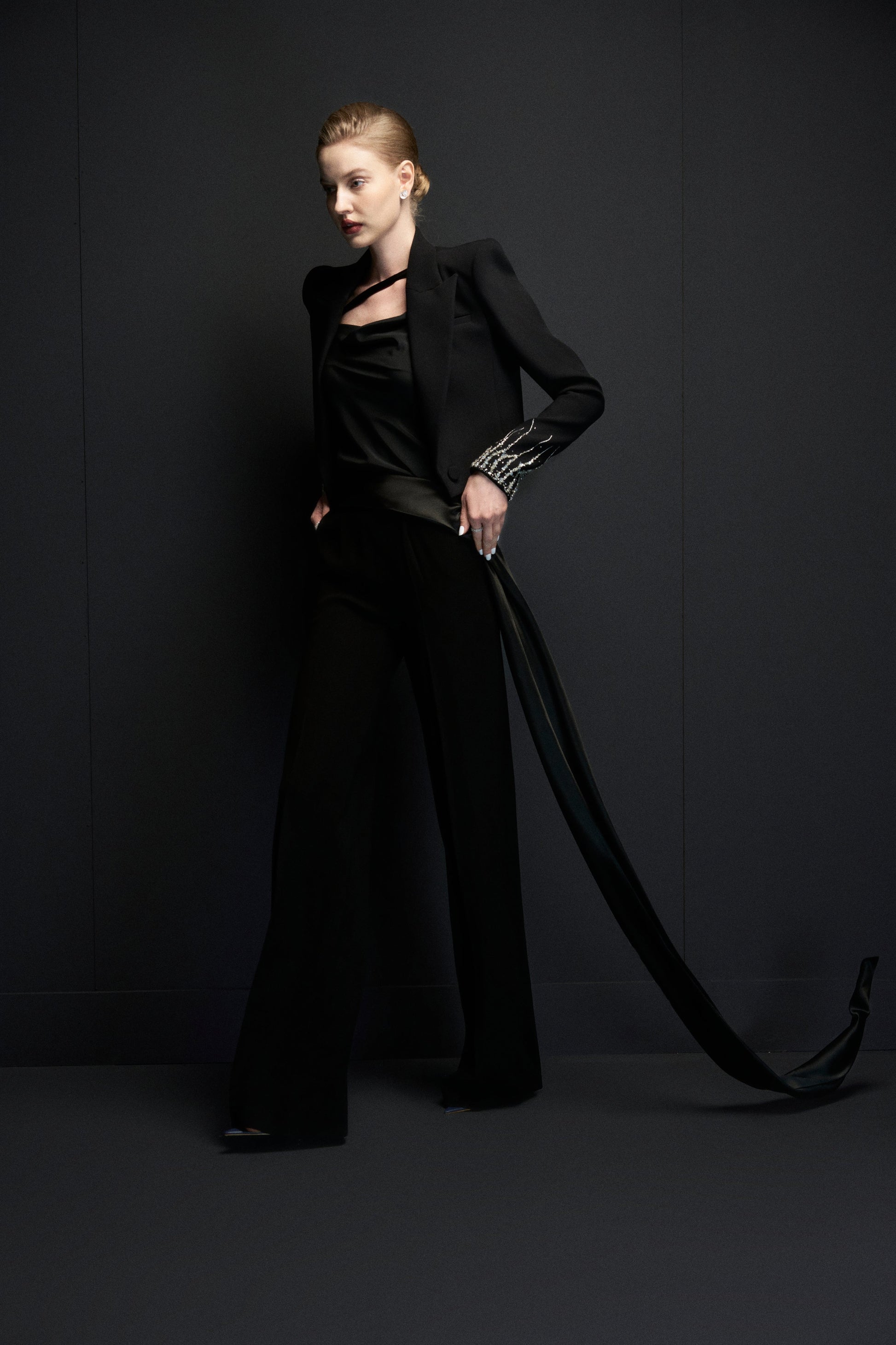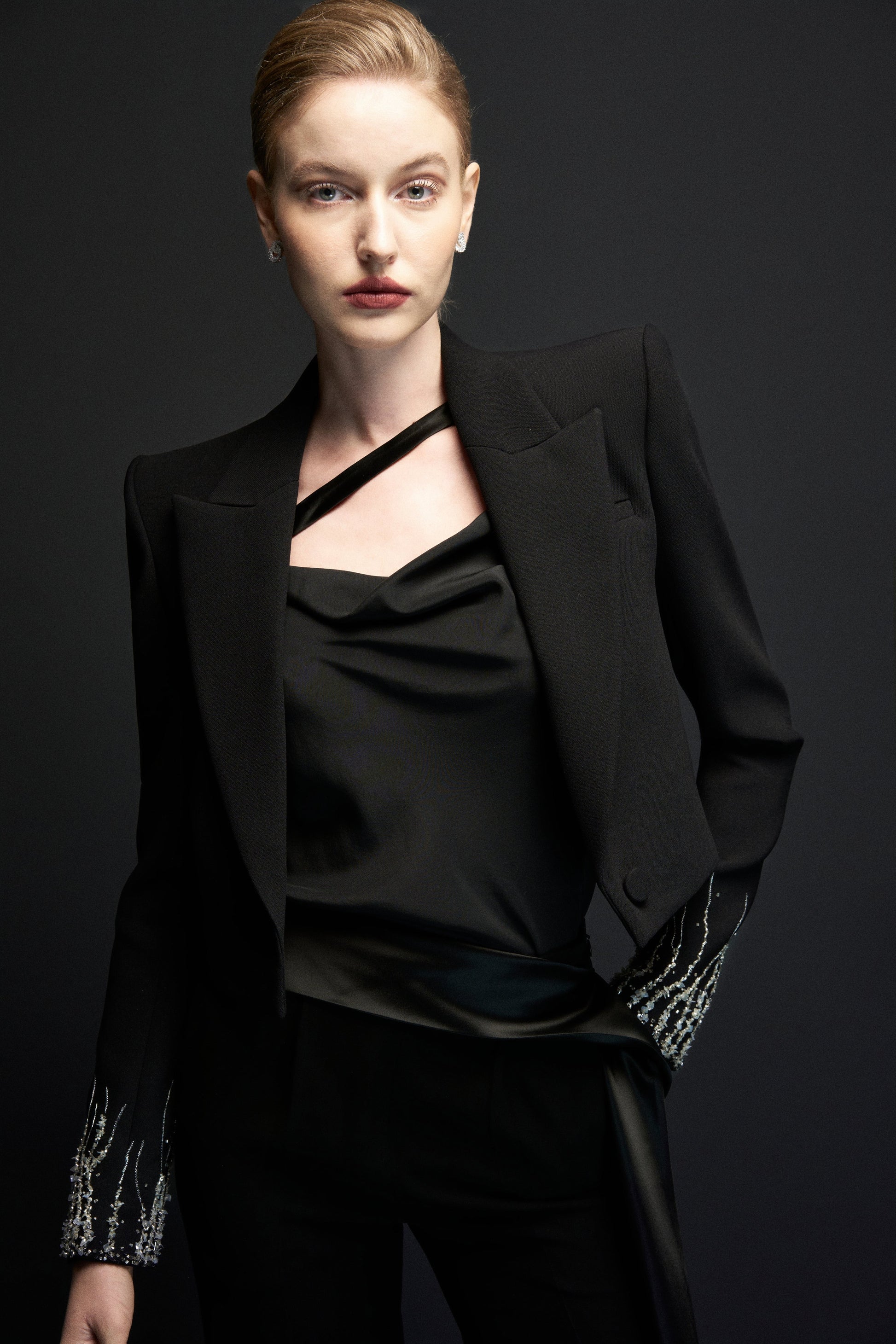 Áo dây xoắn lệch, cổ đổ nhẹ, dây xoắn vắt qua bắp tay, qua vai ra thân sau tạo 1 đường chéo cao sát chân cổ.