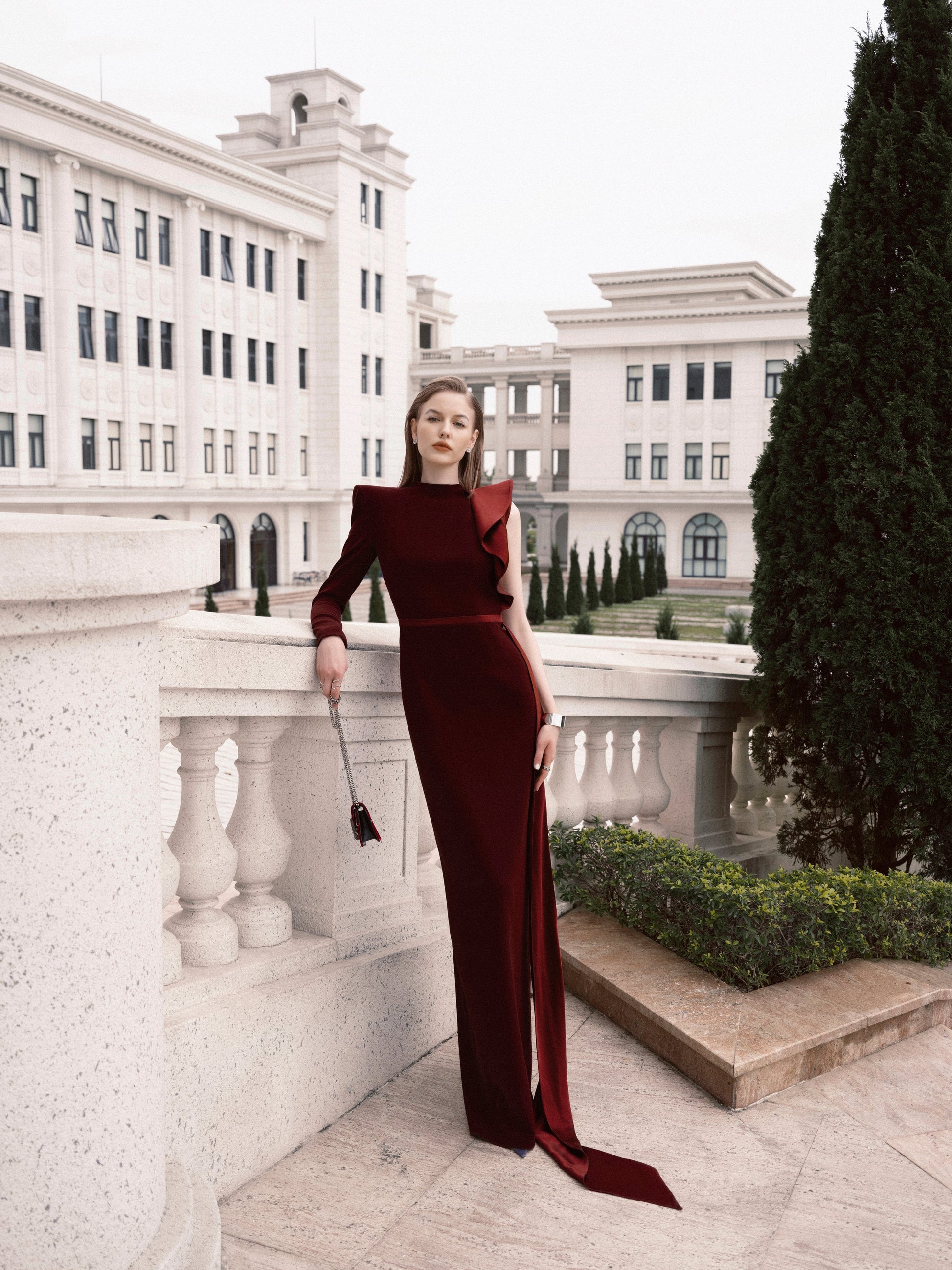 Đầm dạ hội dáng ôm bút chì cổ leo dài tay 1 bên, 1 bên không tay, cut out, drap bèo bằng vải phối satin, độn vai ngang. Thân trên và thân dưới có 2 ly chiết, xẻ chồng thân sau. Tay áo dài được thu gọn, tạo cảm giác thanh thoát, hiện đại. Phần drap nếp vải tạo điểm nhấn độc lạ. Đai eo bằng vải satin bong lật lên trên, tà satin buông dài được đính bong tại điểm sườn bên trái khi mặc. Tùng váy thân dưới dáng bút chì thằng, xẻ chồng thân sau. Khóa lệ.