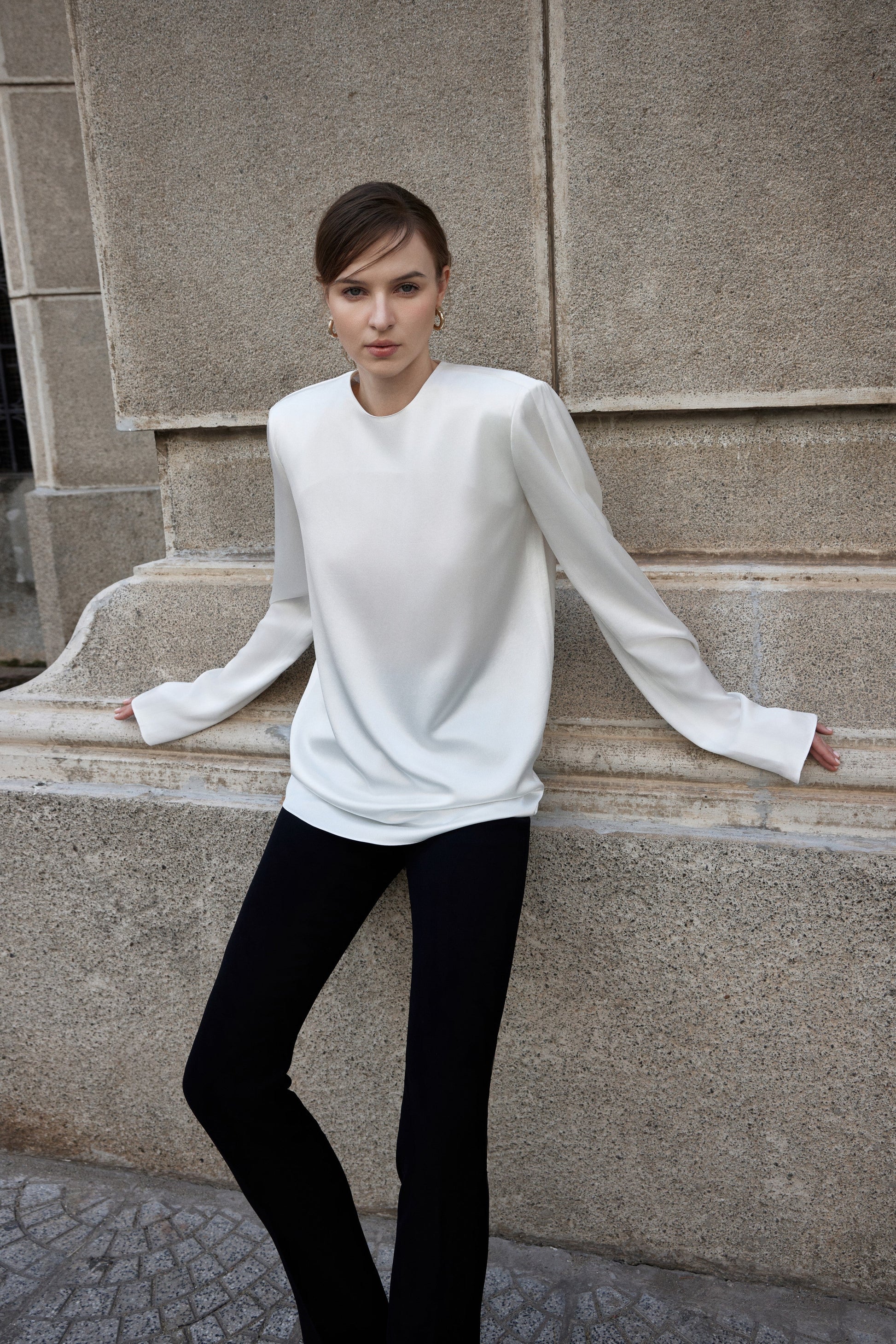 Thiết kế Bristol Top thuộc Bộ sưu tập Xuân Hè 24 được cải tiến những đường nét cắt, may với kỹ thuật biến đổi các đường ben (darts) và kỹ thuật Pattern 3D mang tới sự cân bằng giữa vẻ sang trọng đặc trưng và tính ứng dụng cao. Trên nền chất liệu Sateen mềm mại, những đường nét tinh chỉnh từng phần cầu vai, ống tay tạo nên những điểm nhấn tinh giản nhưng tôn lên vẻ thanh lịch, phóng khoáng của người phụ nữ LEKIEU.