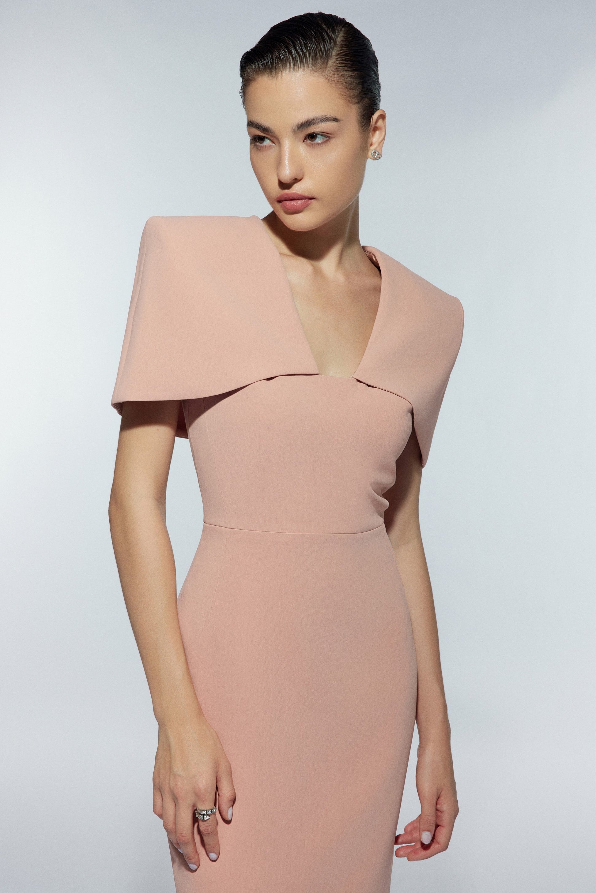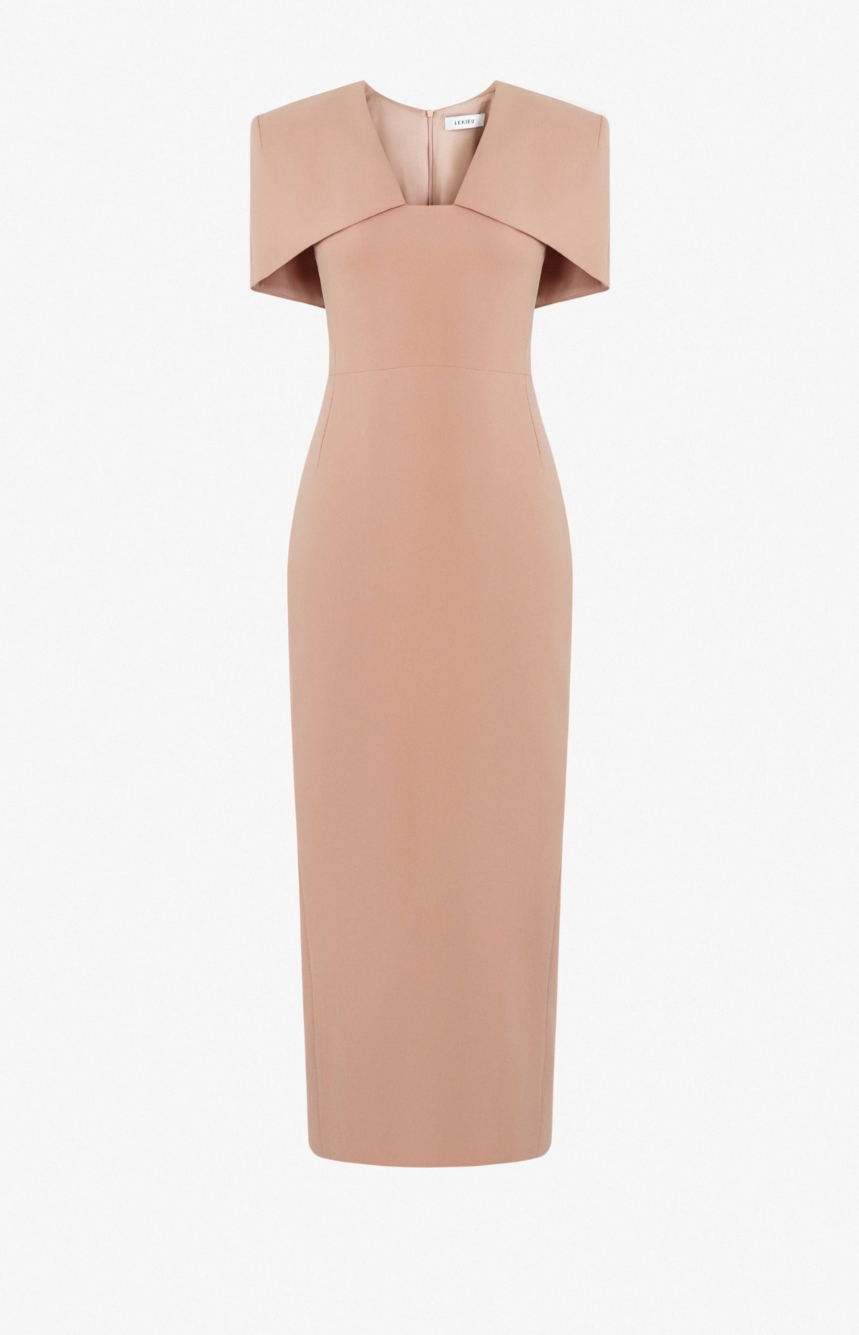 Váy với đáp choàng vai, cổ V cắt đến ngang ngực kín đáo. Váy cắt tại eo có hai đường li phía gần sườn để tạo độm ôm sát cơ thể. Dáng váy bút chì với chiều dài maxi trên mắt cá chân. Giữa thân sau của đầm có khóa lệ và khóa đồng cho đáp vai. Thân sau xẻ chồng.