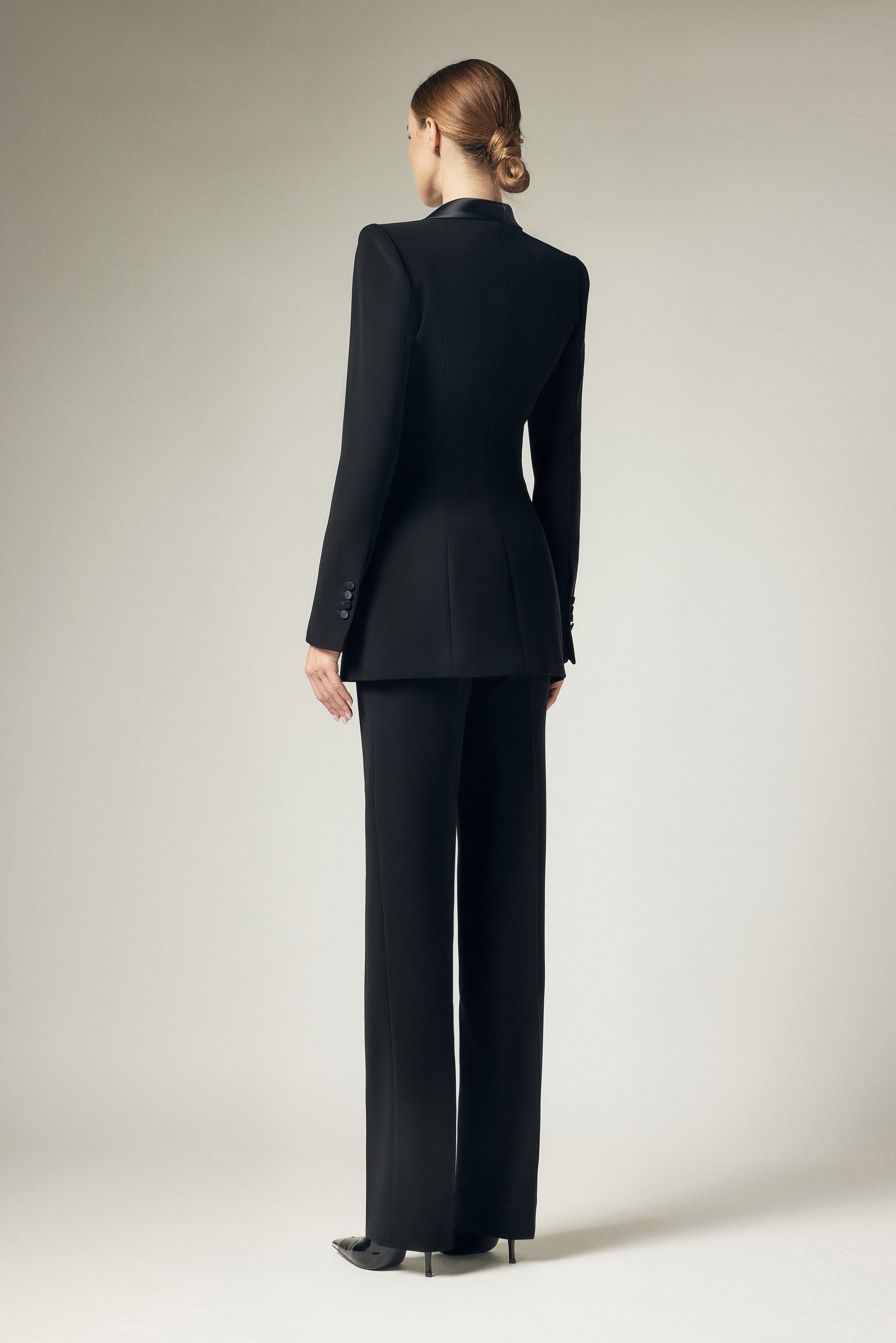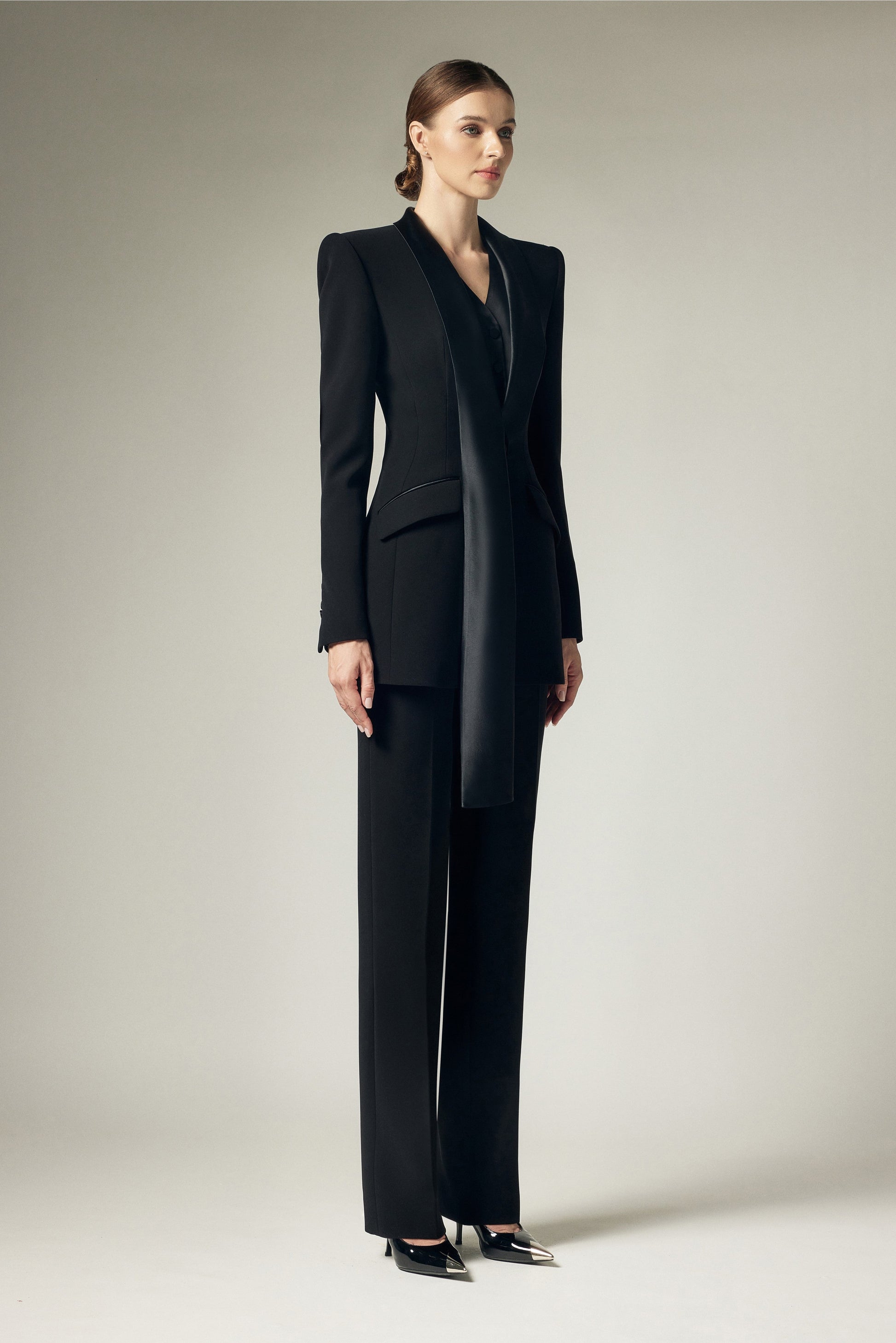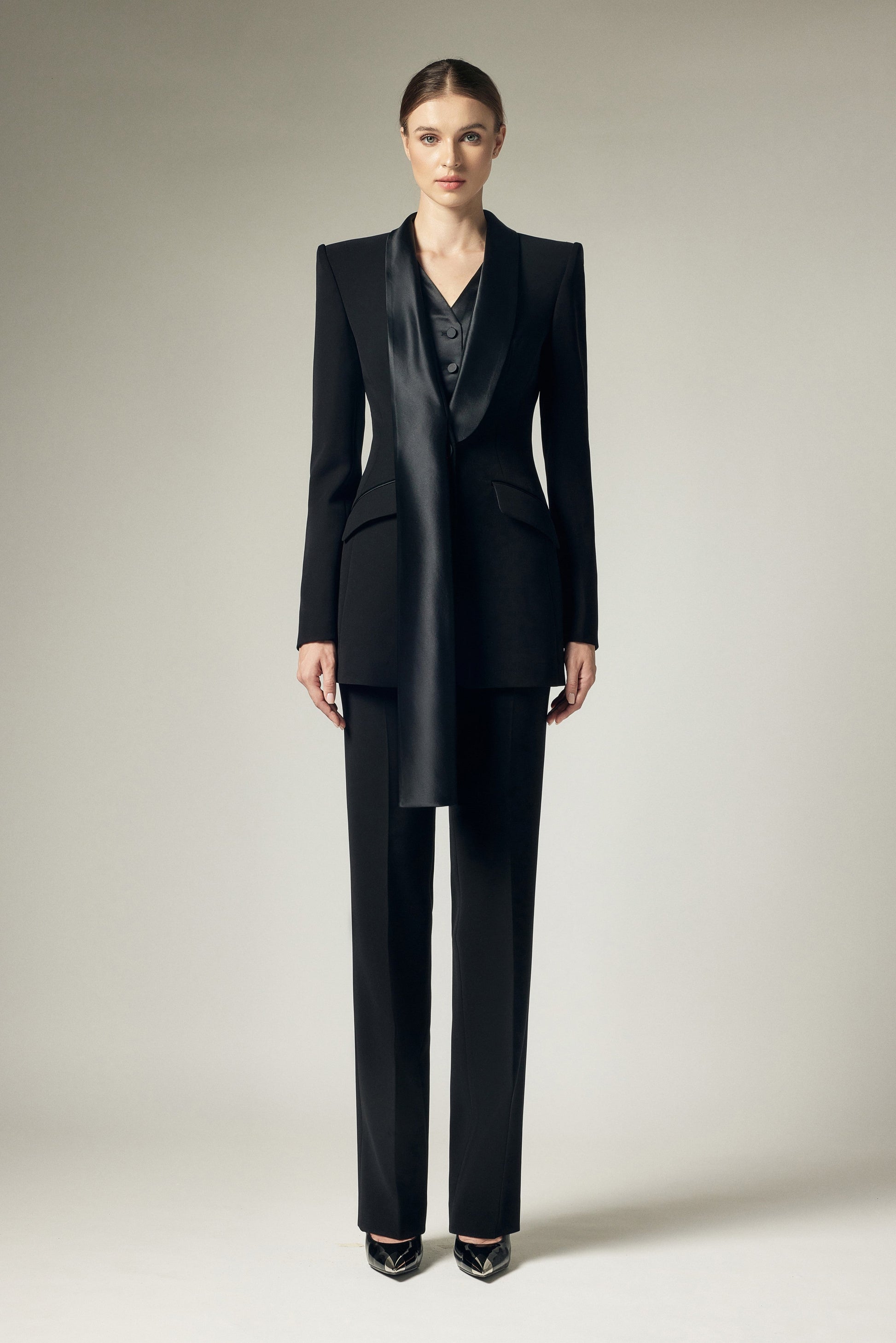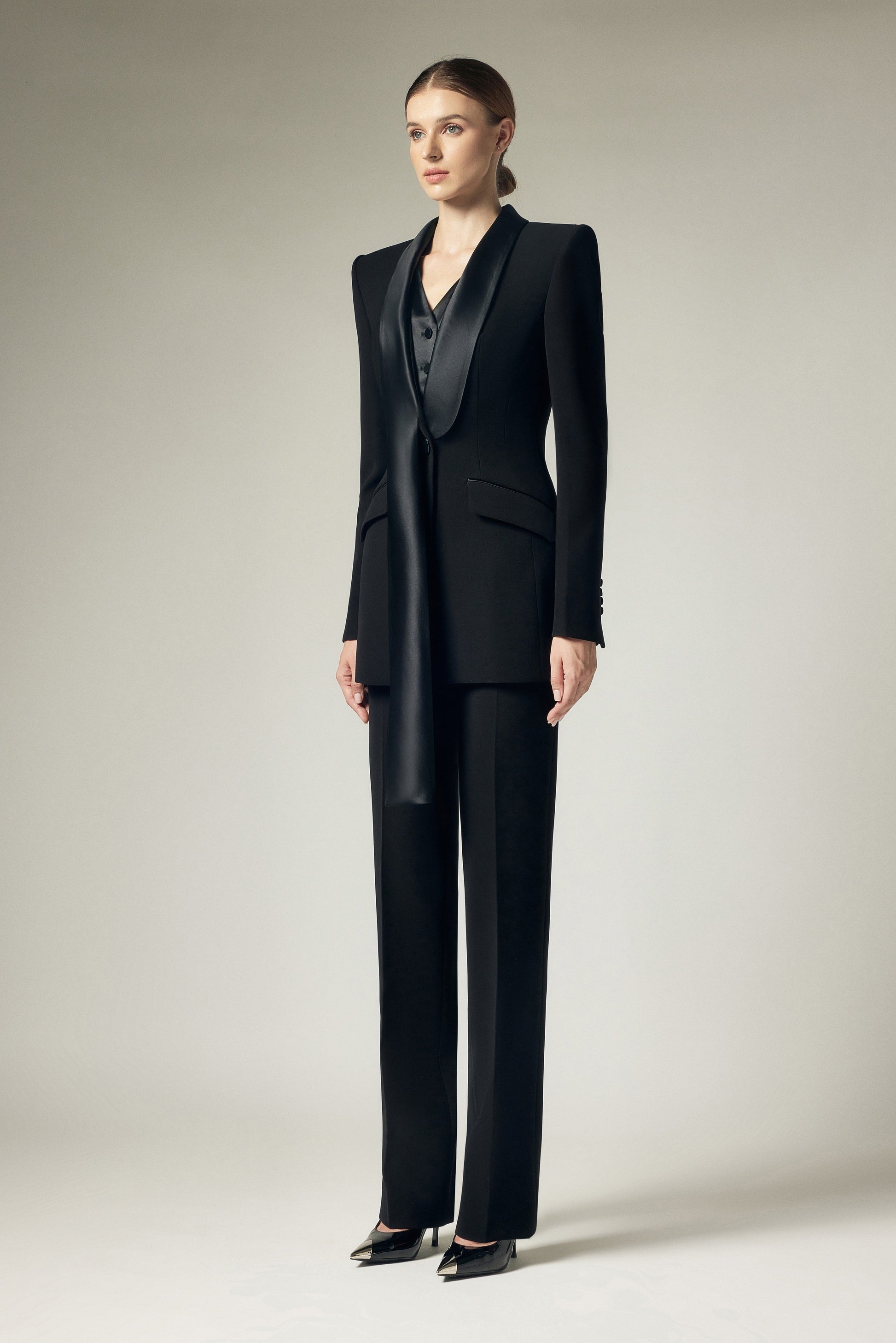 Áo Suit dáng ôm Single – breasted – 1 hàng khuy có 1 khuy, cổ sam vạt khăn bằng satin được thiết kế thả tự nhiên, vạt gấp nếp cố định, tạo đường cong liền mạch nối dài từ thân sau qua cổ ra phía trước tạo điểm nhấn độc đáo cho cổ áo . Áo form dáng dài, ôm sát eo. Tay kiểu 2 mang may cá tay, đính cúc. Có 2 túi cơi có nắp chéo thân. Phần áo gile may liền với vest , có 1 hàng khuy gồm có 4 khuy.