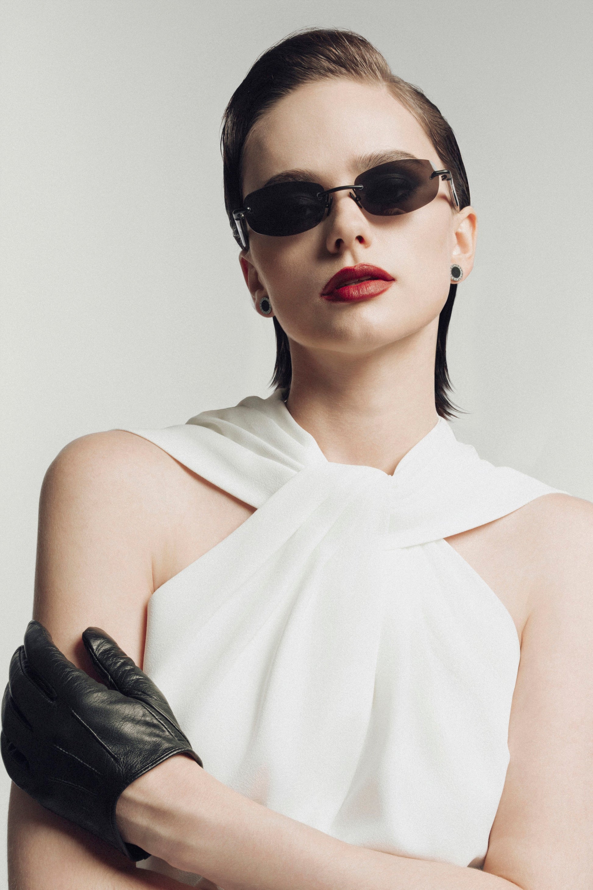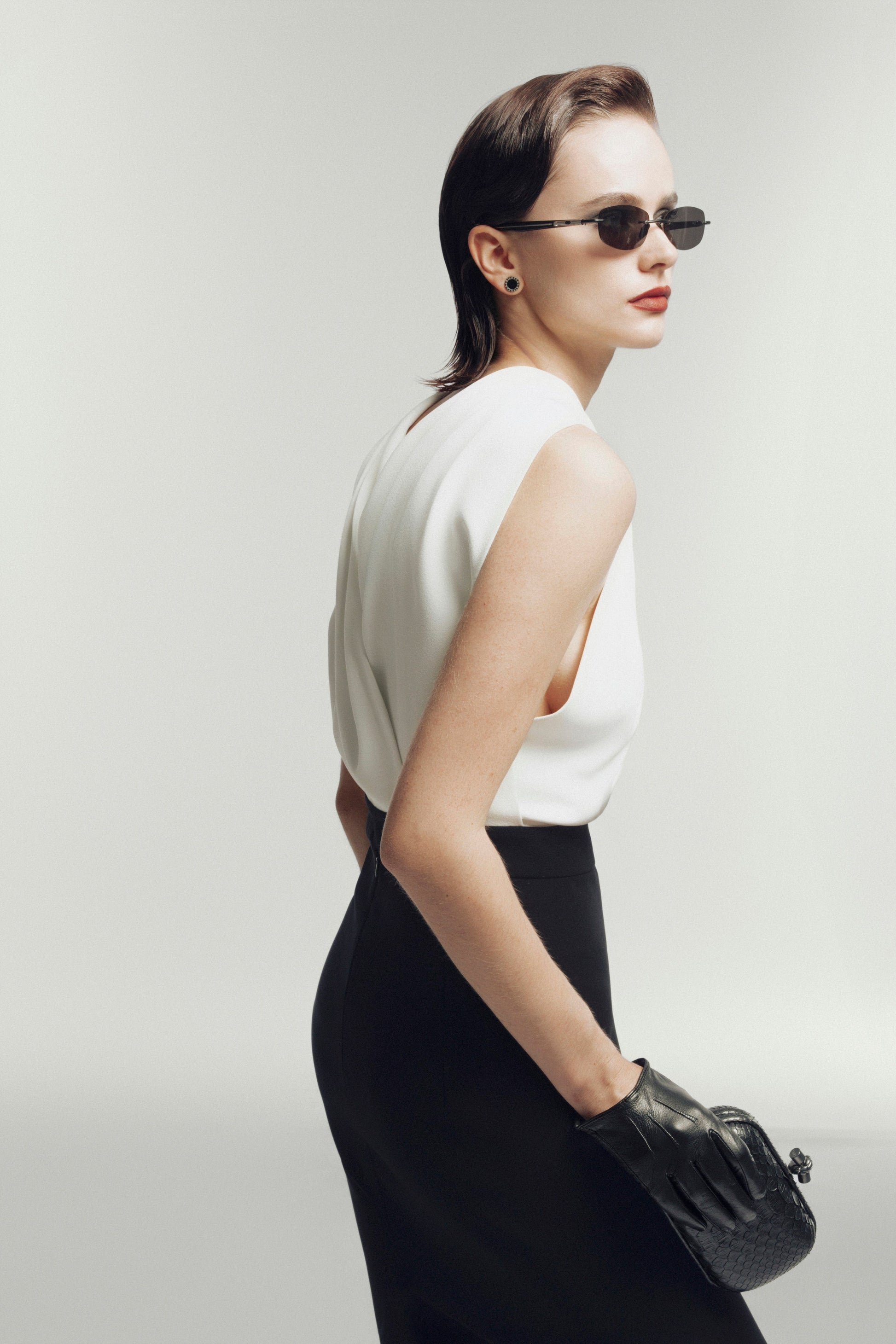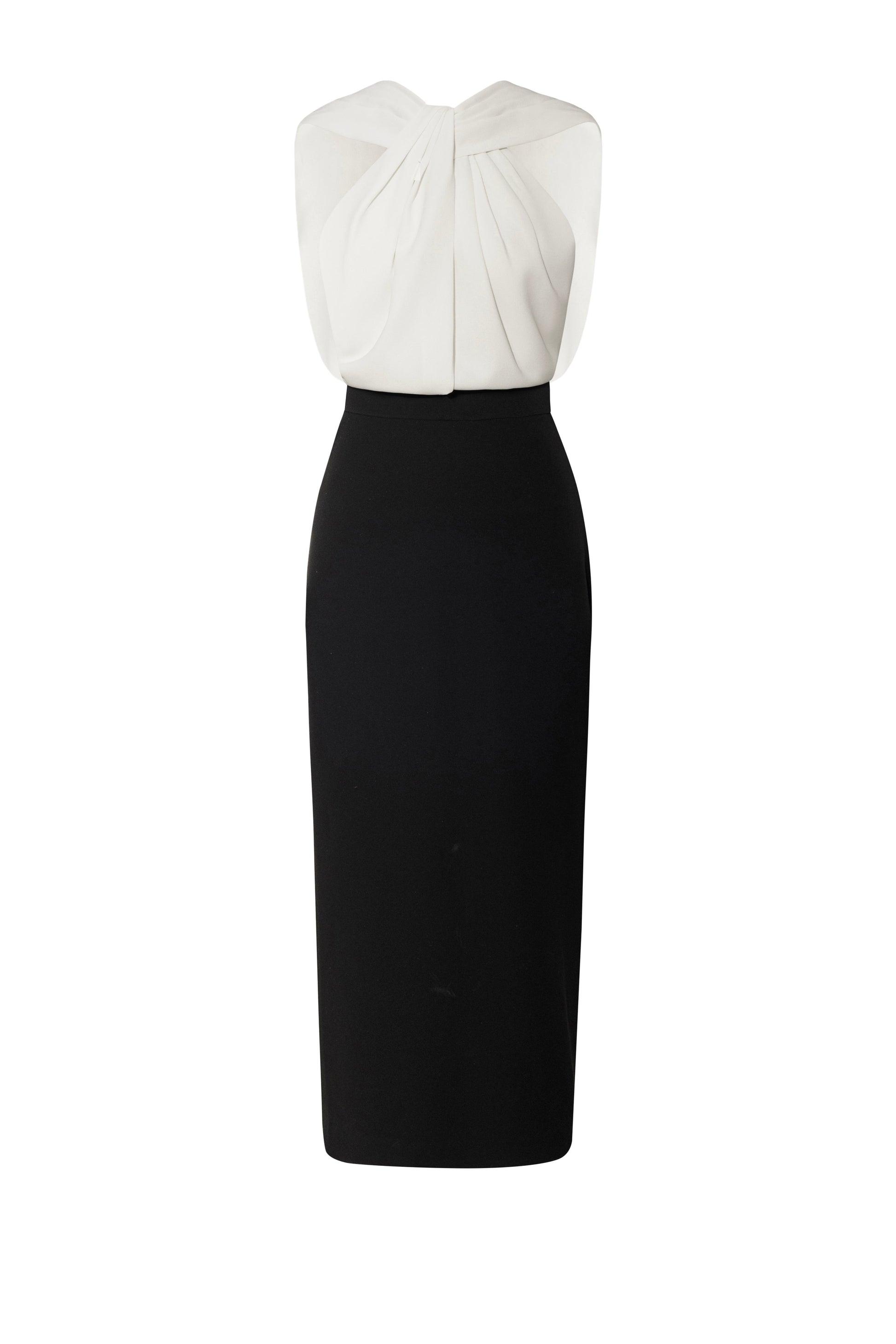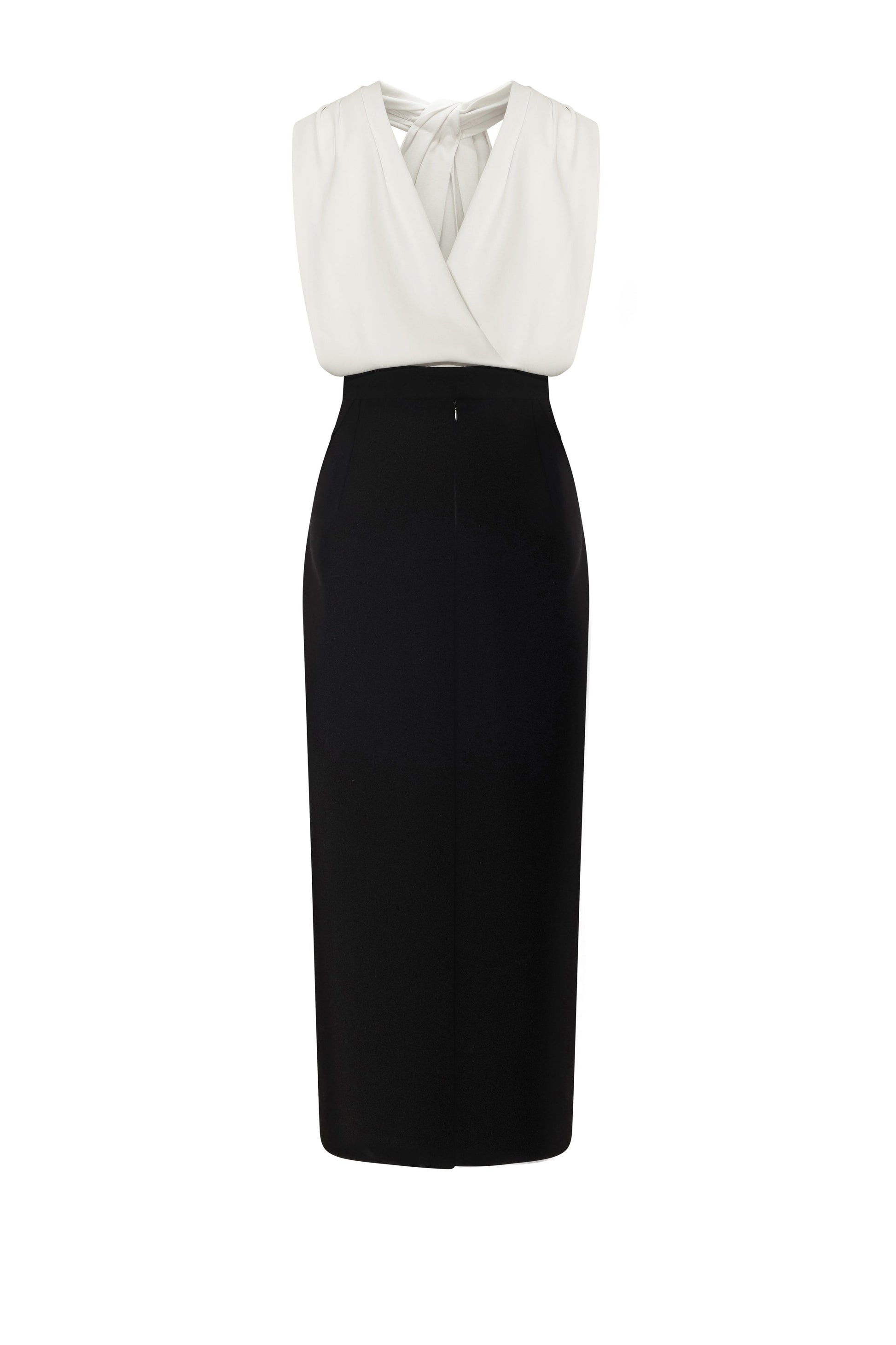Twist-neck pencil dress with a sculpted upper bodice that wraps across the front into a built-in strap connected to the back. Diagonal, deeply cut armholes enhance the front drape and create fluid movement. The upper back features pleats crossing over from the shoulders and fastening at the waistband with a hidden snap. The skirt has a defined waistband with four classic darts—two front, two back—for shaping. Finished with a concealed zipper at the back skirt and a rear vent for ease of movement.