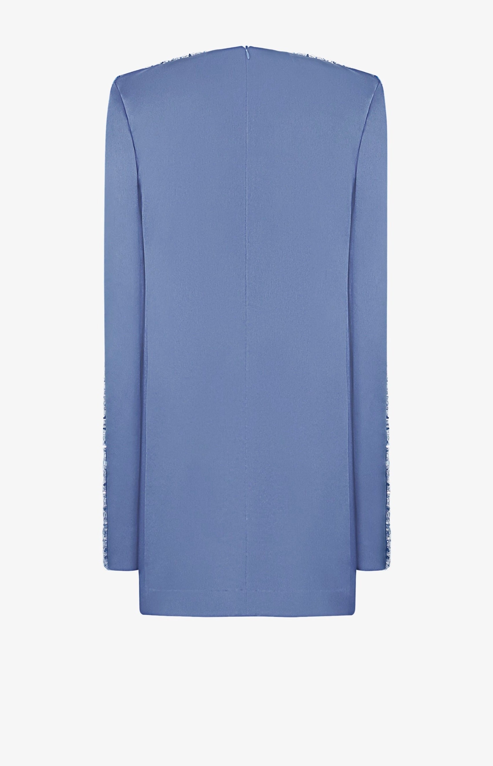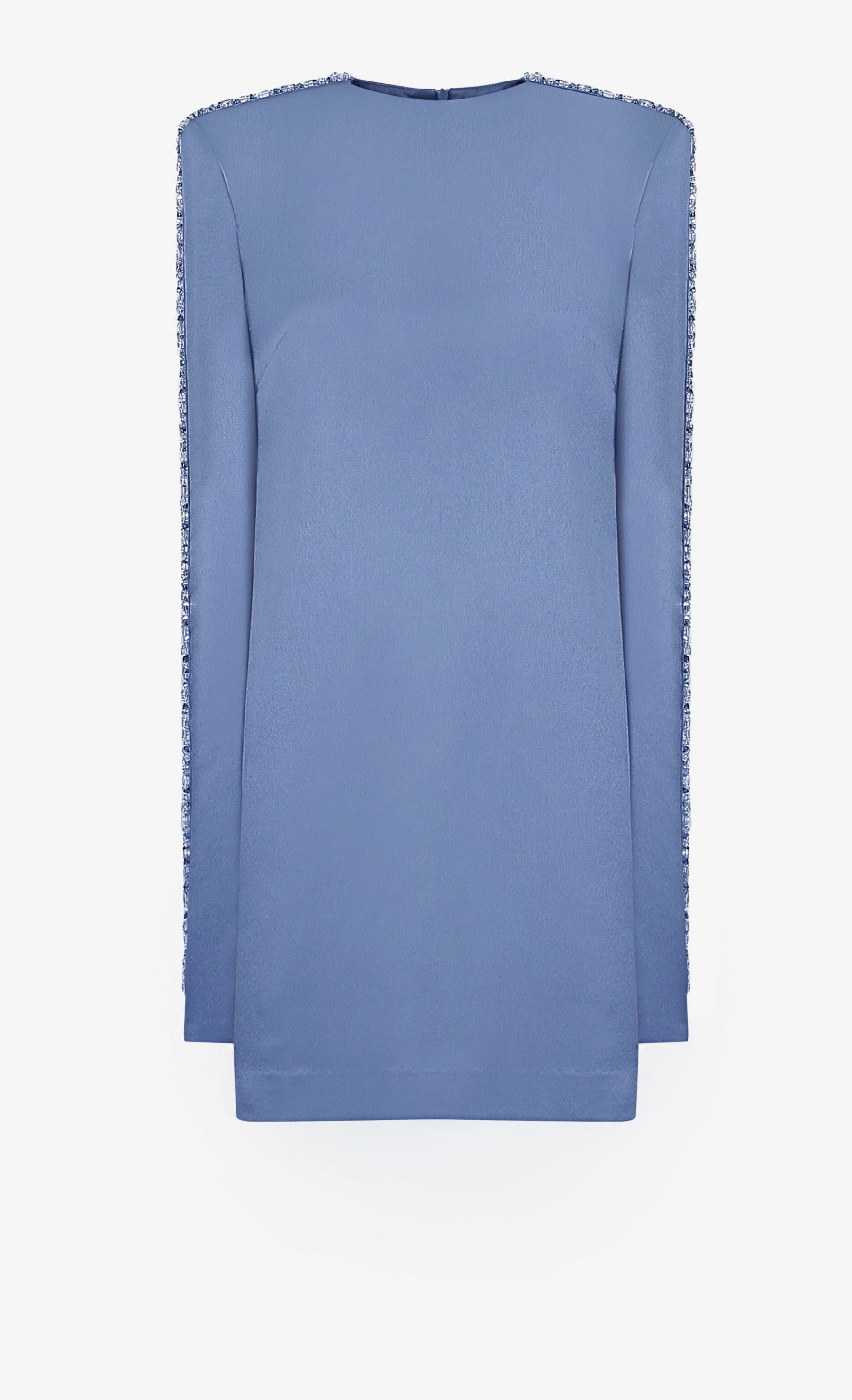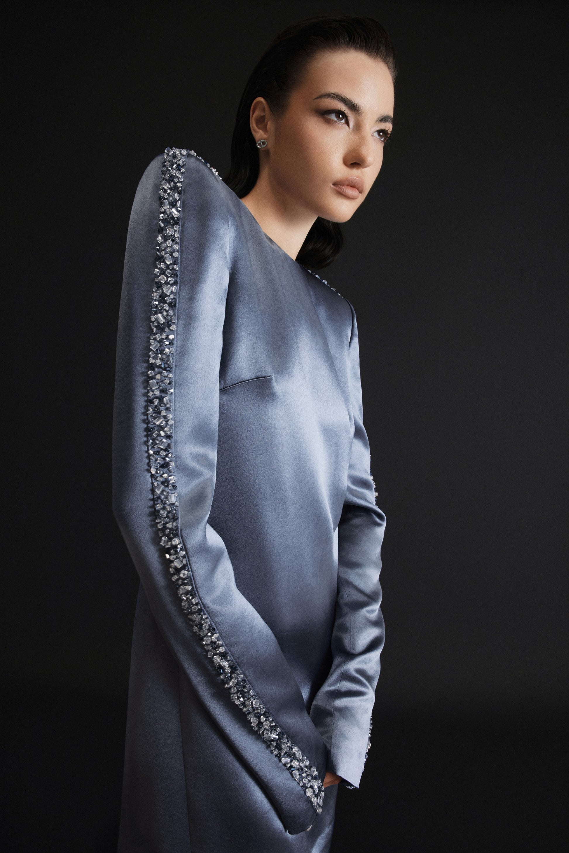Váy dài tay với vai vuông kèm đệm vai và cổ tròn. Chiều dài váy ngang đùi. Cổ tay dài che phủ qua ngón tay. Khóa giọt lệ giữa lưng sau. Váy được trang trí bằng kỹ thuật đính đá cao cấp trên miếng đáp chạy từ cổ áo đến cổ tay của chiếc váy.