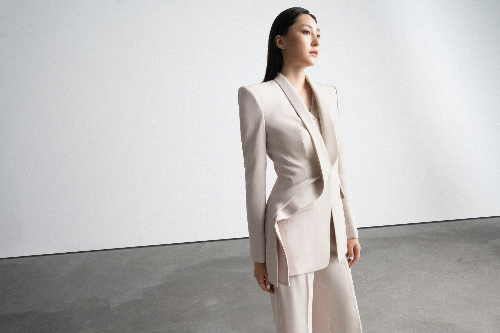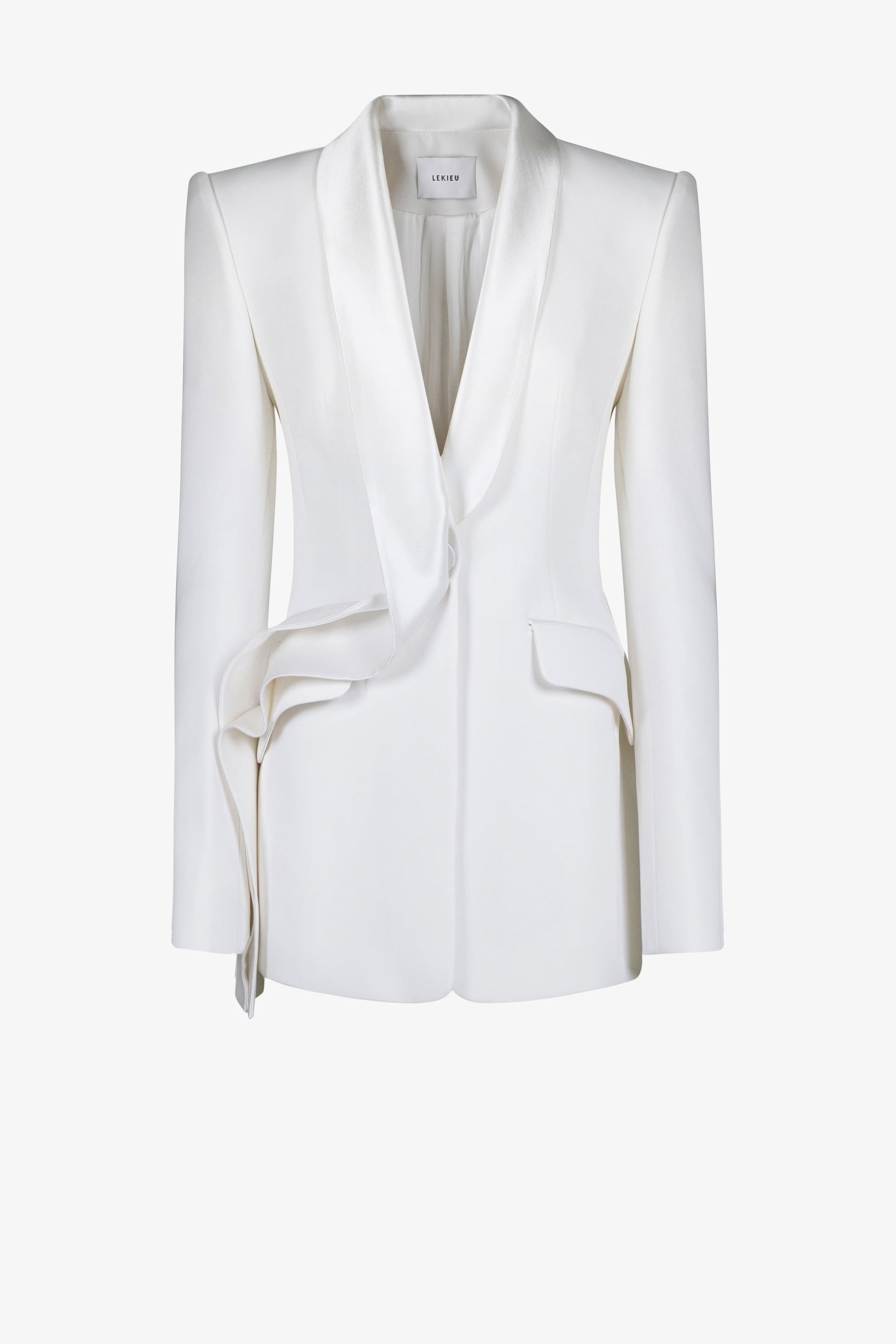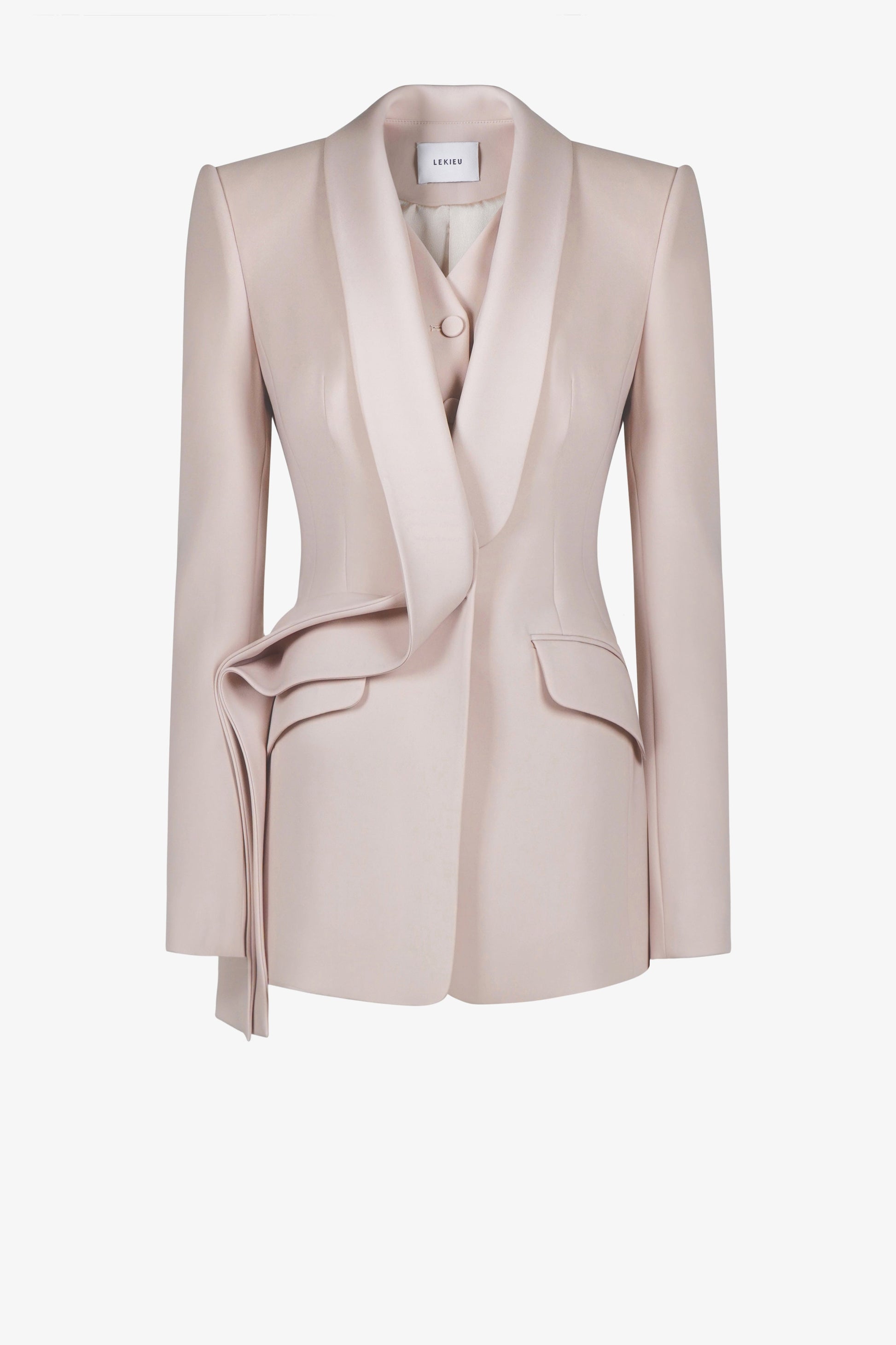 Với Darcey Jacket, LEKIEU sử dụng kỹ thuật Canvassed-suit đồng thời tạo điểm nhấn thị giác qua phần cổ sam liền thân trước và thiết kế áo 2 trong 1 lấy cảm hứng từ Double-breasted suit. Darcey Jacket tạo nên một vẻ đẹp đương đại, tinh giản của một người phụ nữ quyền lực.
