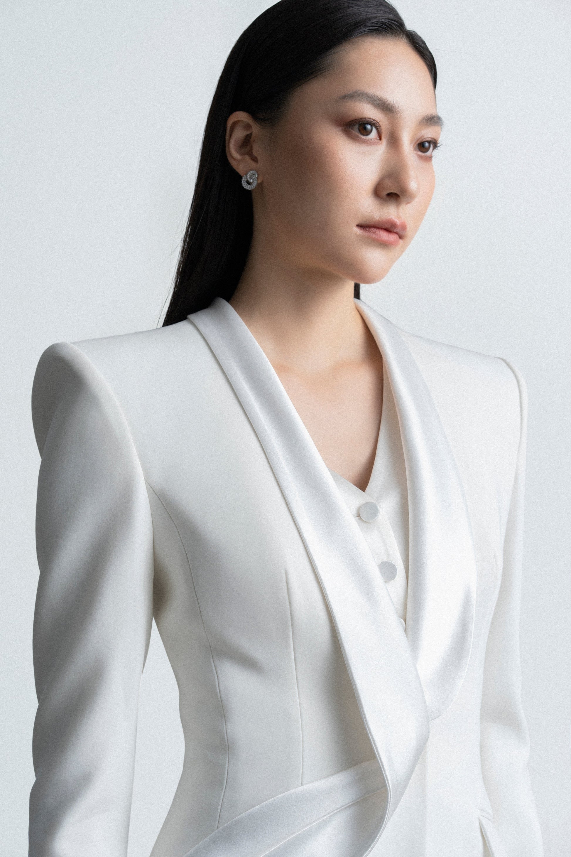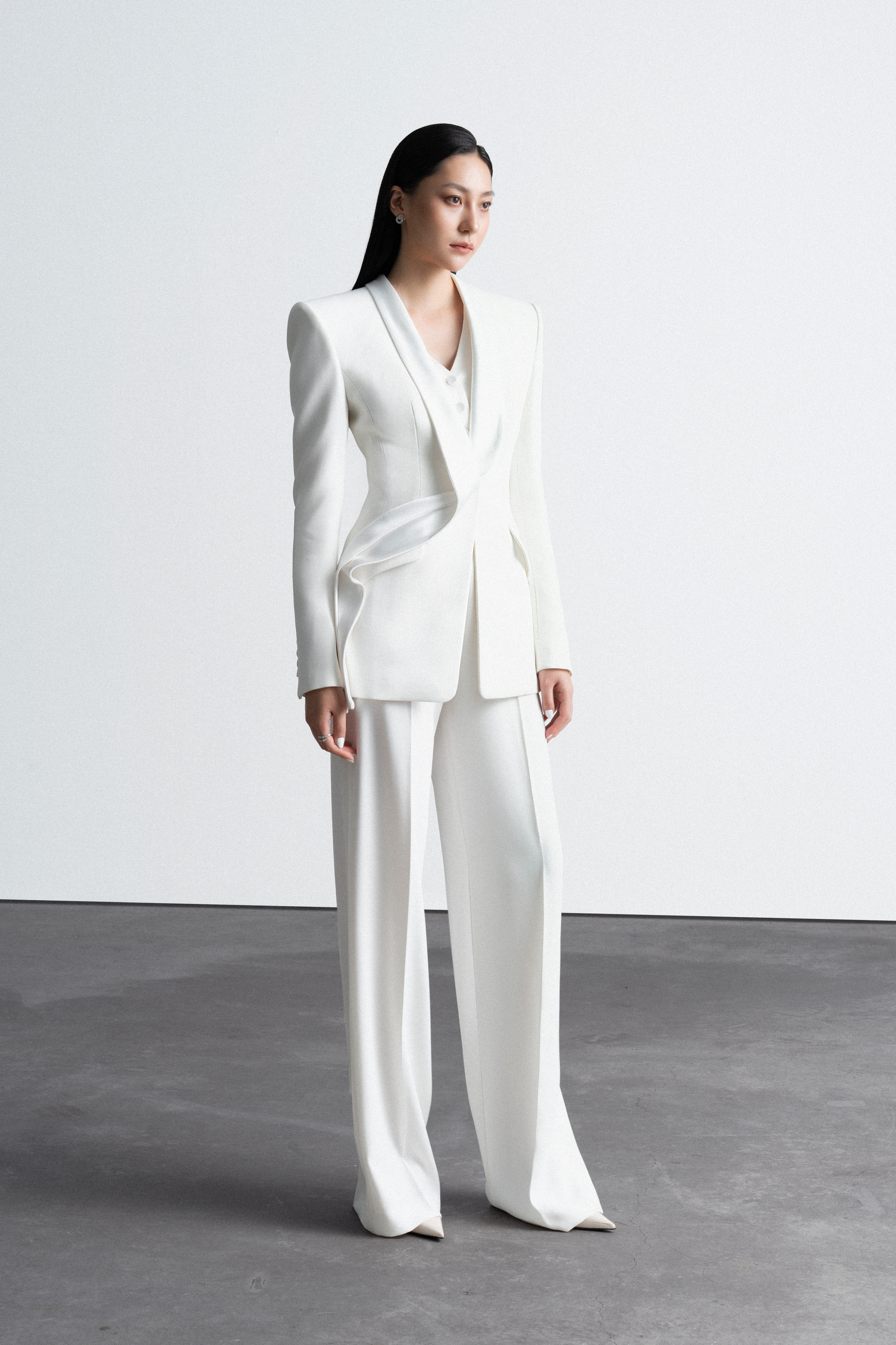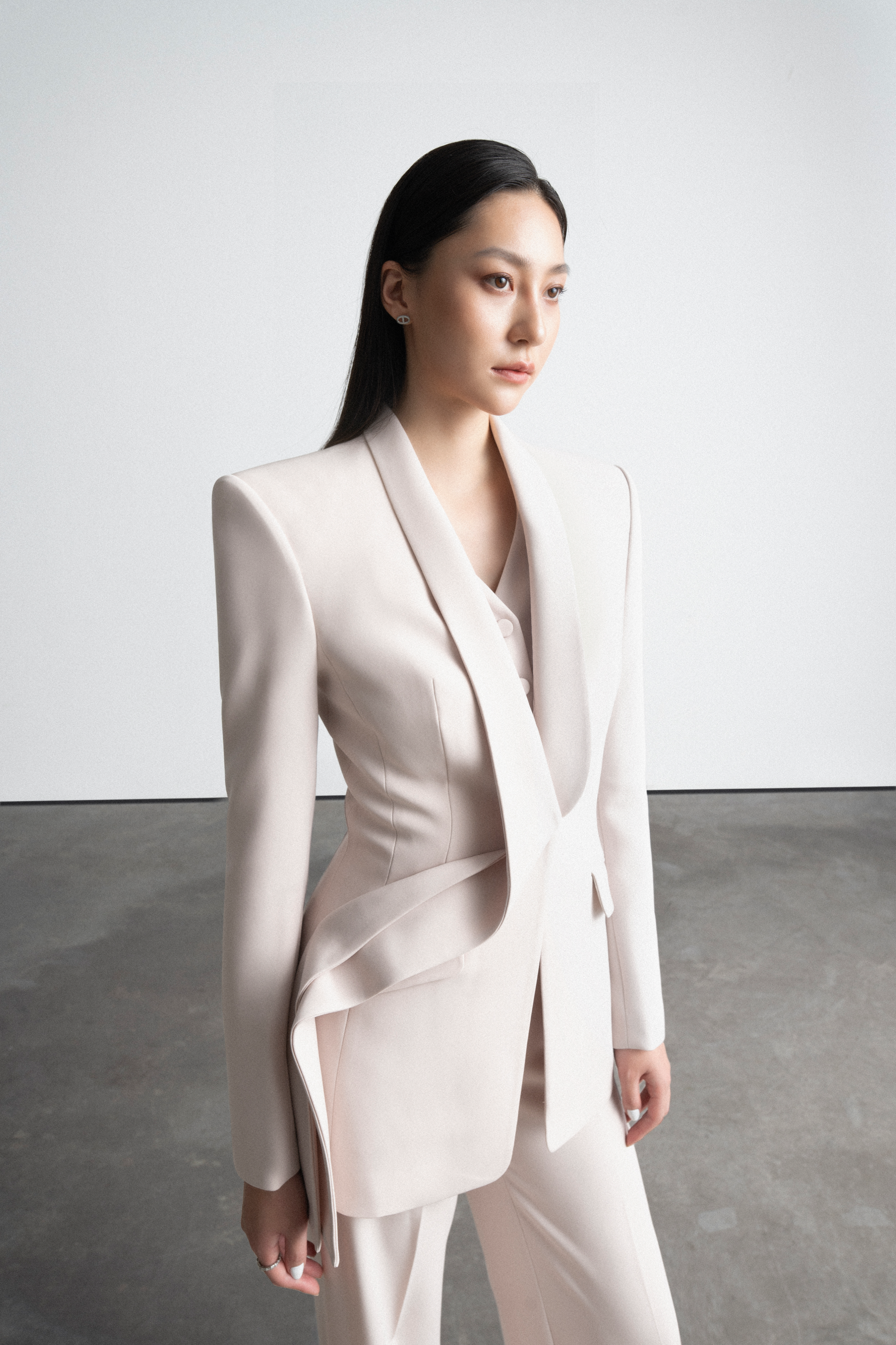 Áo Suit dáng ôm Single – breasted – 1 hàng khuy có 1 khuy, cổ sam vạt khăn được thiết kế bắt chéo, vạt gấp nếp cố định, tạo đường cong liền mạch nối dài từ thân sau qua cổ ra phía trước tạo điểm nhấn độc đáo cho cổ áo. Áo form dáng dài, ôm sát eo. Tay kiểu 2 mang may cá tay, đính cúc. Có 2 túi cơi có nắp chéo thân. Phần áo gile may liền với vest, có 1 hàng khuy gồm có 4 khuy.