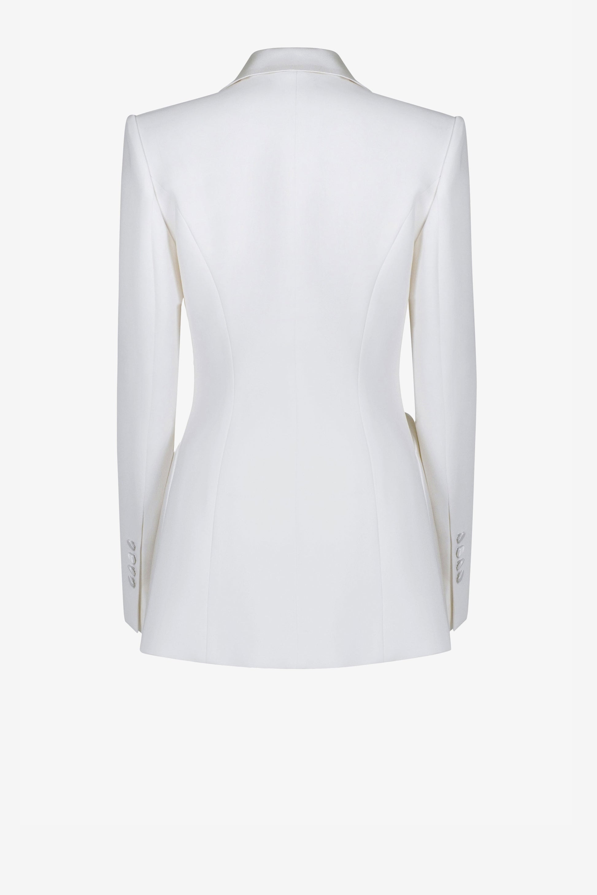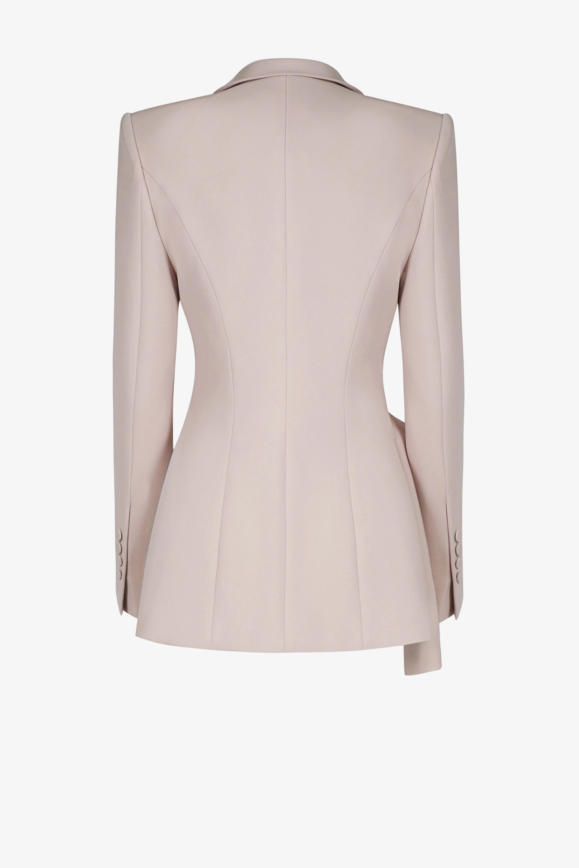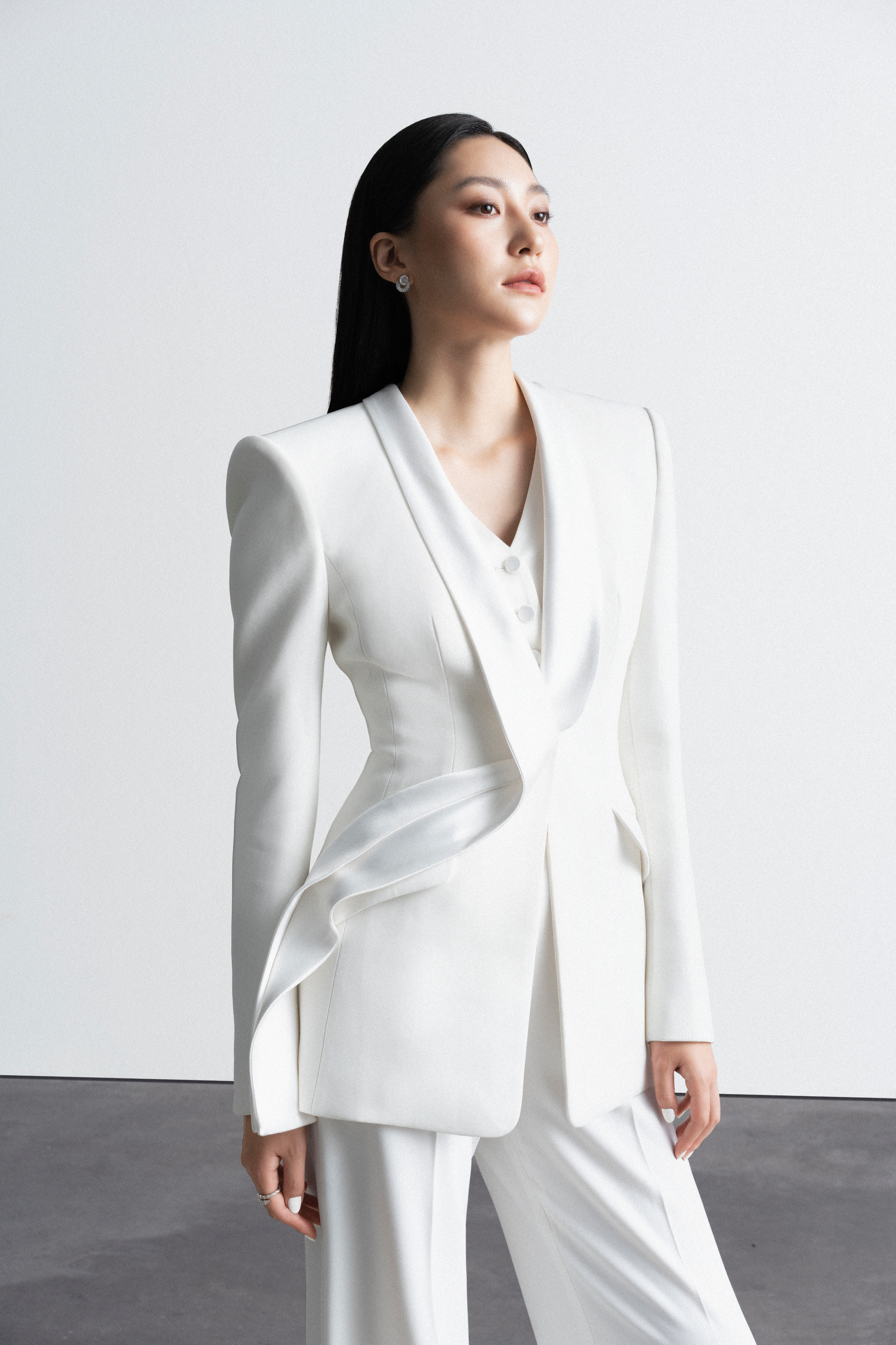 Áo Suit dáng ôm Single – breasted – 1 hàng khuy có 1 khuy, cổ sam vạt khăn được thiết kế bắt chéo, vạt gấp nếp cố định, tạo đường cong liền mạch nối dài từ thân sau qua cổ ra phía trước tạo điểm nhấn độc đáo cho cổ áo. Áo form dáng dài, ôm sát eo. Tay kiểu 2 mang may cá tay, đính cúc. Có 2 túi cơi có nắp chéo thân. Phần áo gile may liền với vest, có 1 hàng khuy gồm có 4 khuy.
