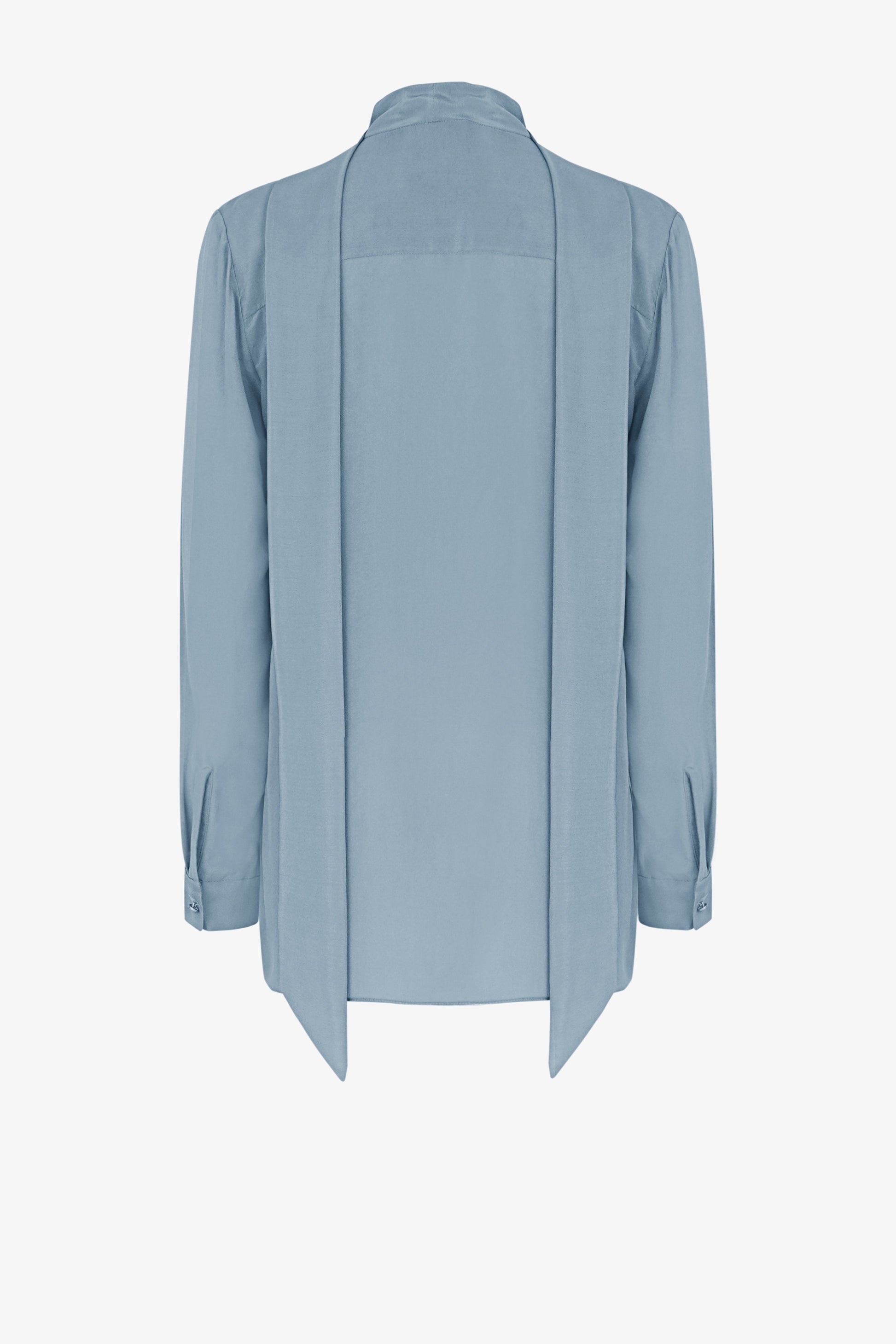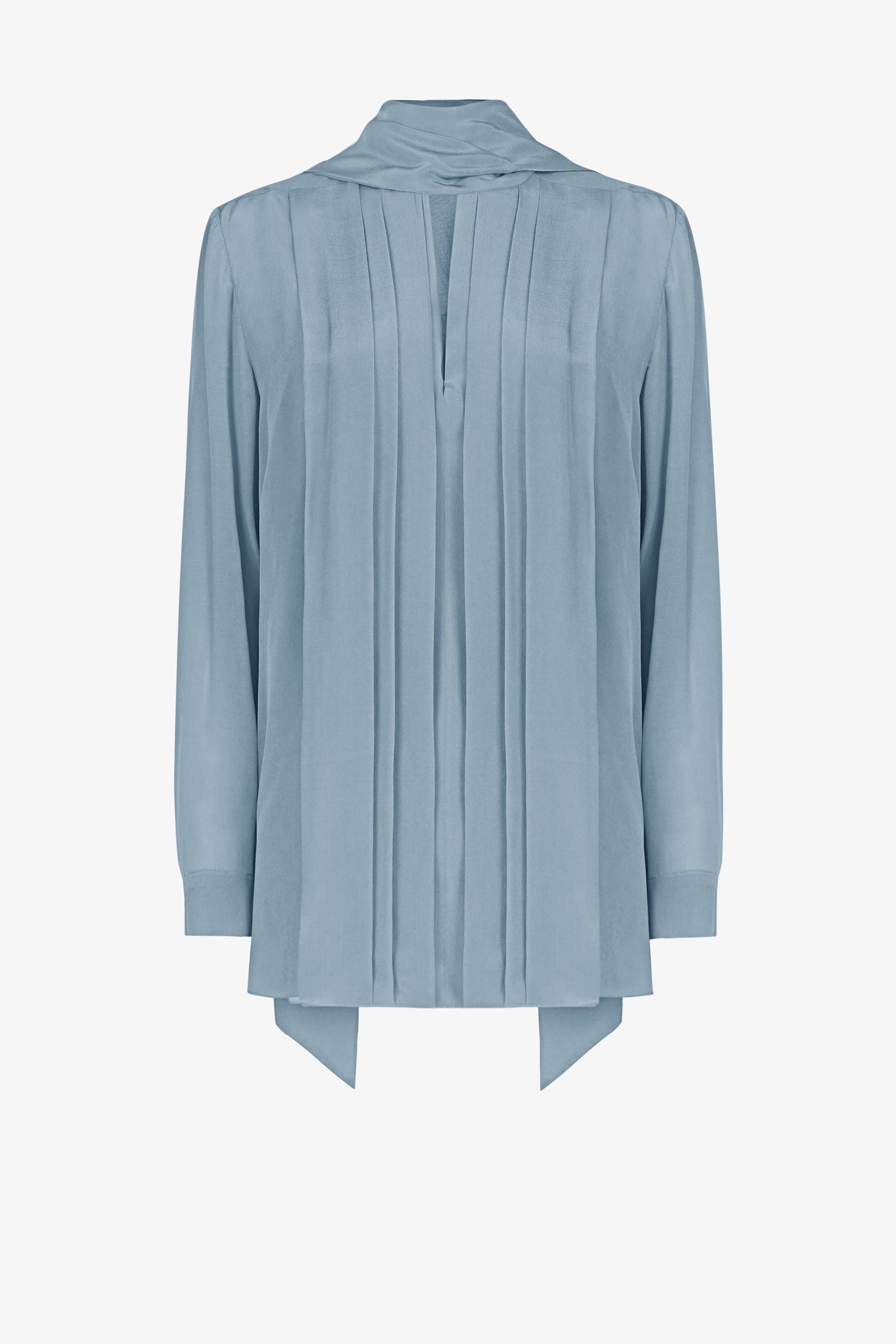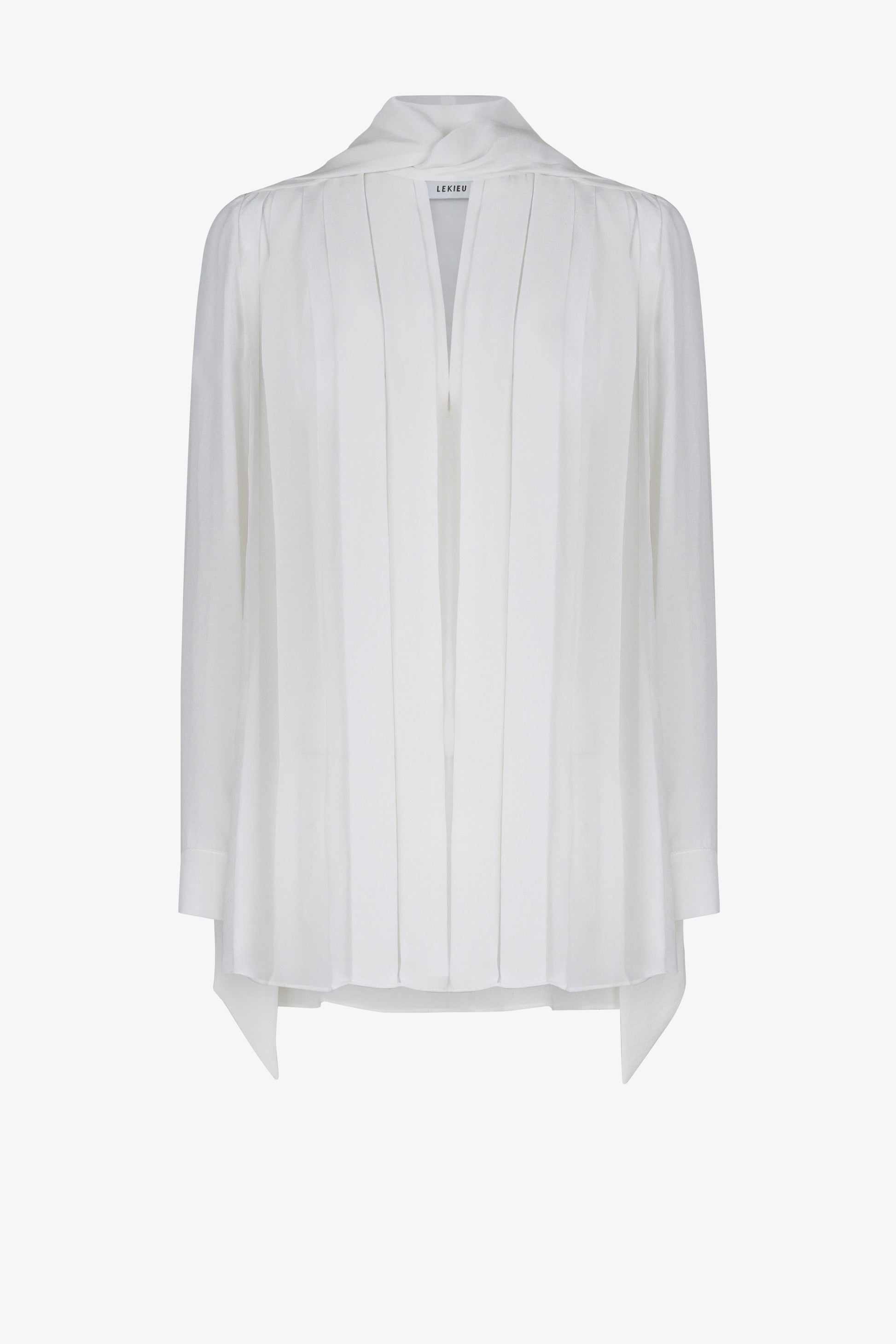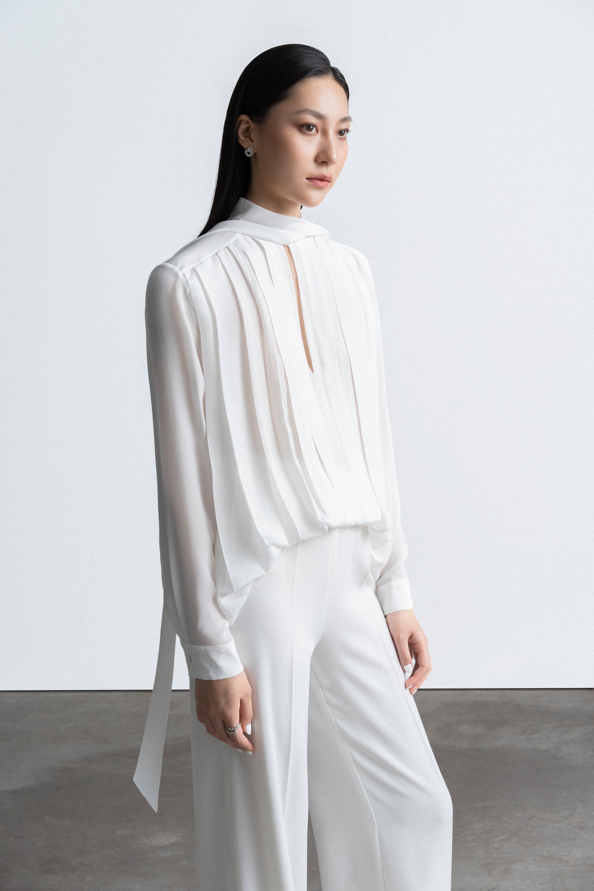 Áo có một dải khăn hình V, rộng 5cm, được vắt ngang qua vai. Phía trước của áo được xếp nếp theo các đường thẳng từ vai xuống đến mép dưới. Những đường xếp này có kích thước khác nhau. Giữa thân áo phối một lớp vải chiffon silk tạo cảm giác xuyên thấu quyến rũ. Tay áo là dạng tay bồng, rộng 5cm, có một khuy cài.