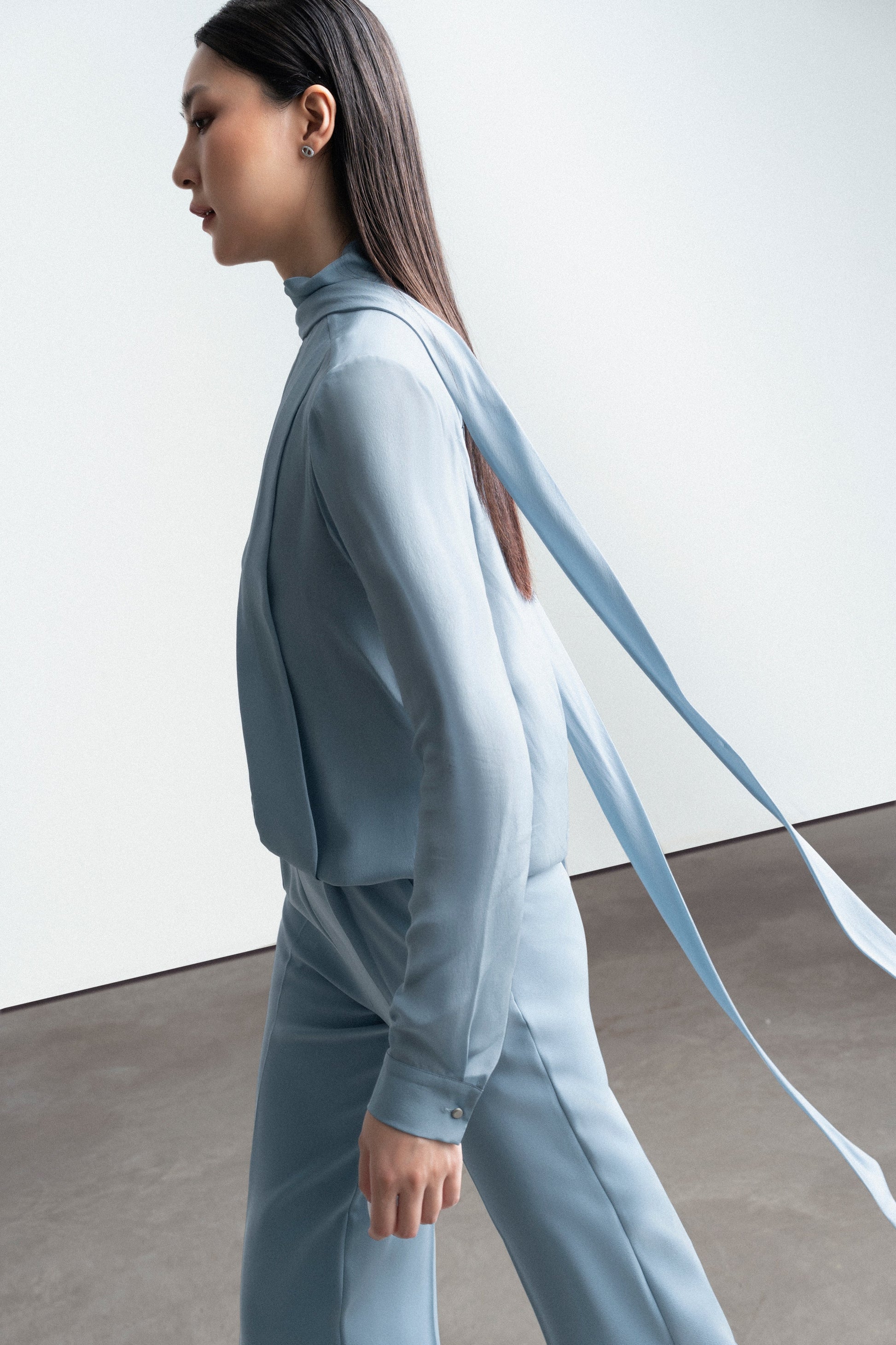 Bằng các đường xếp nếp ngẫu nhiên trên nền chất liệu silk cao cấp, Dixie Shirt kết hợp với quần suông rộng cùng tone đã thể hiện trọn vẹn tinh thần sang trọng, trang nhã của thương hiệu.