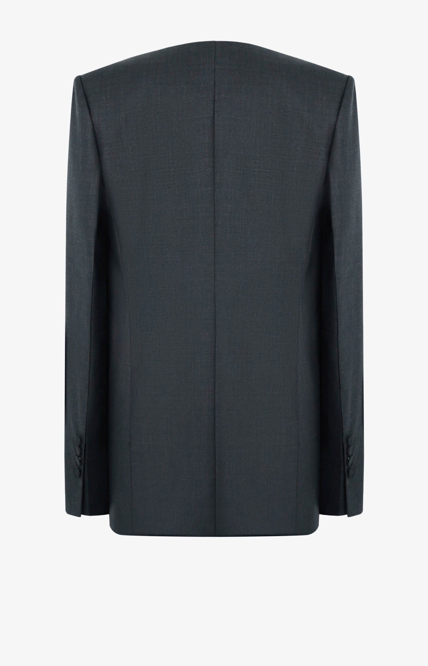 Áo khoác phom suông , bổ tại thân sườn, hai đường li phía trước mỗi thân áo, một túi ngực bên thân trái hai túi áo có nắp, có một nút áo. Tay áo hai mang có 4 cúc. Áo có đường may giữa lưng ở phía sau. Áo không cổ, thiết kế ve áo nhọn hiện đại cùng chi tiết thiết kế hình tam giác phối trắng ở phía thân trái.
