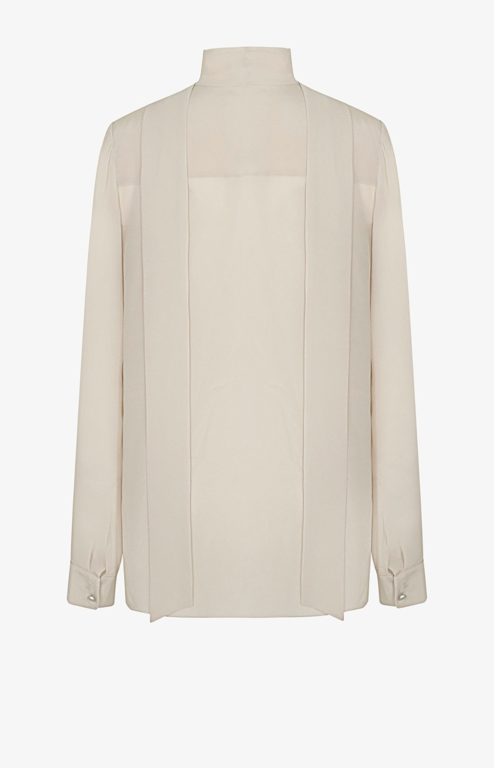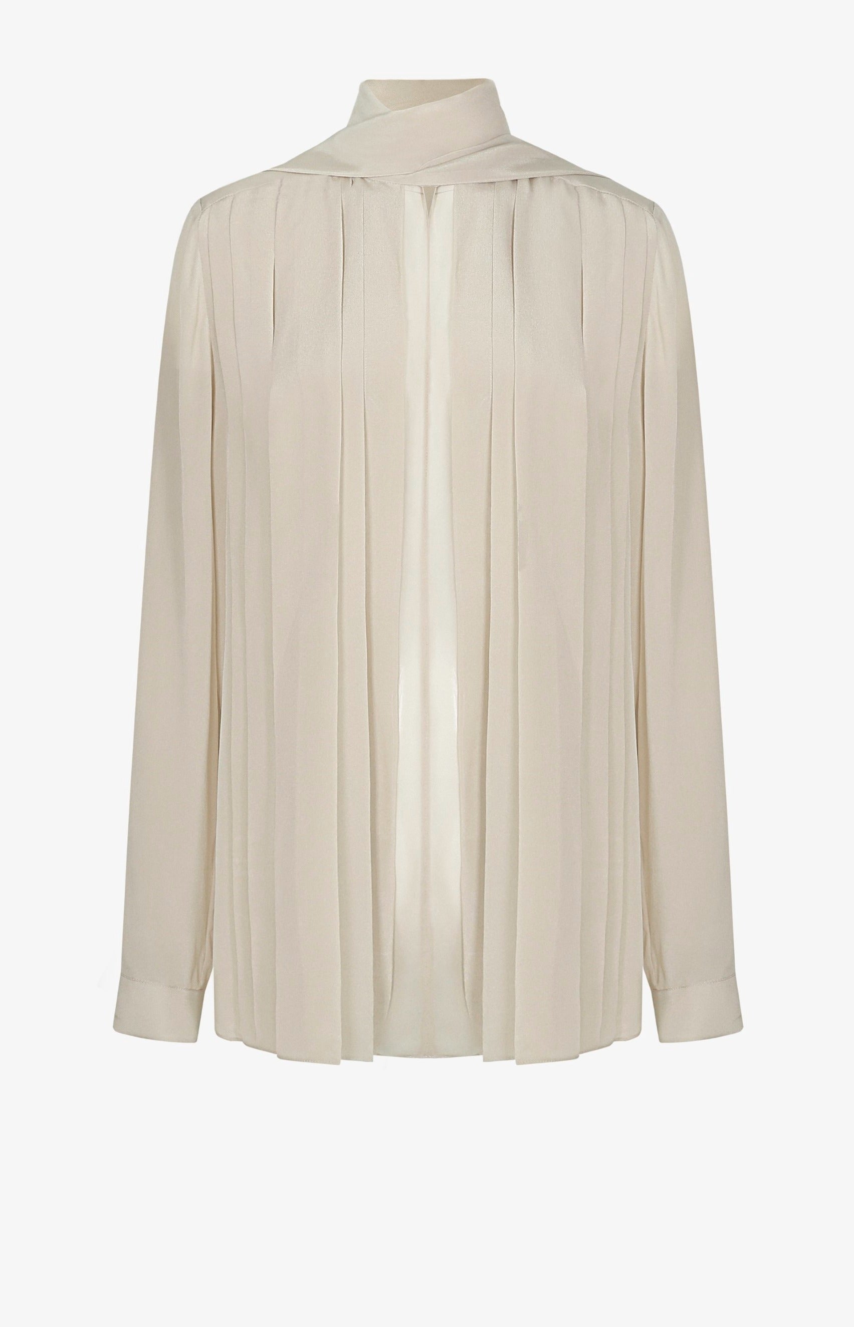Áo có một dải khăn hình V, rộng 5cm, được vắt ngang qua vai. Phía trước của áo được xếp nếp theo các đường thẳng từ vai xuống đến mép dưới. Những đường xếp này có kích thước khác nhau. Giữa thân áo phối hai chiffon tạo cảm giác xuyên thấu quyến rũ. Tay áo là dạng tay bồng, rộng 5cm, có một khuy cài.