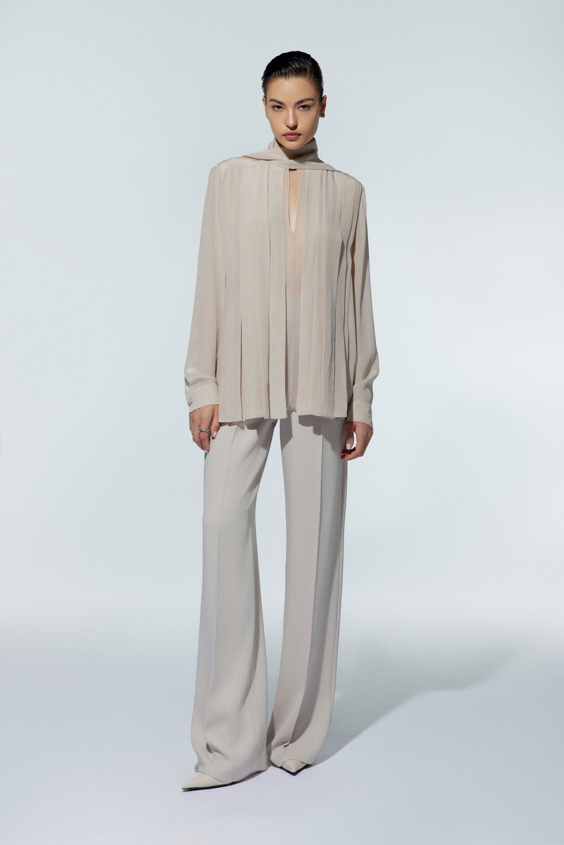 Những đường gấp nếp ngẫu hứng trên nền chất liệu Chiffon không-trọng-lượng tạo hiệu ứng xuyên thấu gợi cảm, đại diện cho tuyên ngôn của tính nữ thời hiện đại. LEKIEU gợi ý bản phối cùng quần ống suông hoàn thiện tổng thể trang phục thêm phần thanh lịch và trang nhã.