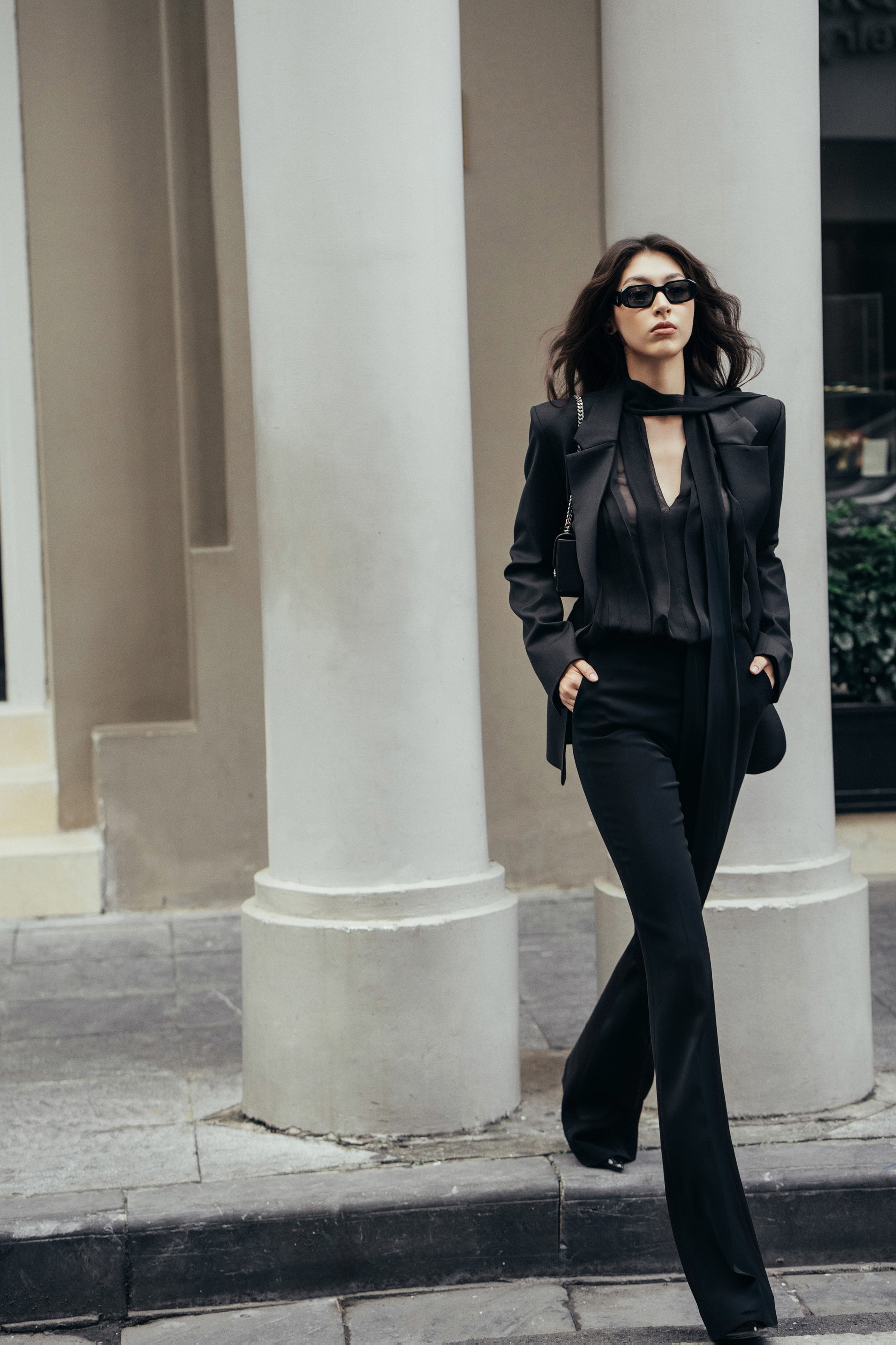 Áo có một dải khăn hình V, rộng 5cm, được vắt ngang qua vai. Phía trước của áo được xếp nếp theo các đường thẳng từ vai xuống đến mép dưới. Những đường xếp này có kích thước khác nhau. giữa thân áo phối hai chiffon tạo cảm giác xuyên thấu quyến rũ