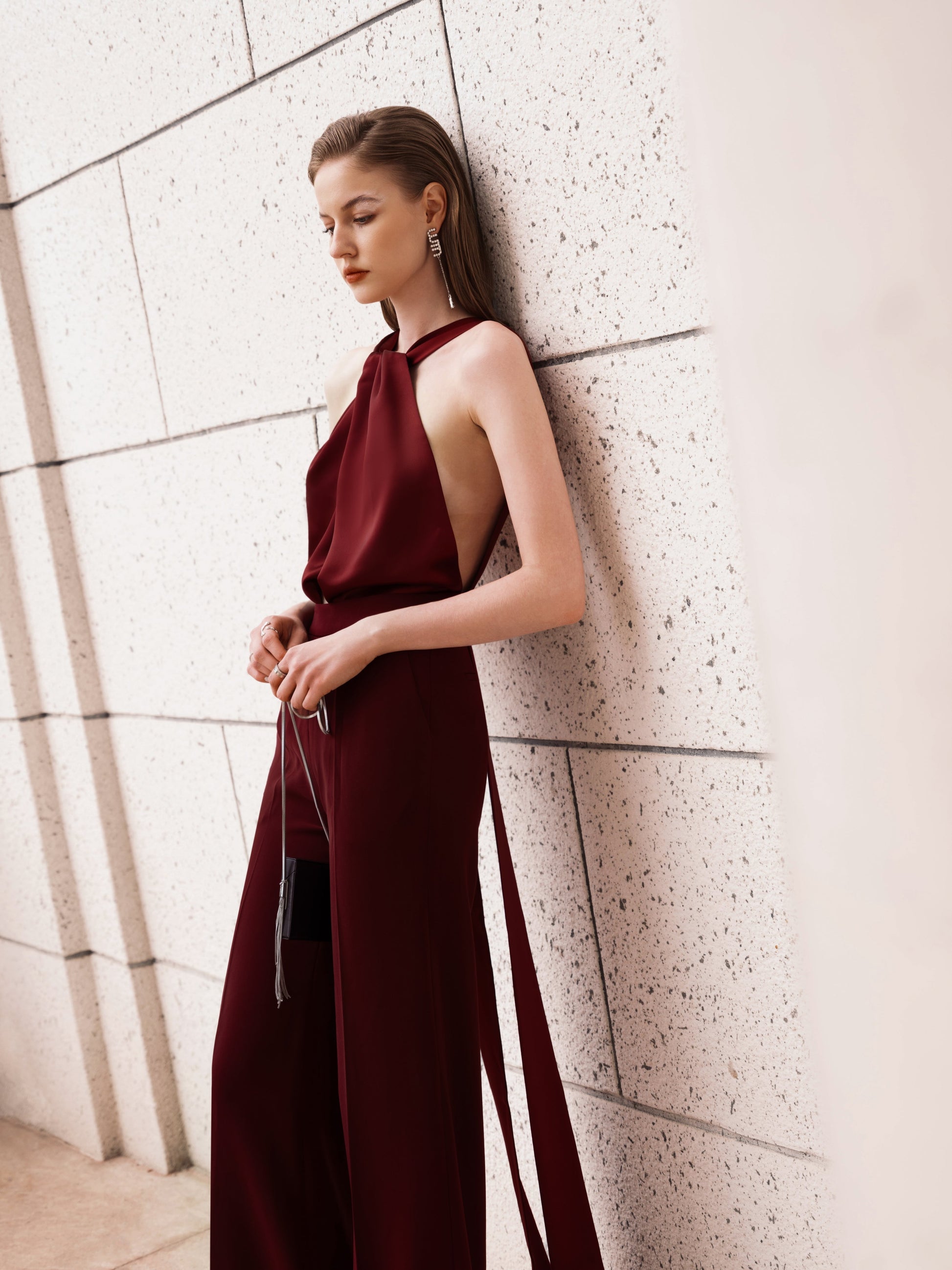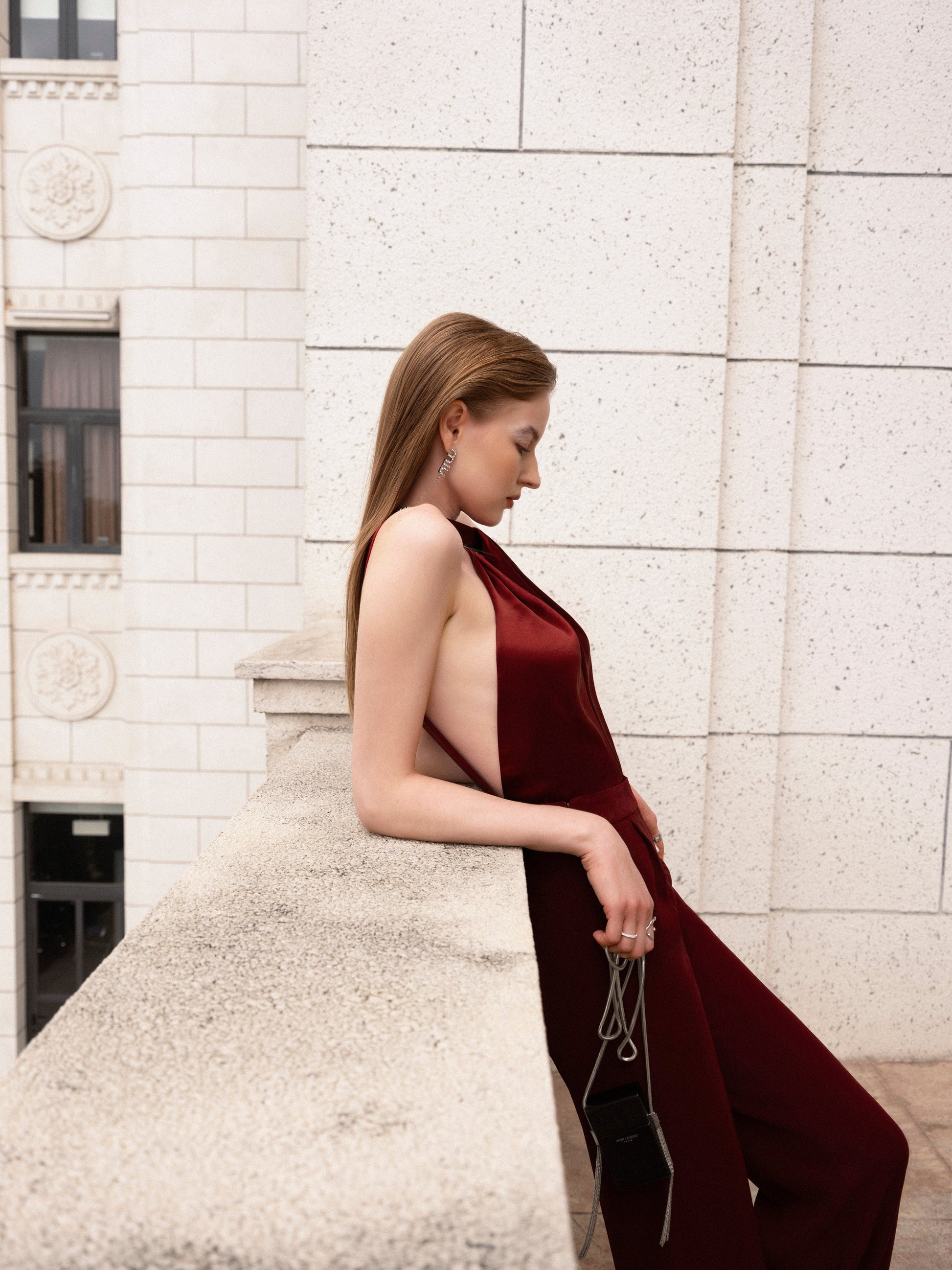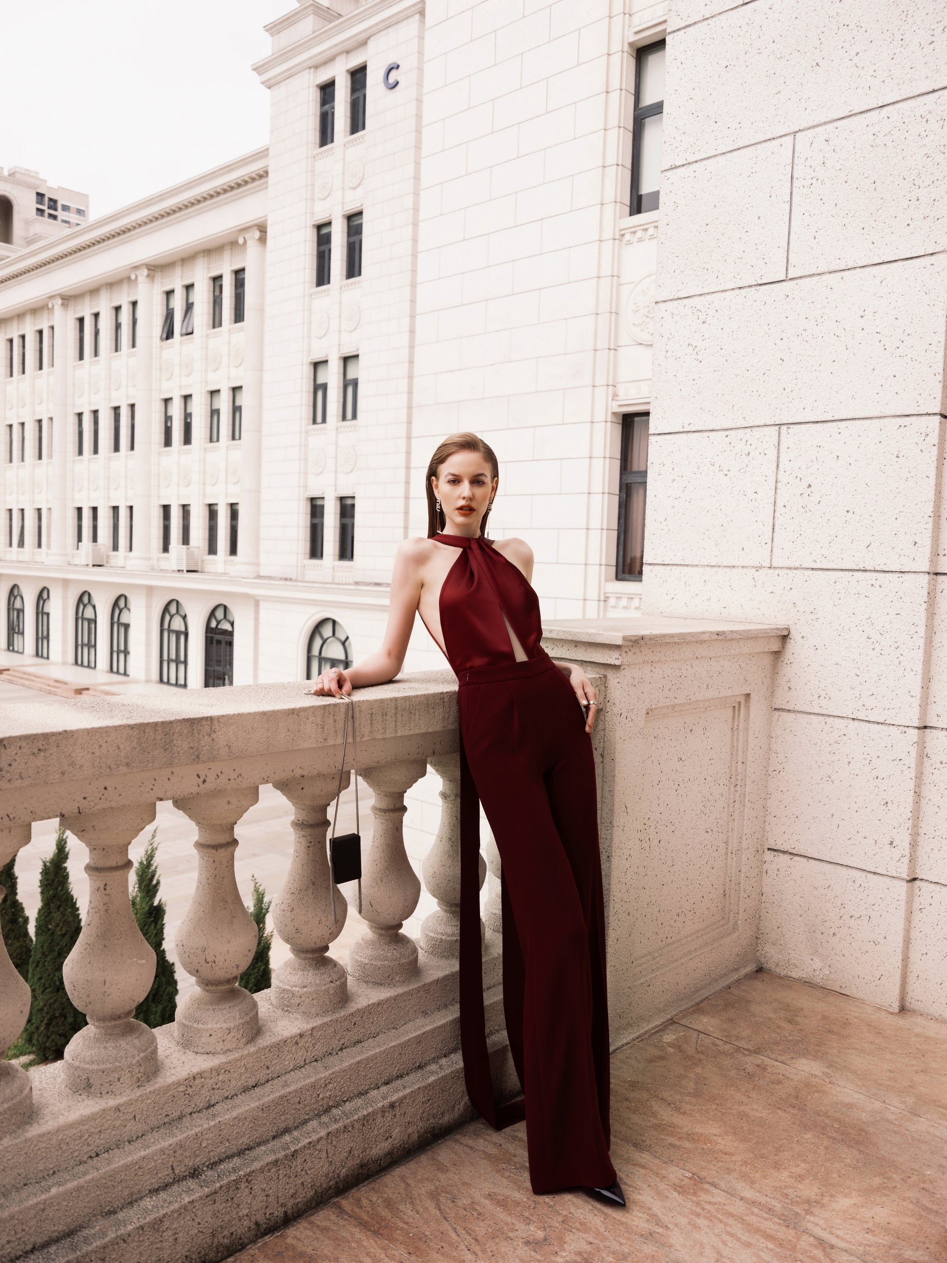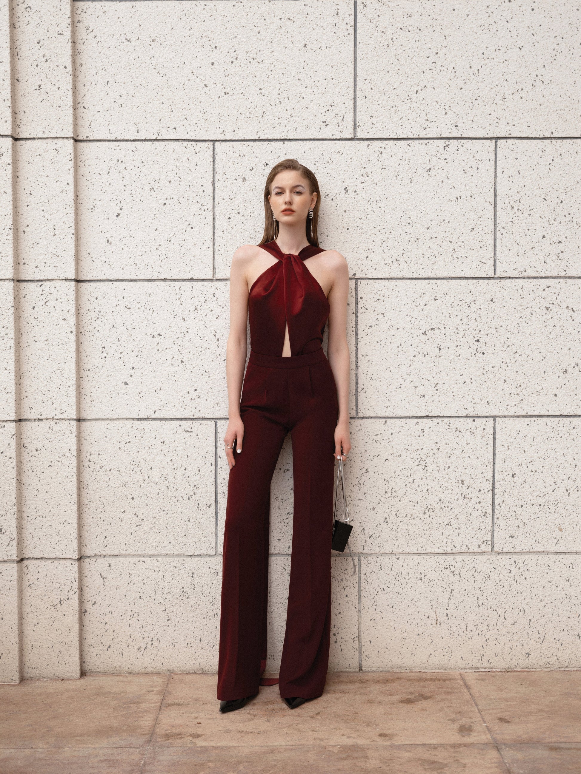 Delphia Jumpsuit được sáng tạo trên nền silk cao cấp, với chi tiết cổ yếm khoe trọn bờ vai mảnh khảnh và những đường cong ẩn hiện. Trong tone màu Wine, thiết kế với phần vạt dài tạo điểm nhấn khiến tổng thể trang phục càng thêm phần sang trọng và thanh lịch.