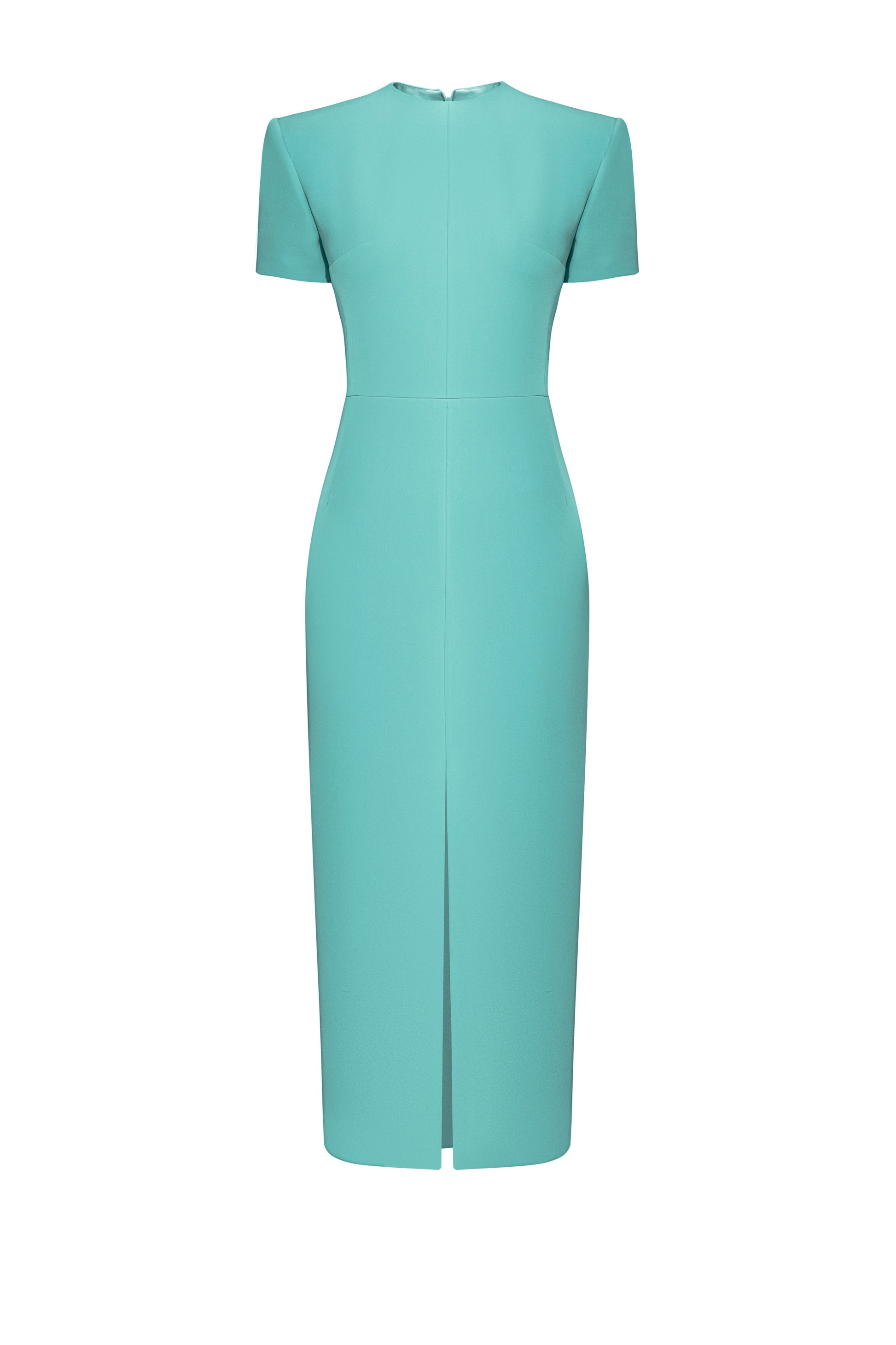 Short-sleeve pencil dress with a round neckline and structured shoulders with light padding. Side-seam bodice with side panels and princess darts, defined waist seam. Front features a center seam from neckline to slit, ending in a front vent for ease of movement. Back includes double darts at both upper and lower sections with a concealed side zipper.