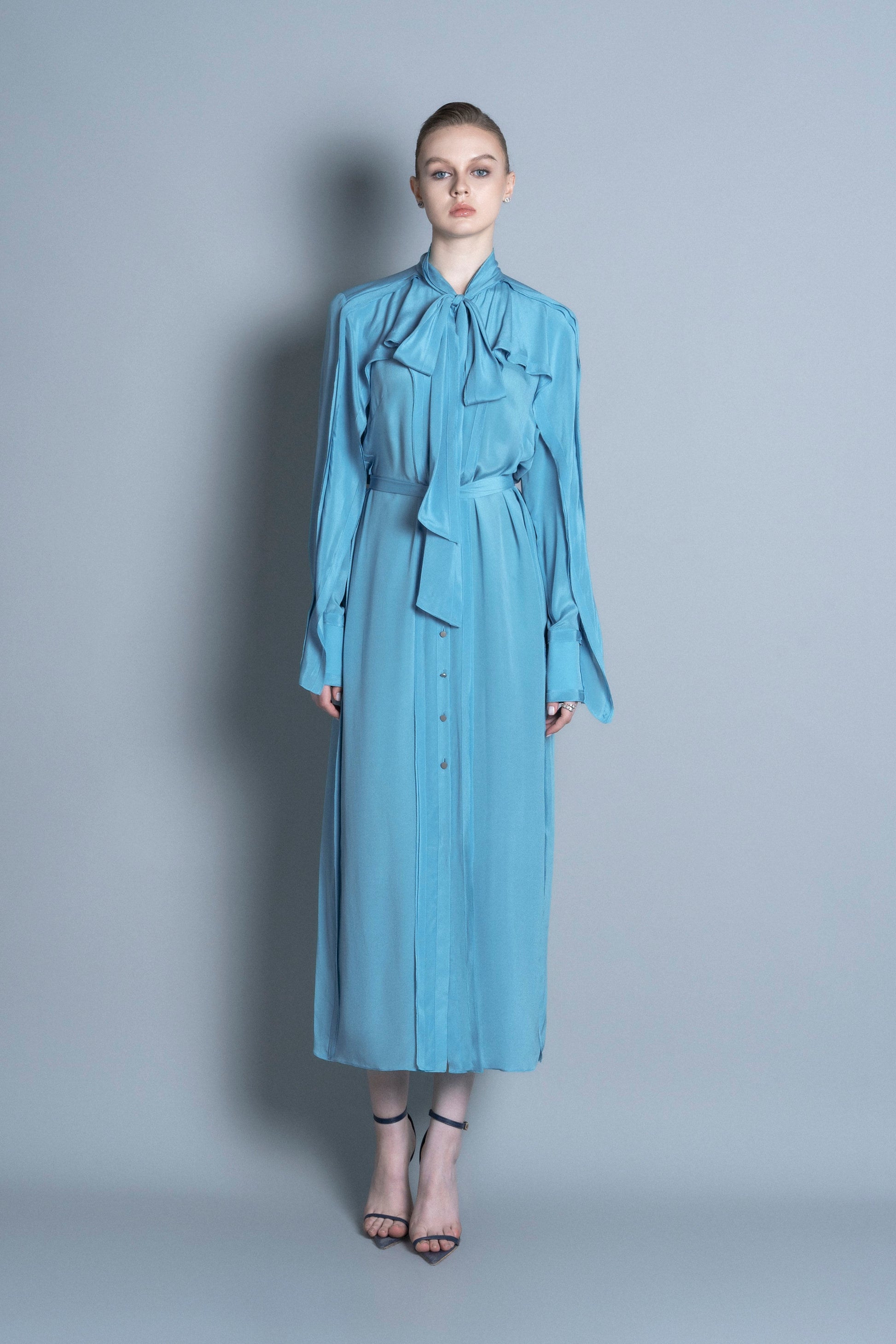 The long-sleeved shirt dress is made from soft, drapey fabric. It has a round neckline with a long tie made of fabric cut on the bias, creating a fringe effect, which can be tied or draped over the shoulder. The neckline extends down to the shoulder and is finished with a seam, adorned with a large ruffle, and decorated with two strips of fabric cut on the bias. The button placket runs down to the hem, and the waist tie is sewn in the back. When tied, it adjusts the gathering at the waist, allowing for customization based on preference.