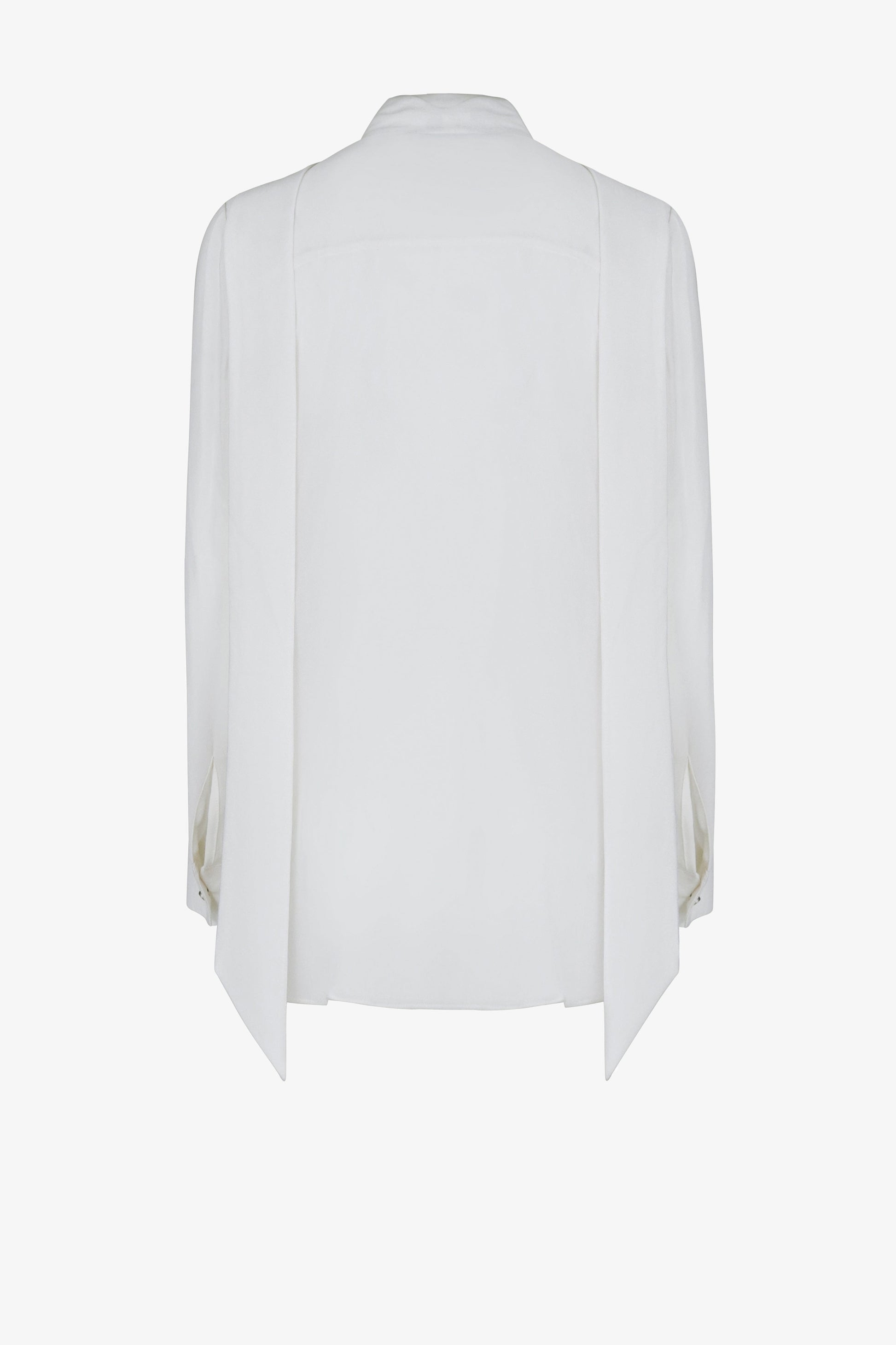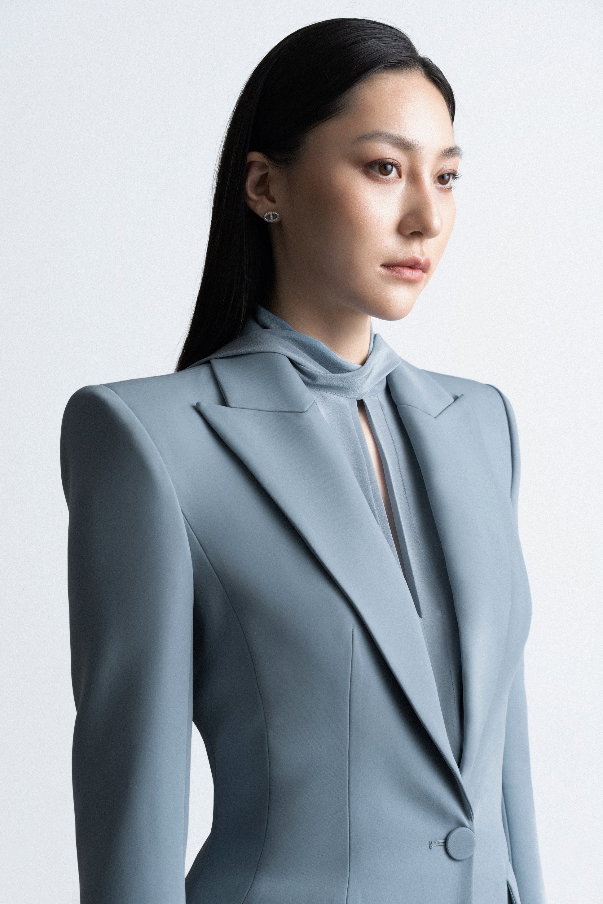 Áo có một dải khăn hình V, rộng 5cm, được vắt ngang qua vai. Phía trước của áo được xếp nếp theo các đường thẳng từ vai xuống đến mép dưới. Những đường xếp này có kích thước khác nhau. Giữa thân áo phối một lớp vải chiffon silk tạo cảm giác xuyên thấu quyến rũ. Tay áo là dạng tay bồng, rộng 5cm, có một khuy cài.