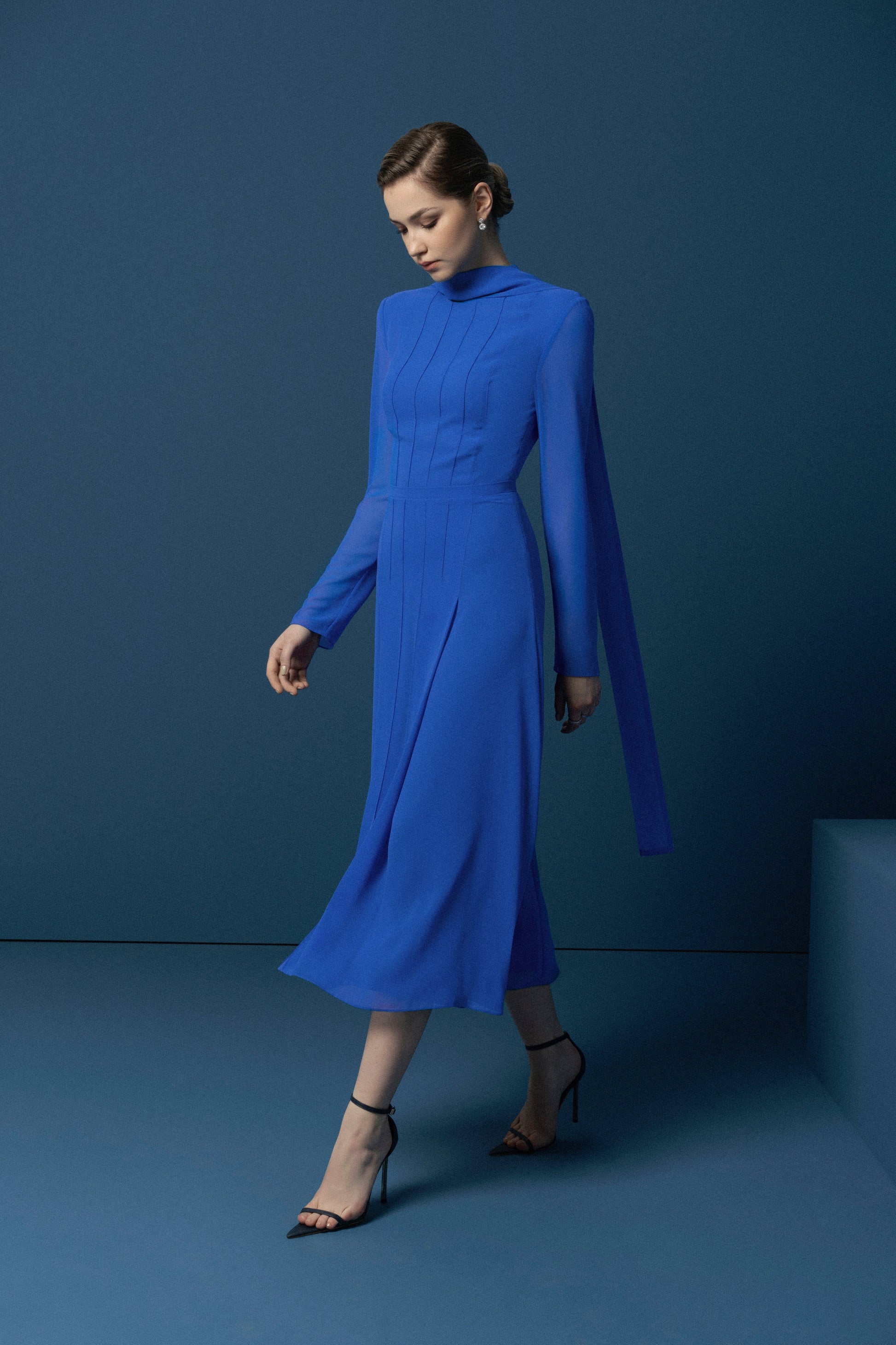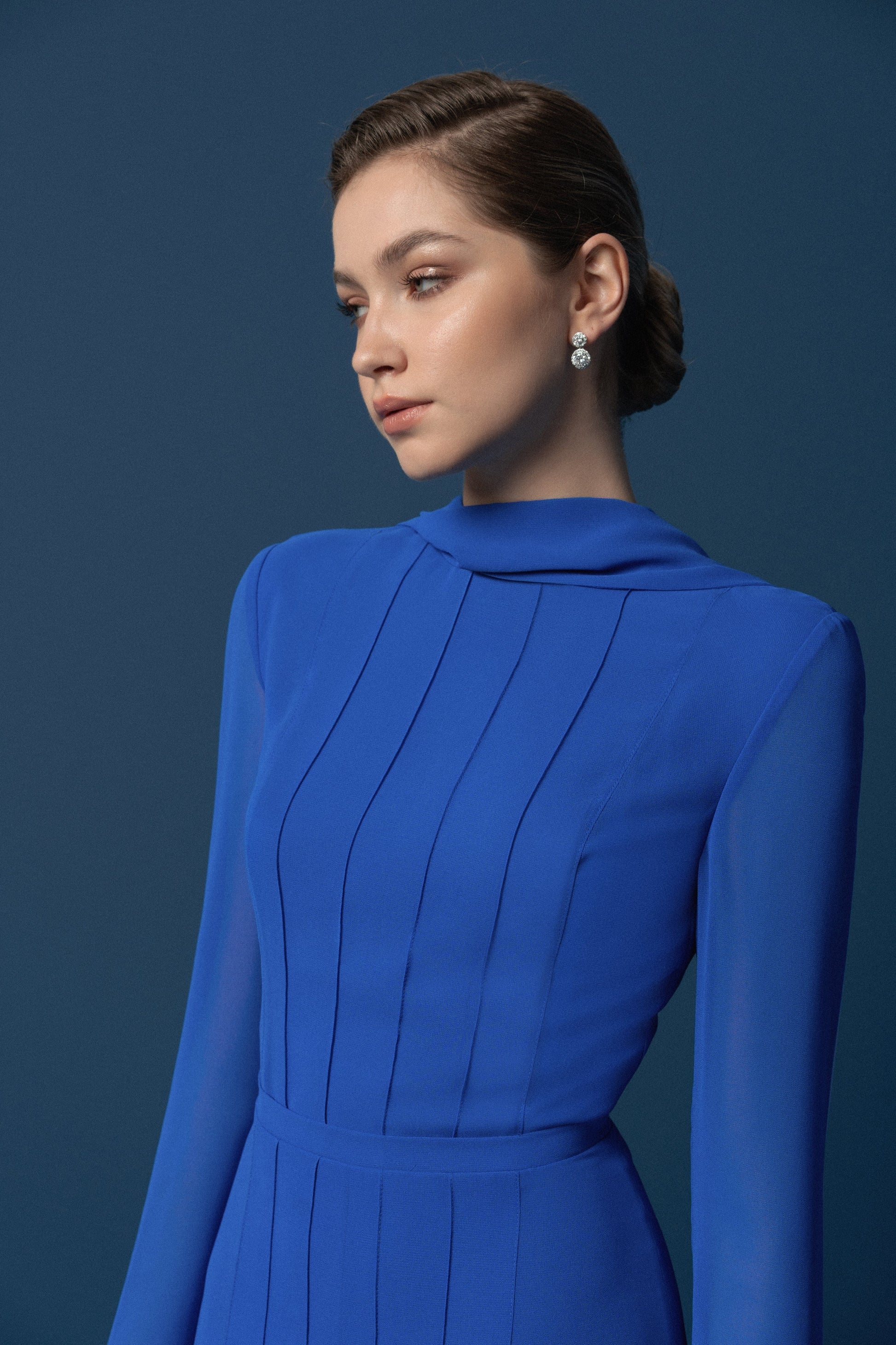 Doris Dress là biểu tượng của sự thanh lịch bởi chất liệu cao cấp và những chi tiết hoàn thiện tinh tế, những đường xếp nếp ly được tính toán kỹ lưỡng tạo điểm nhấn thị giác kết hợp trên nền màu xanh mê hoặc tạo vẻ thanh thoát cho trang phục.