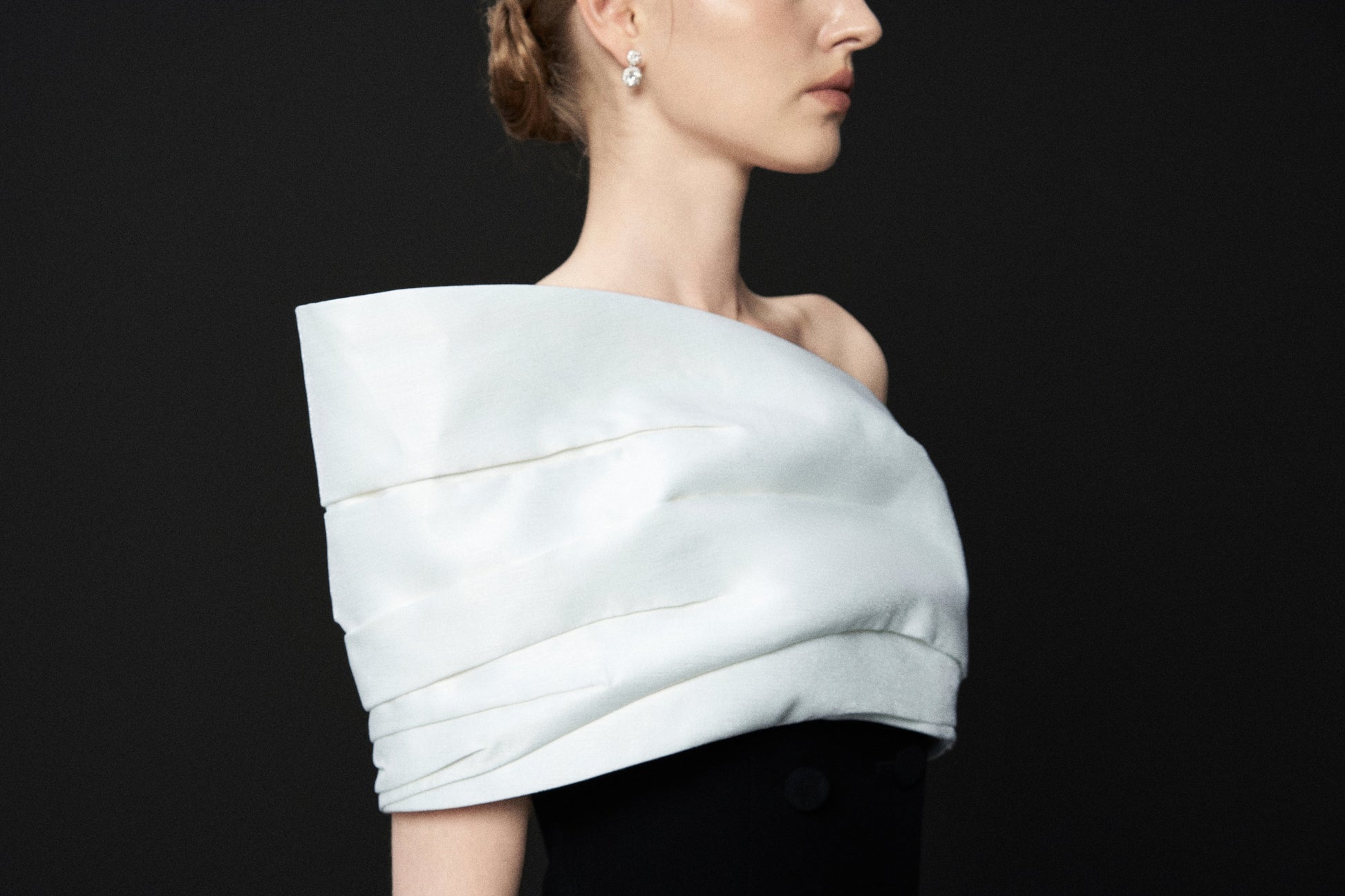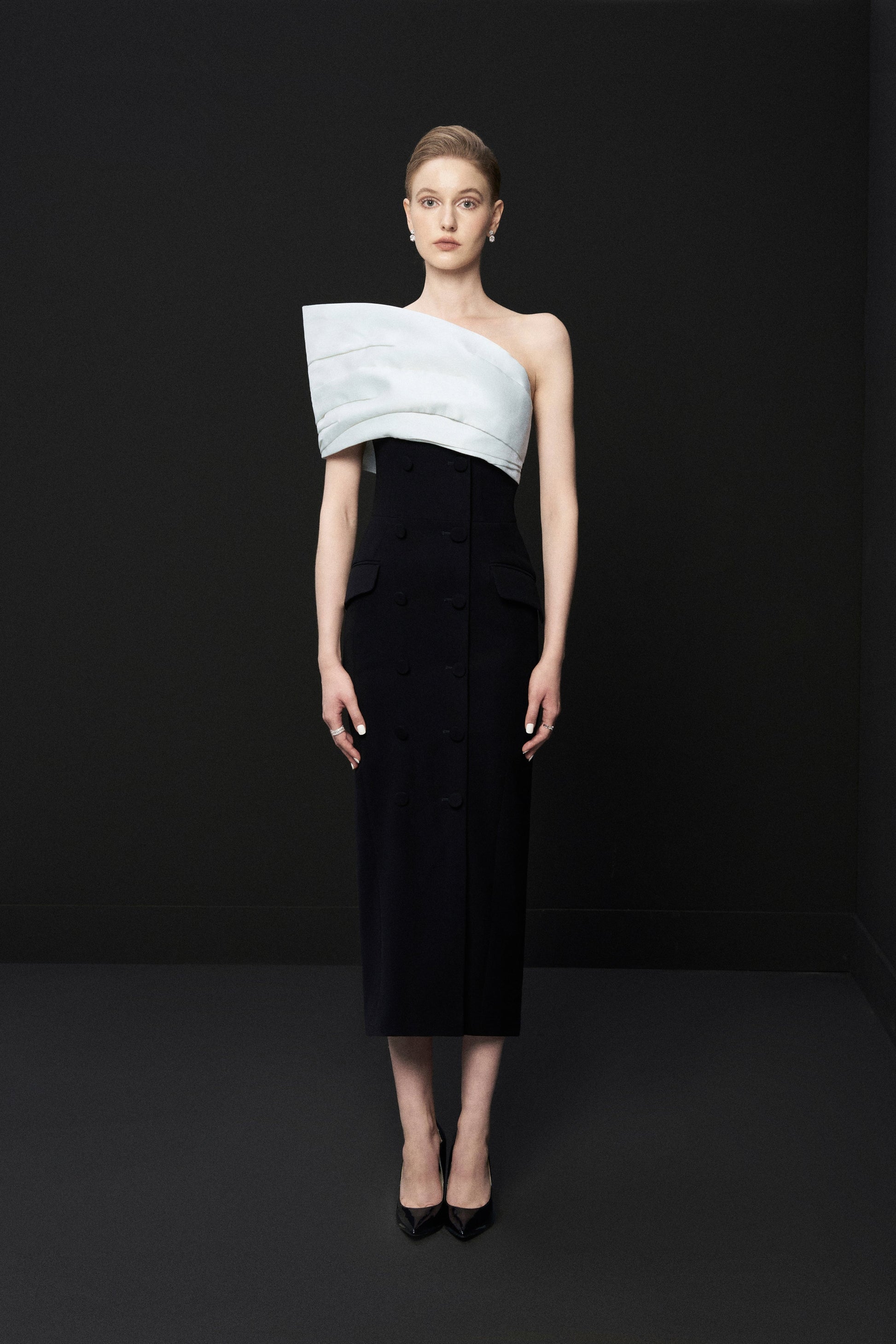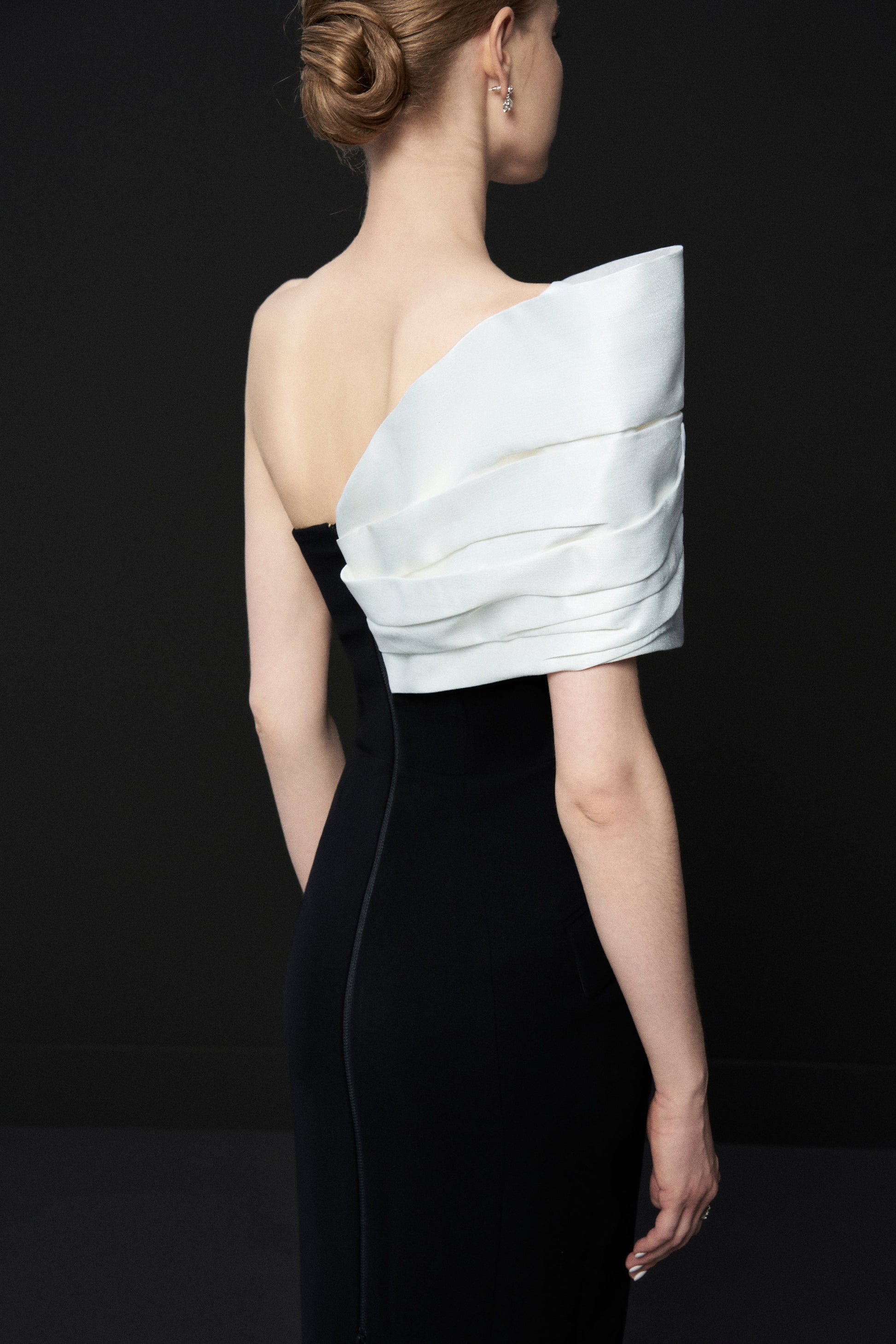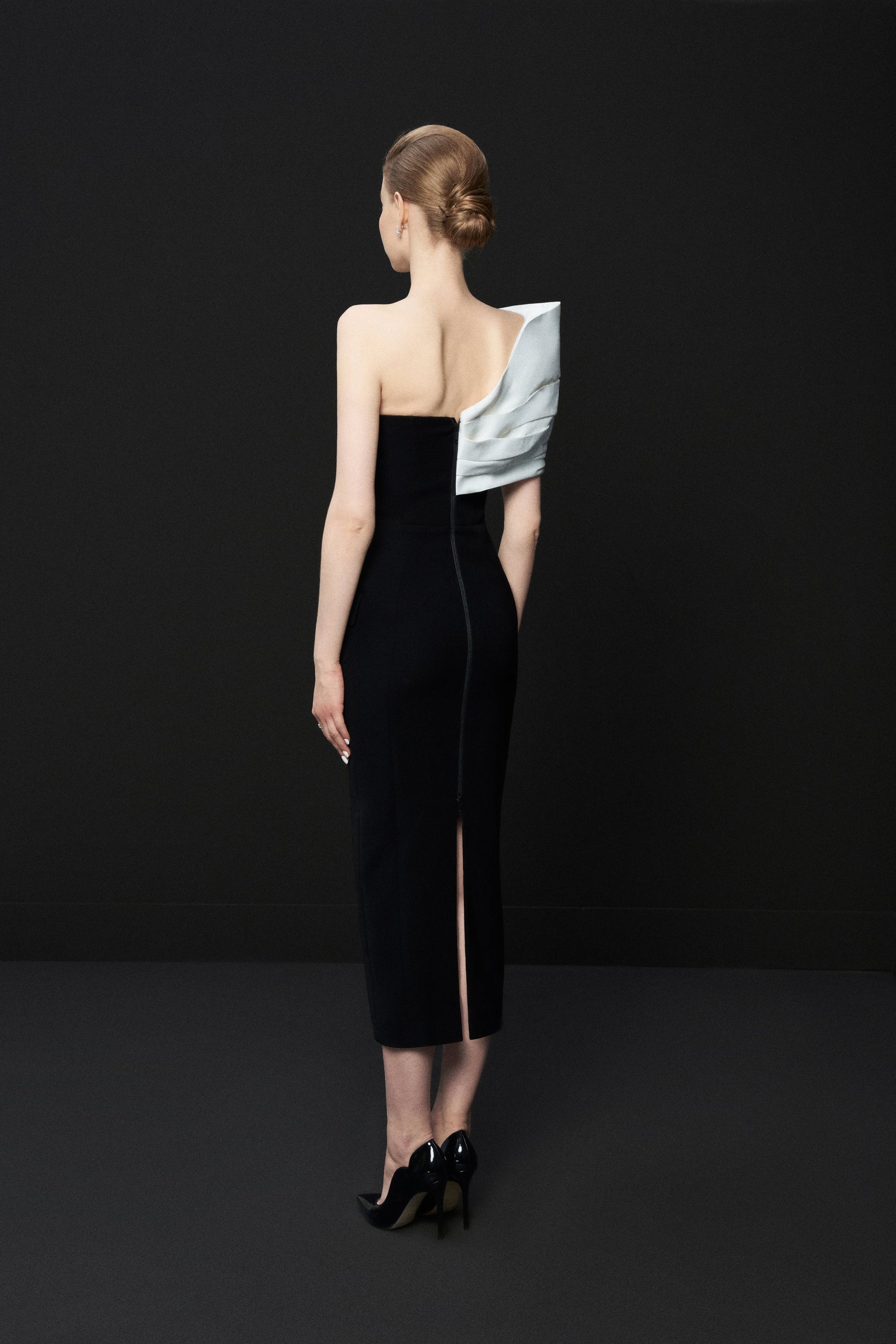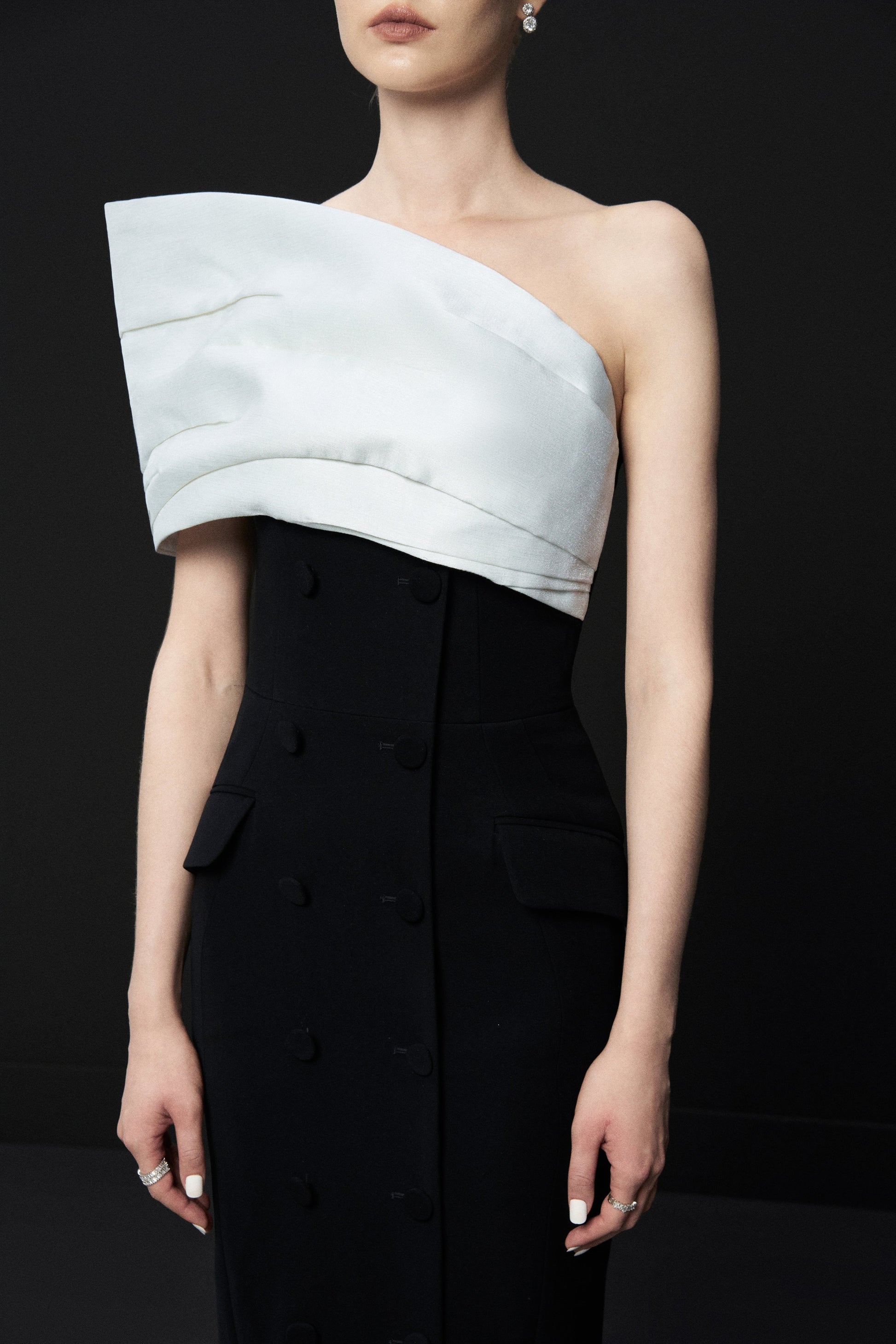 Đầm dạ hội quay vai lệch, drap thân, Khóa đồng mở sườn trái, xẻ tách. Phần drap vạt lệch, được xếp các đường nếp có tính toán để tạo hiệu ứng nếp gấp vải tự nhiên.