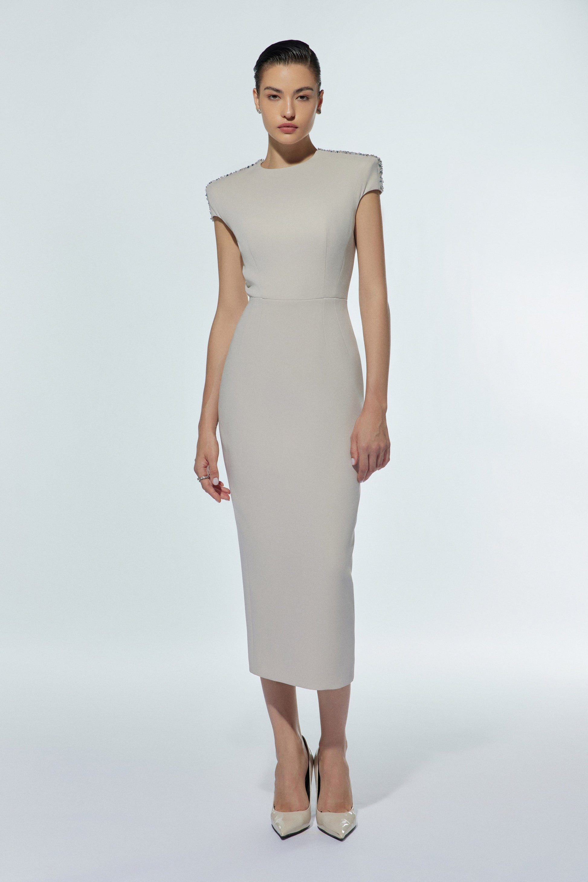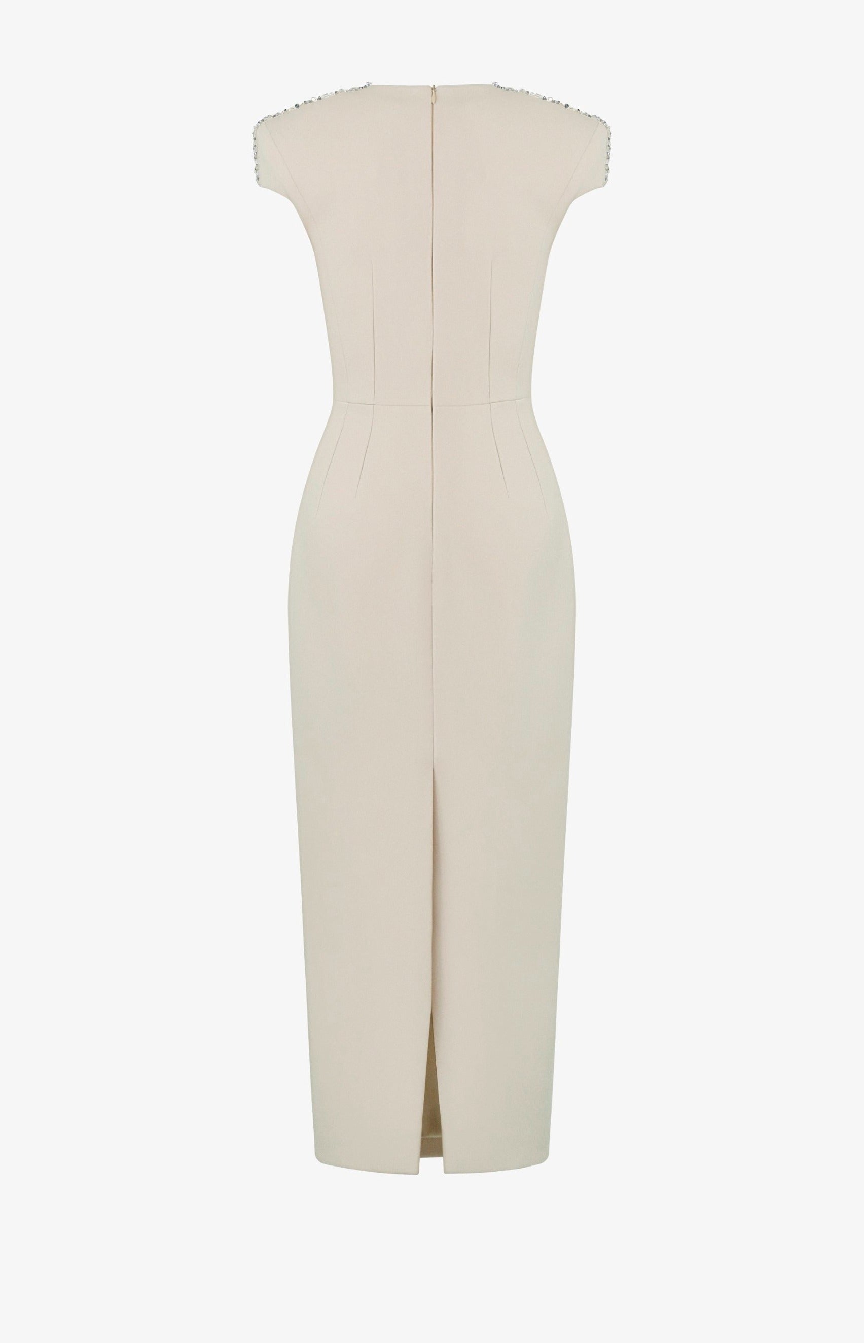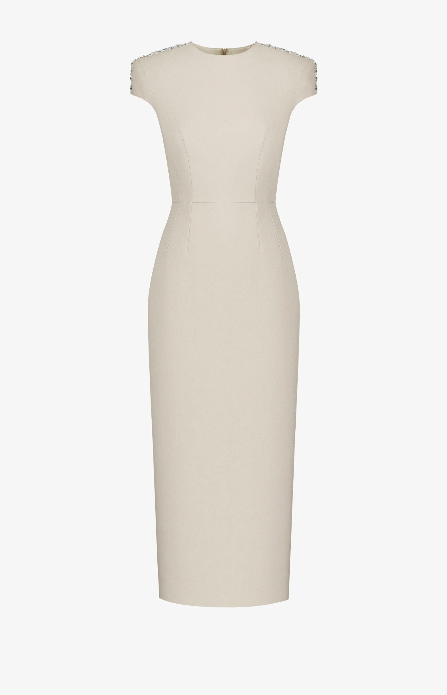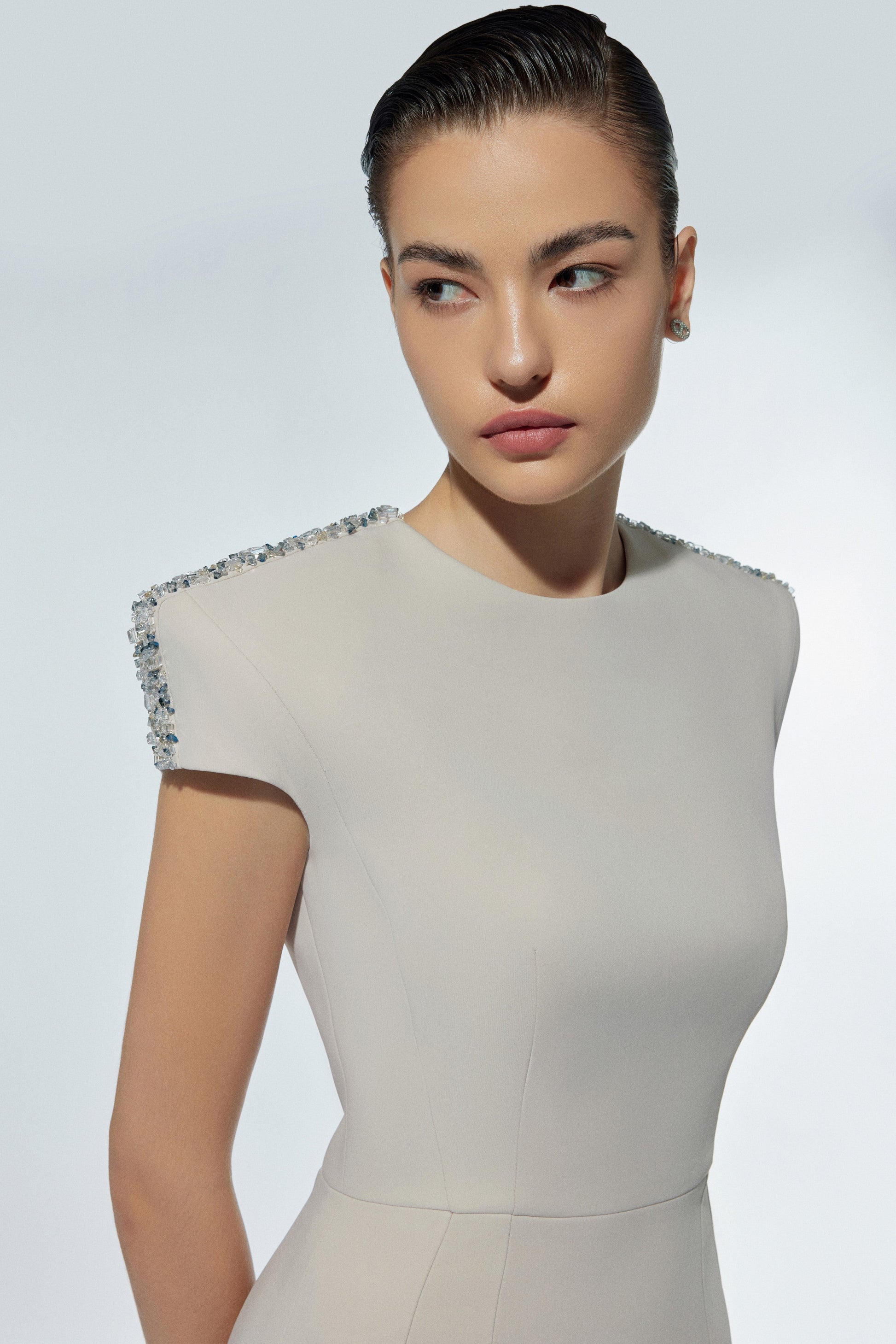 Trong cấu trúc vai ngang quyền lực, Hadrian Dress mang theo dáng hình của người phụ nữ độc lập, tự tin nhưng không hề mất đi vẻ đẹp nữ tính trong phom dáng bút chì ôm bám đặc trưng của thương hiệu. Điểm nhấn nằm tại dải đính kết thủ công được xử lý cầu kỳ, tiếp nối những di sản của nghệ thuật đính kết Haute Couture.
