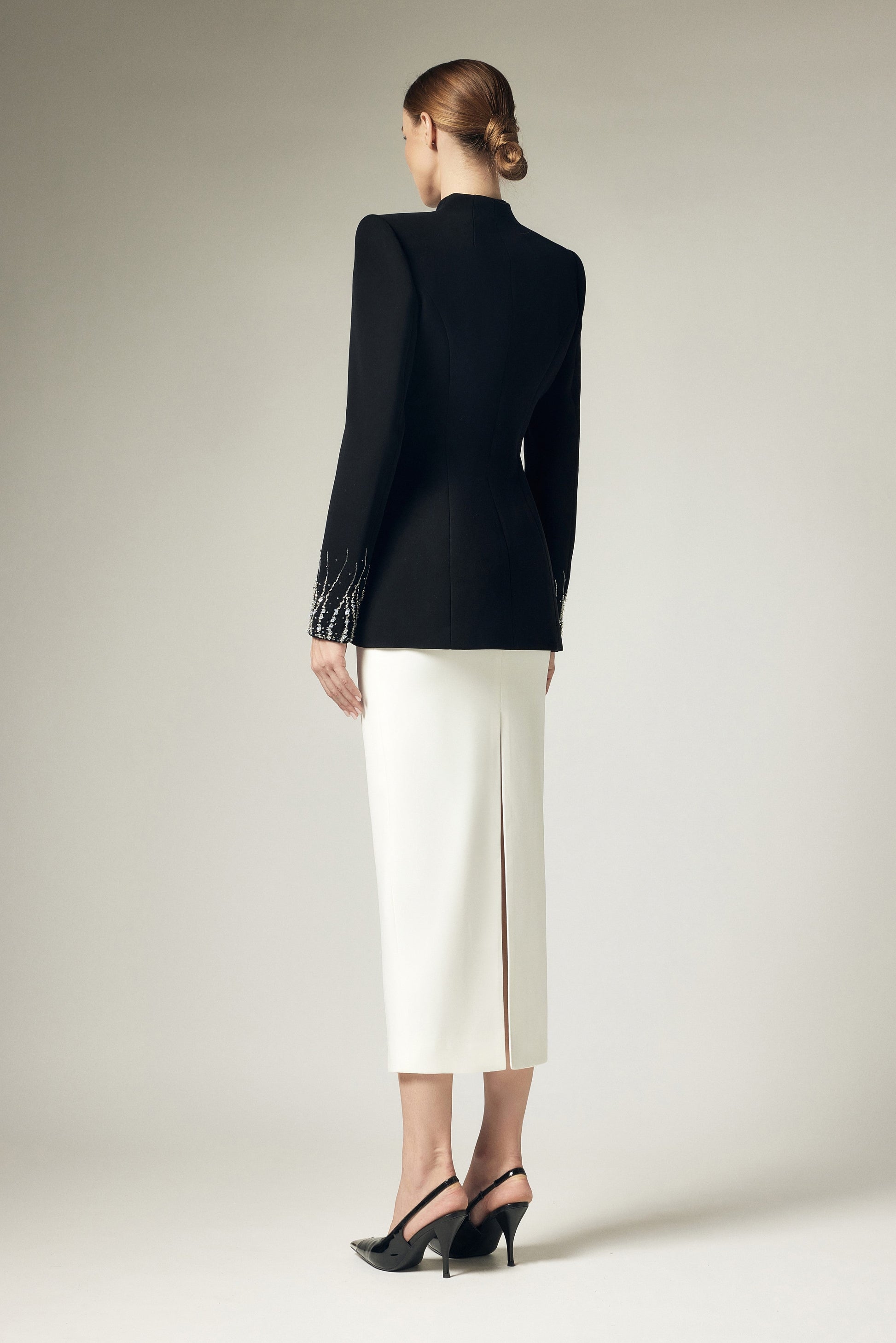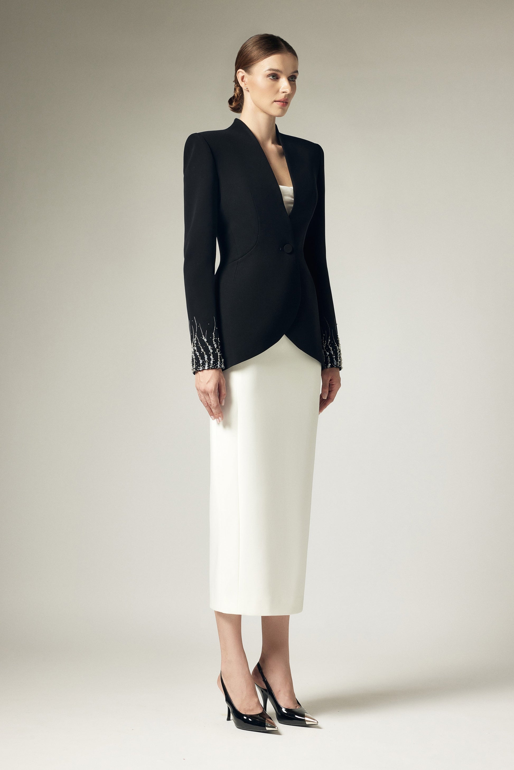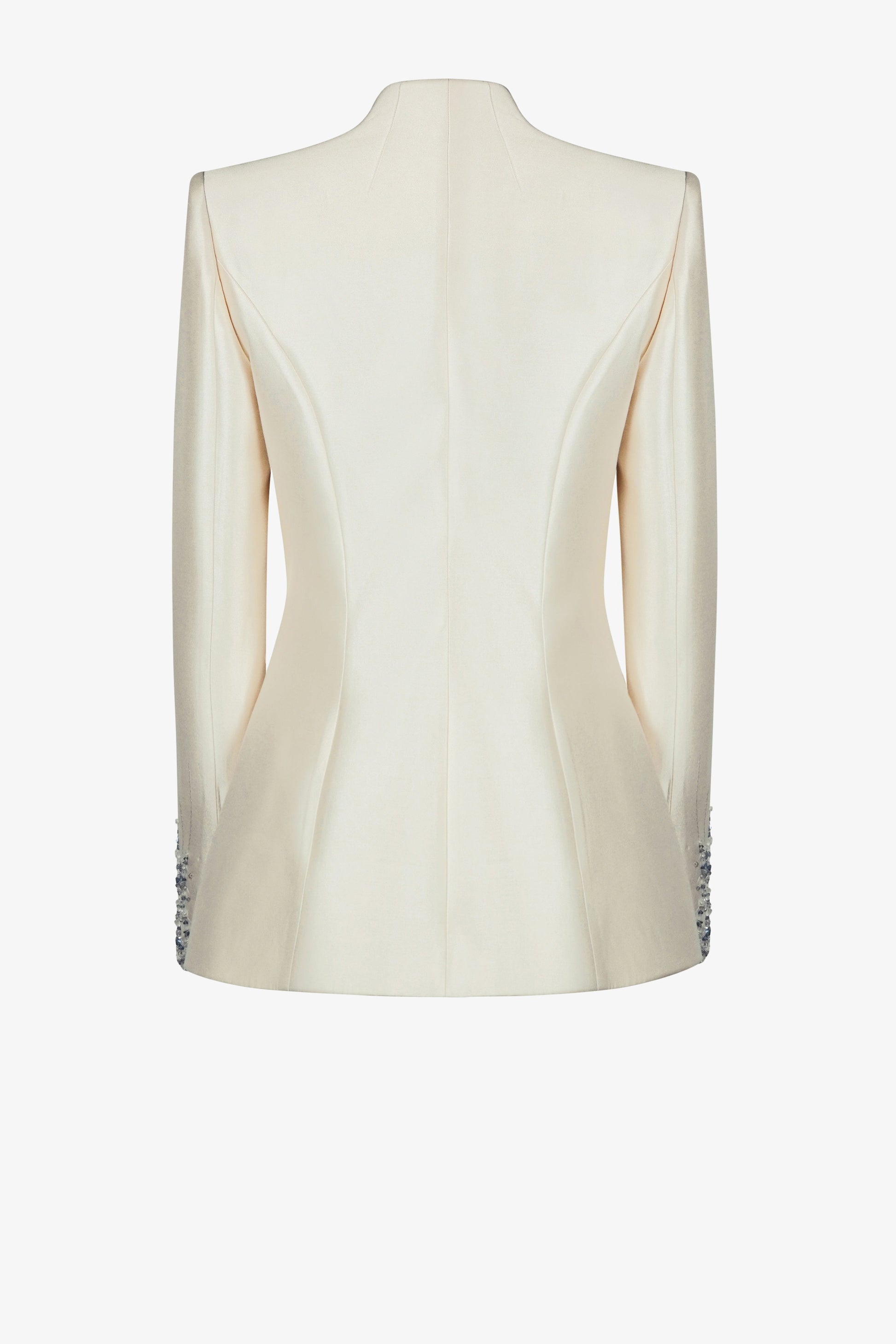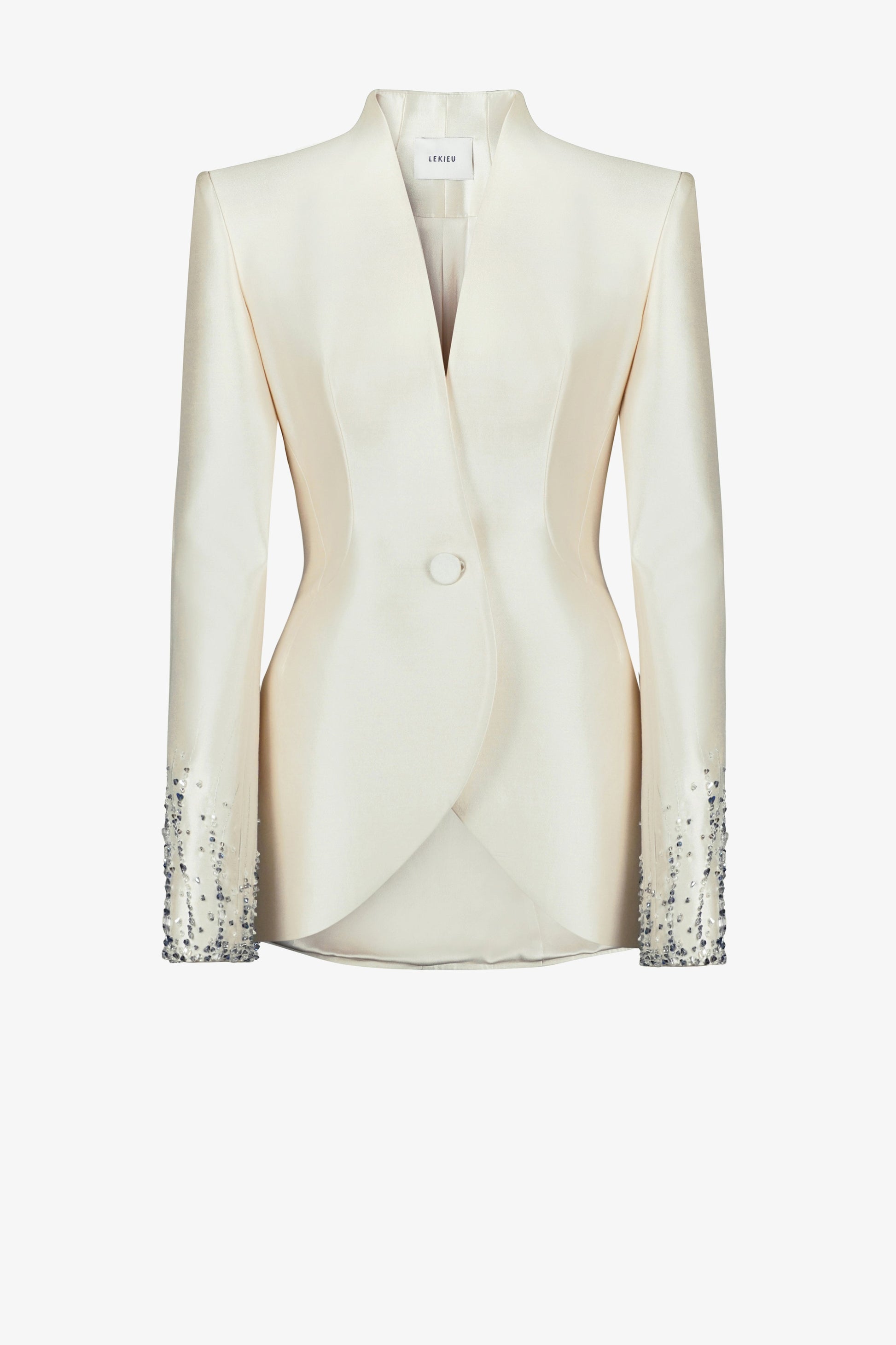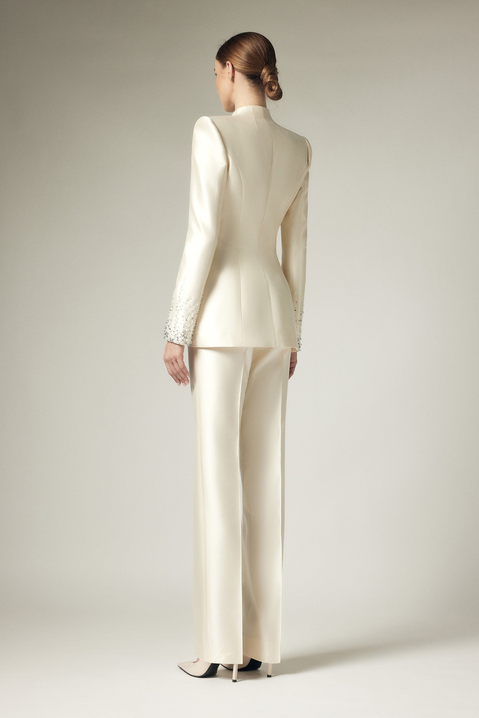Được dệt nên từ chất liệu Silk Taffeta, Jennica Jacket mang đến vẻ sang trọng thể hiện rõ qua lối thiết kế đặc trưng với phần vai ngang quyền lực và sự đồng nhất về chất liệu. Sử dụng tone màu Creamy White, Jennica Jacket phô diễn kỹ thuật đính kết thủ công với hiệu ứng tạo chiều sâu phối cùng quần Cummerbund lưng cao kiểu cách phù hợp cho mùa lễ hội.