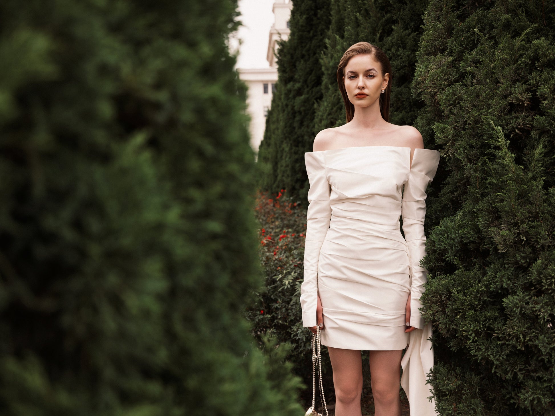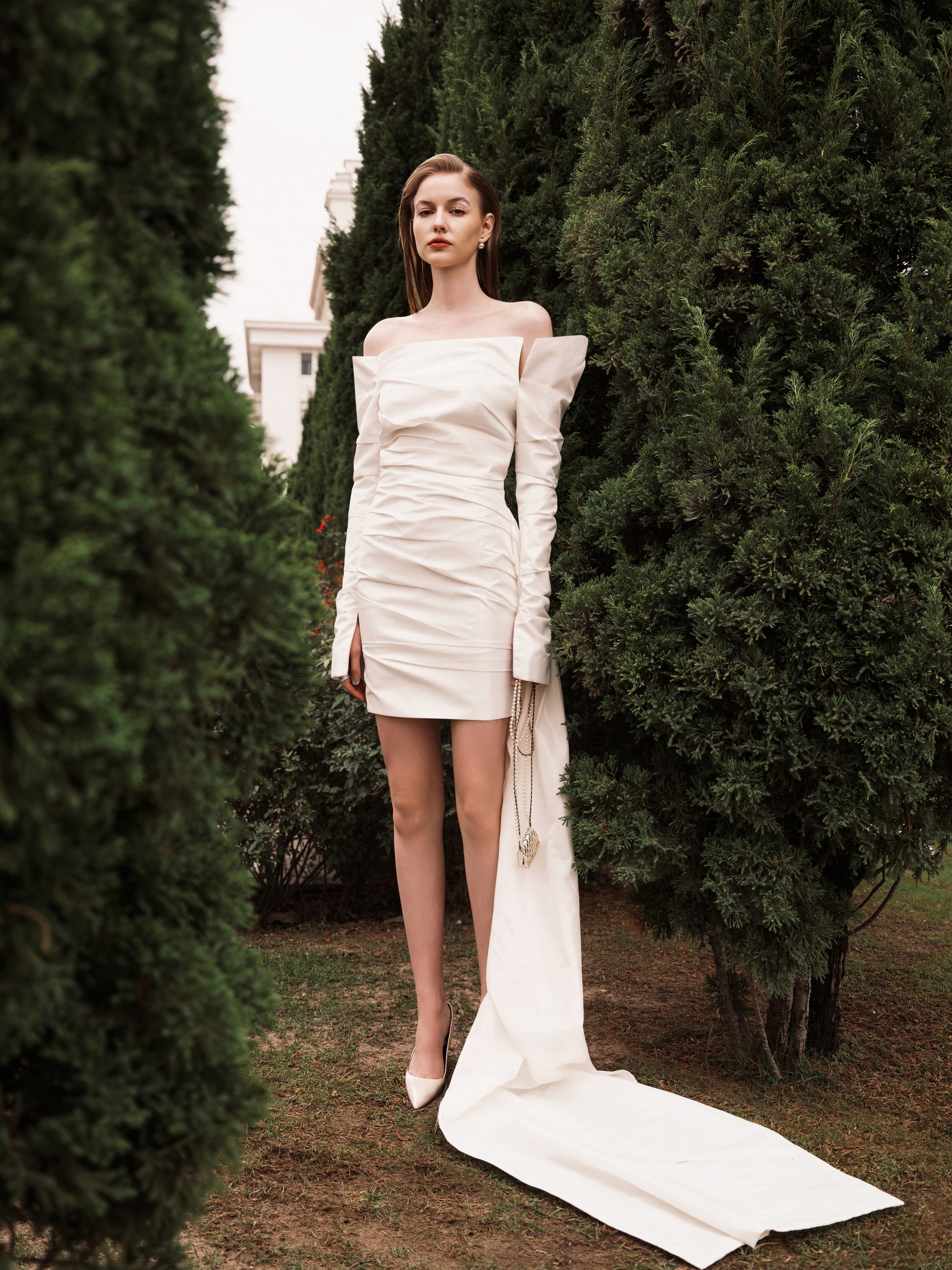 Đầm hạ vai ôm body dáng ngắn, xếp nếp thủ công toàn bộ thân đầm, tay dài, xẻ V bên tay trái khi mặc. Tay có khóa lệ ở bụng tay. Đáp tà buông dài bằng vải chính kẹp vào sườn bên trái khi mặc, Khóa lệ thân sau.