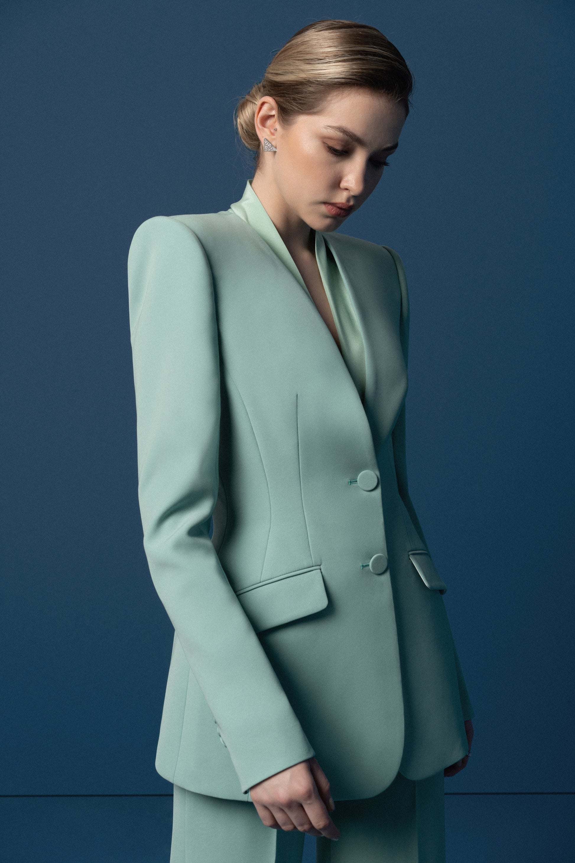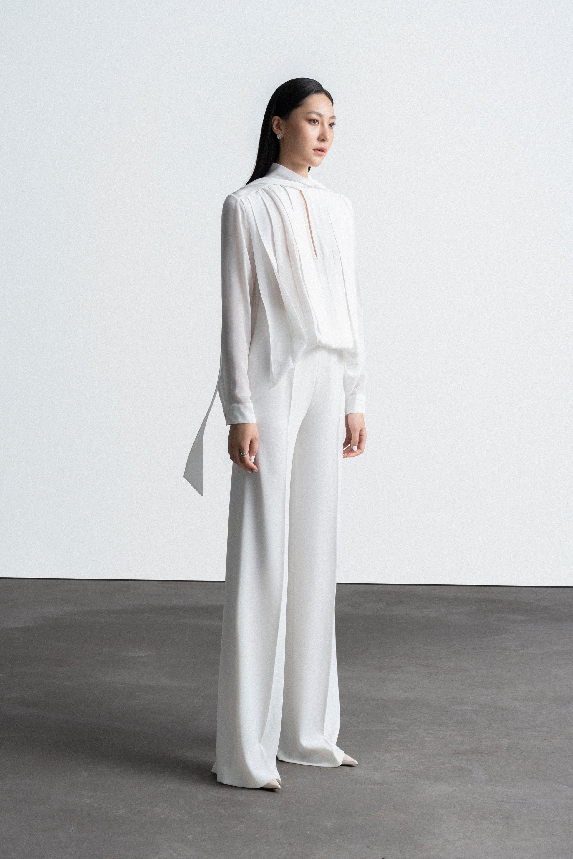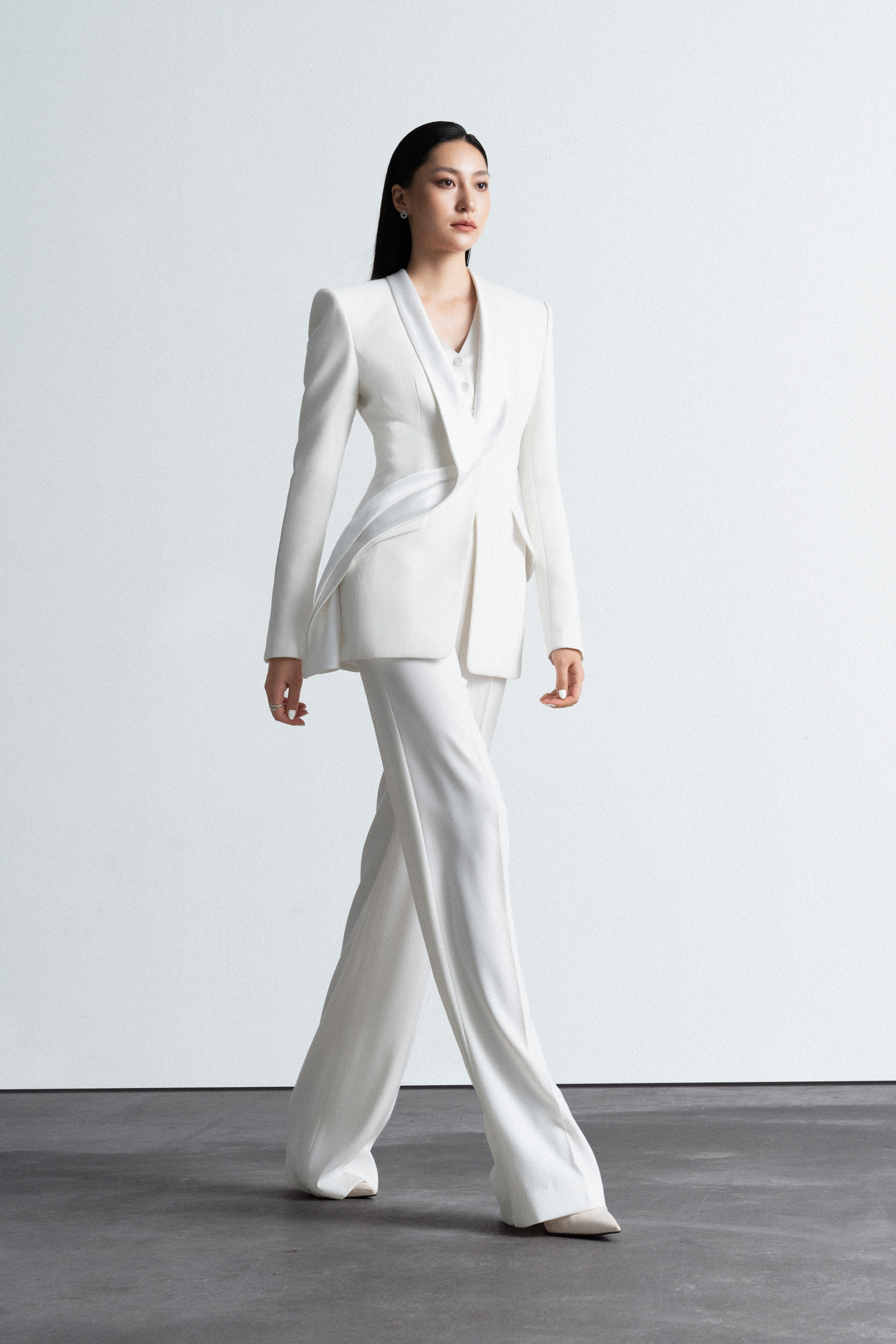 Được xử lý dưới chất liệu Marocain Crepe tạo độ mềm rủ, cùng thiết kế ống suông thẳng tạo những bước đi uyển chuyển, tôn vinh vóc dáng người phụ nữ.