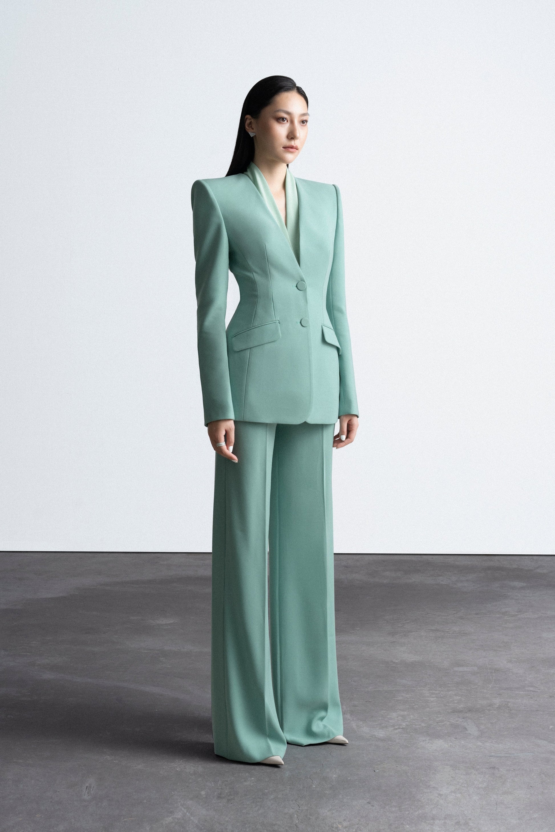 Quần suông rộng có 1 ly lật thân trước. 2 túi cơi thân sau. Ống 29, dài phủ giày. Khóa lệ tại sườn trái.