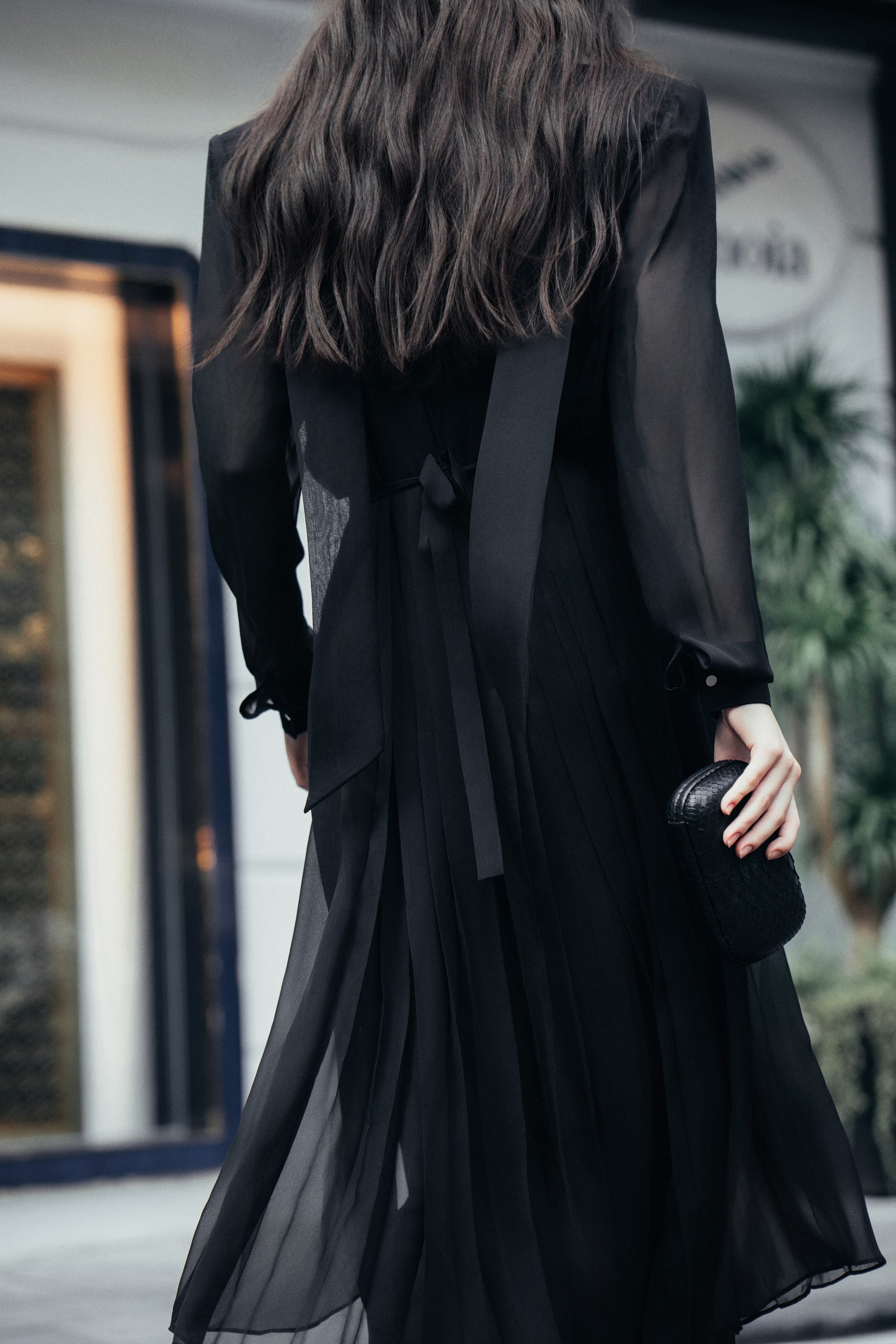 Đầm có dải khăn và cổ hình V, khă bản 5cm, có thể phối tuỳ thuộc vào sở thích. Phần ly xếp nếp không đong đèu được thể hiẹn ở cả than trước và thân sau. Cầu vai dôi và có đệm vai 2cm. Váy có 1 váy lót dây ngắn ngang đùi để che vì vải có độ xuyên thấu. Phần dây đai đi kèm dùng để buộc ngang eo.
