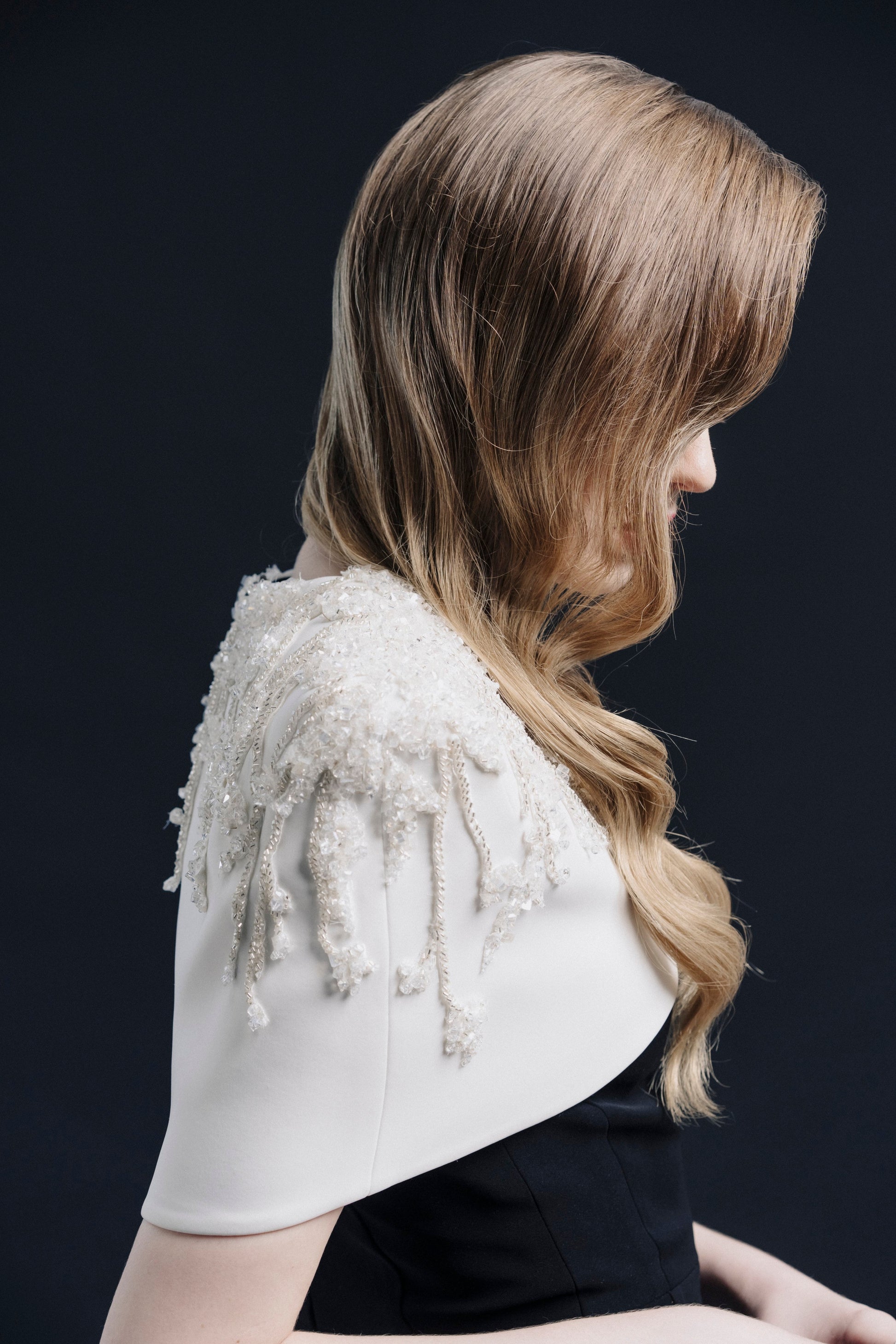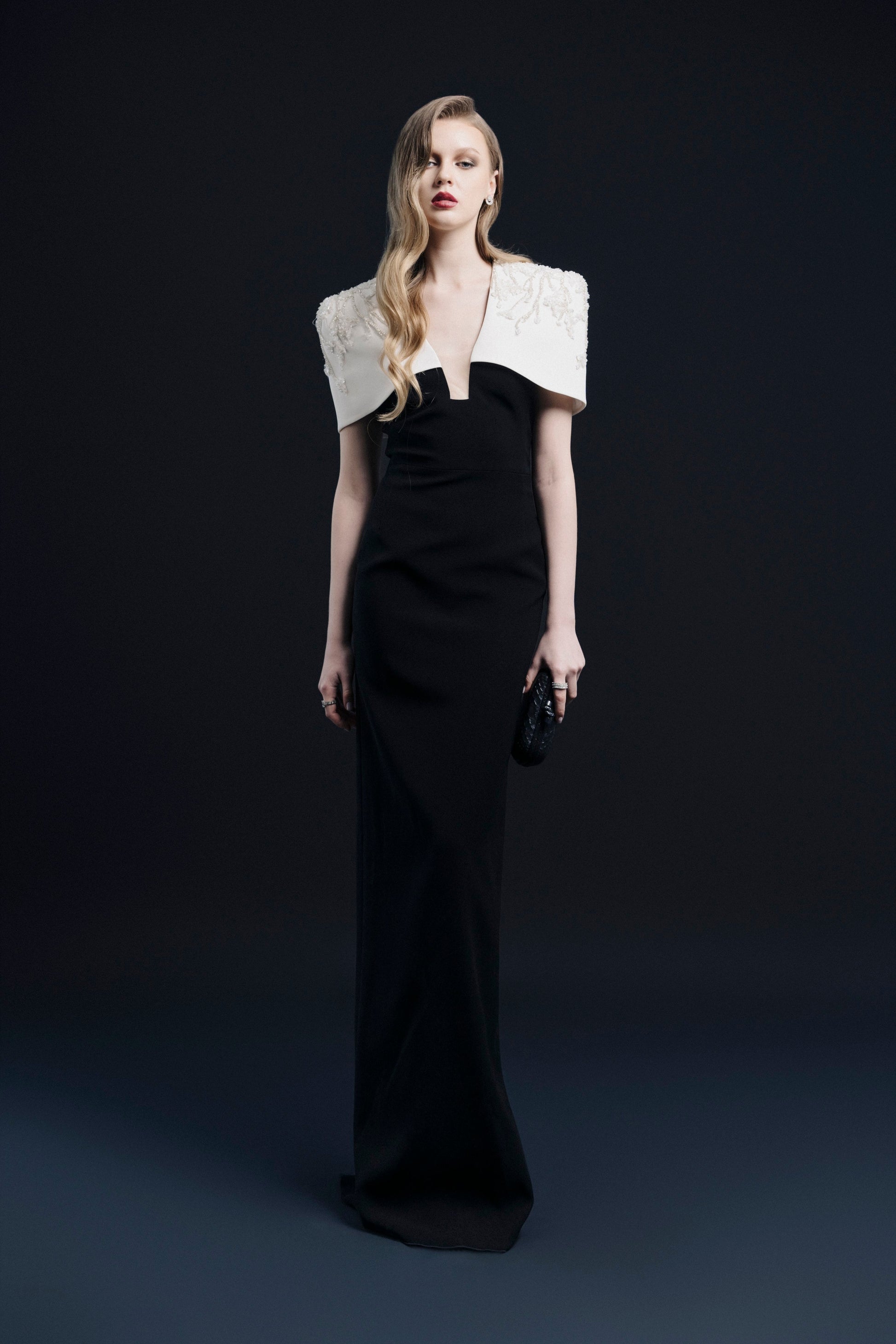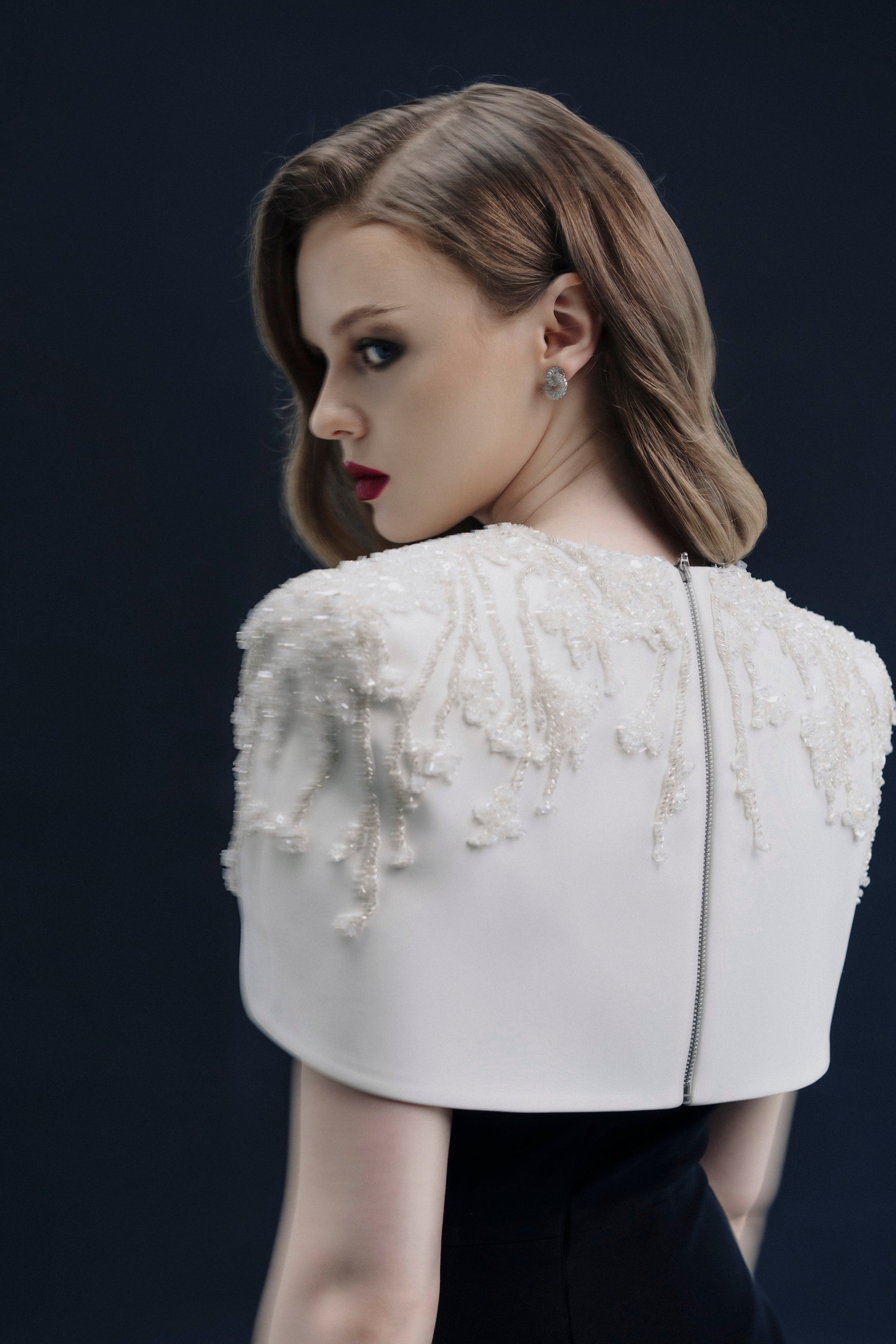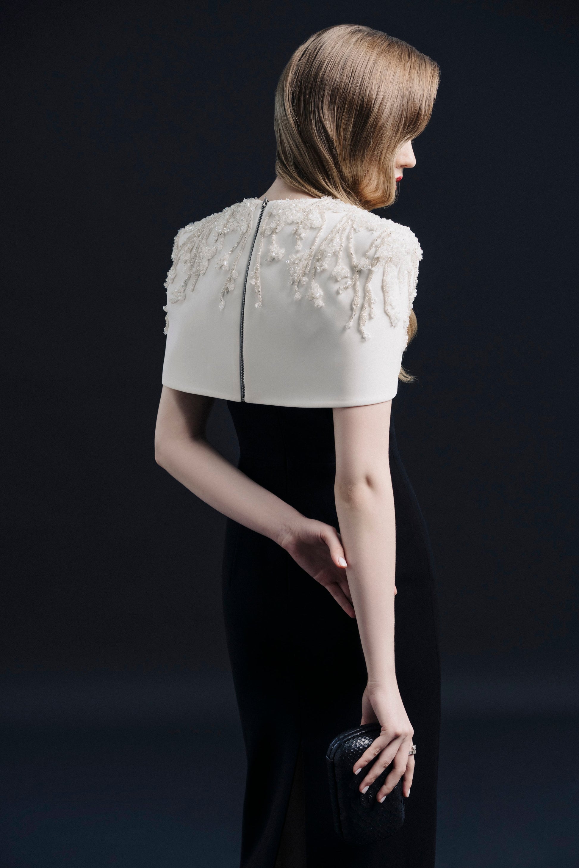 The evening gown with a draped shawl features a color-block design, with the dress itself in black and the shawl in white. The shawl is decorated with hand-embroidered floral patterns and stone embellishments. The neckline is cut deeper and is lined with a layer of mesh leather for added security when worn. The shawl is fastened with a brass clasp at the center back, and the skirt has a layered slit with a zipper at the back.