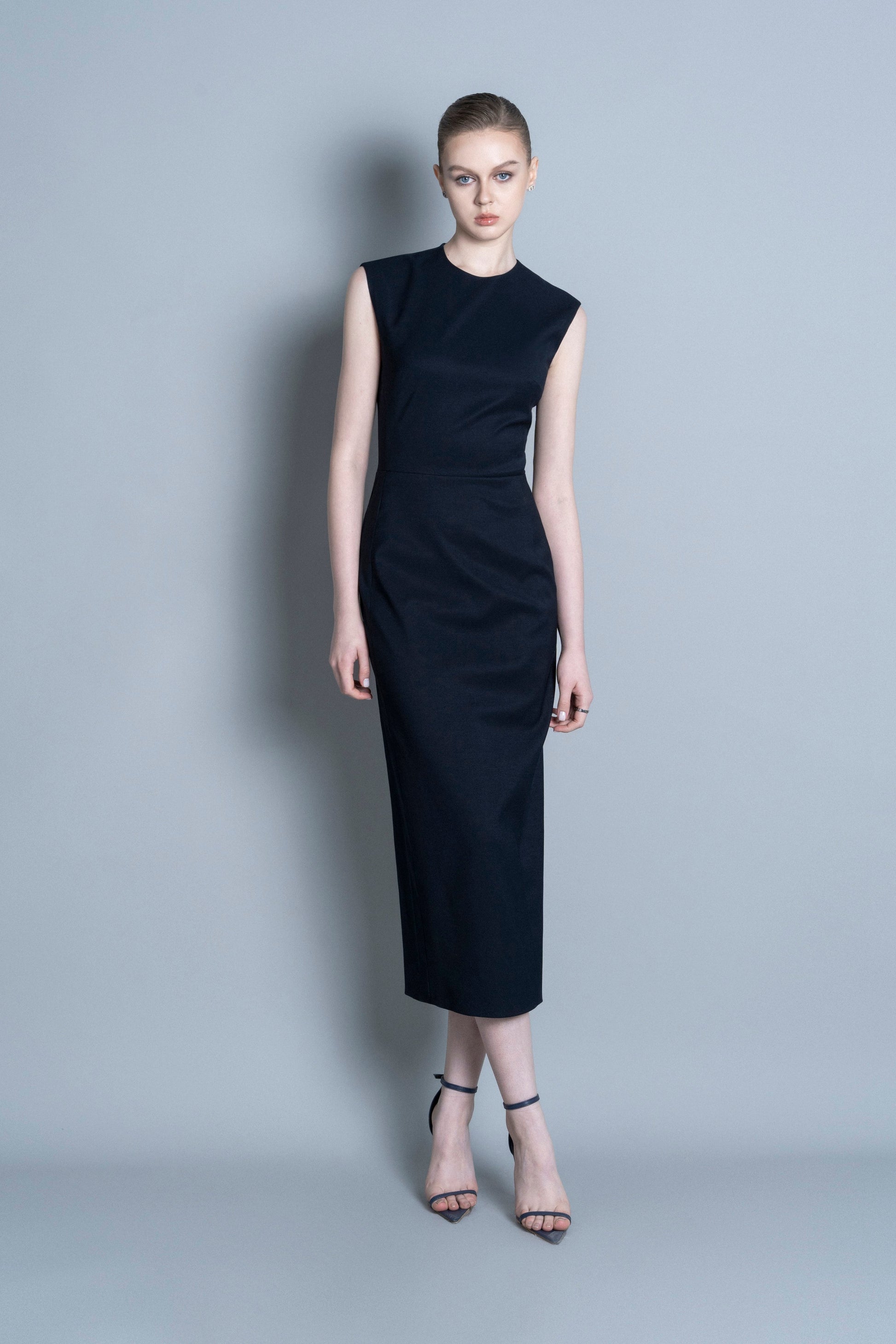 The pencil dress has a round neckline and no sleeves. The dress is pencil-shaped and falls below the calf, with a relaxed fit in the lower half for a youthful design. The shoulders are standard, and the top is made with side seams connecting the front and back. The dress features two pleats in the front and two in the back. There is a center back zipper with a slit.