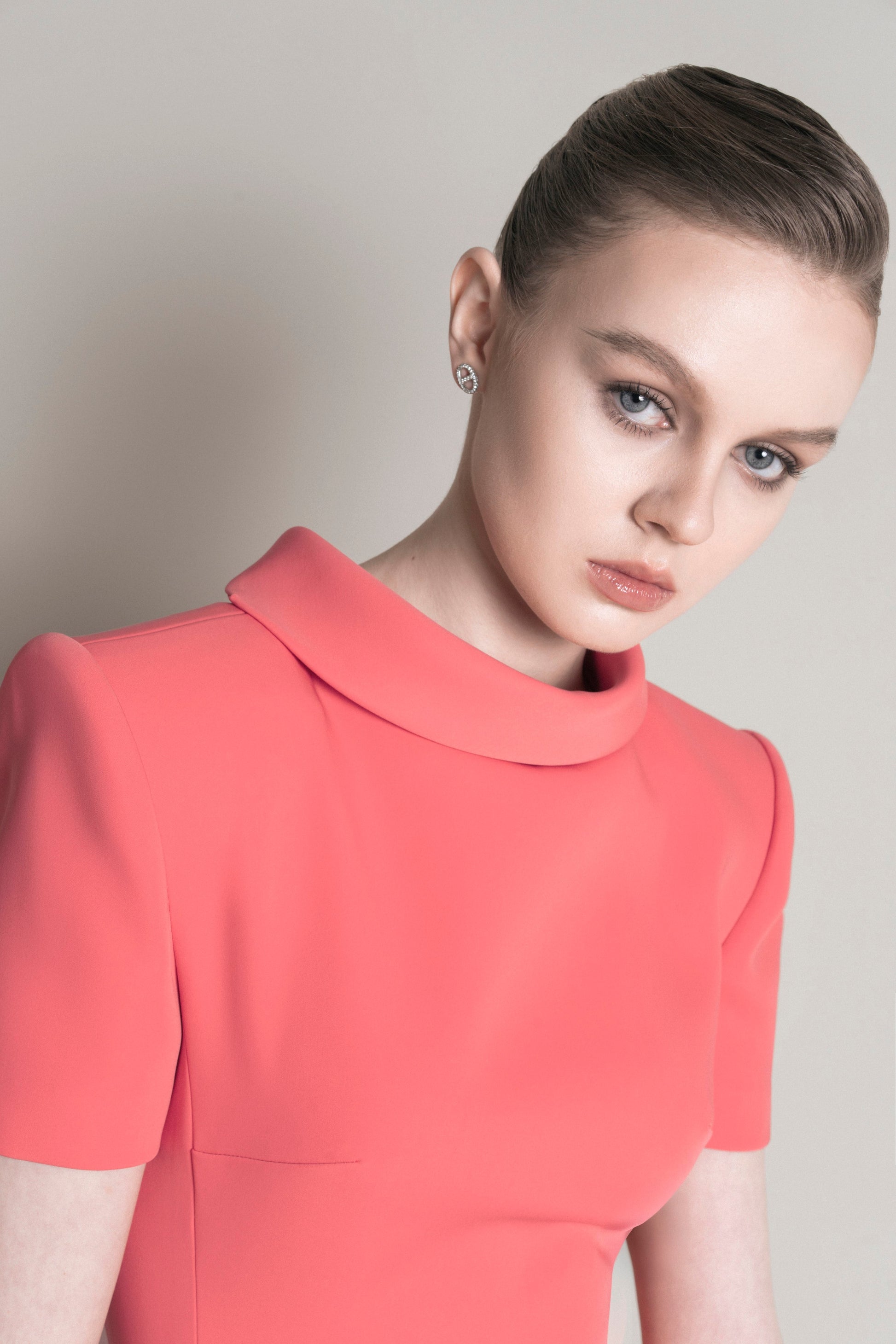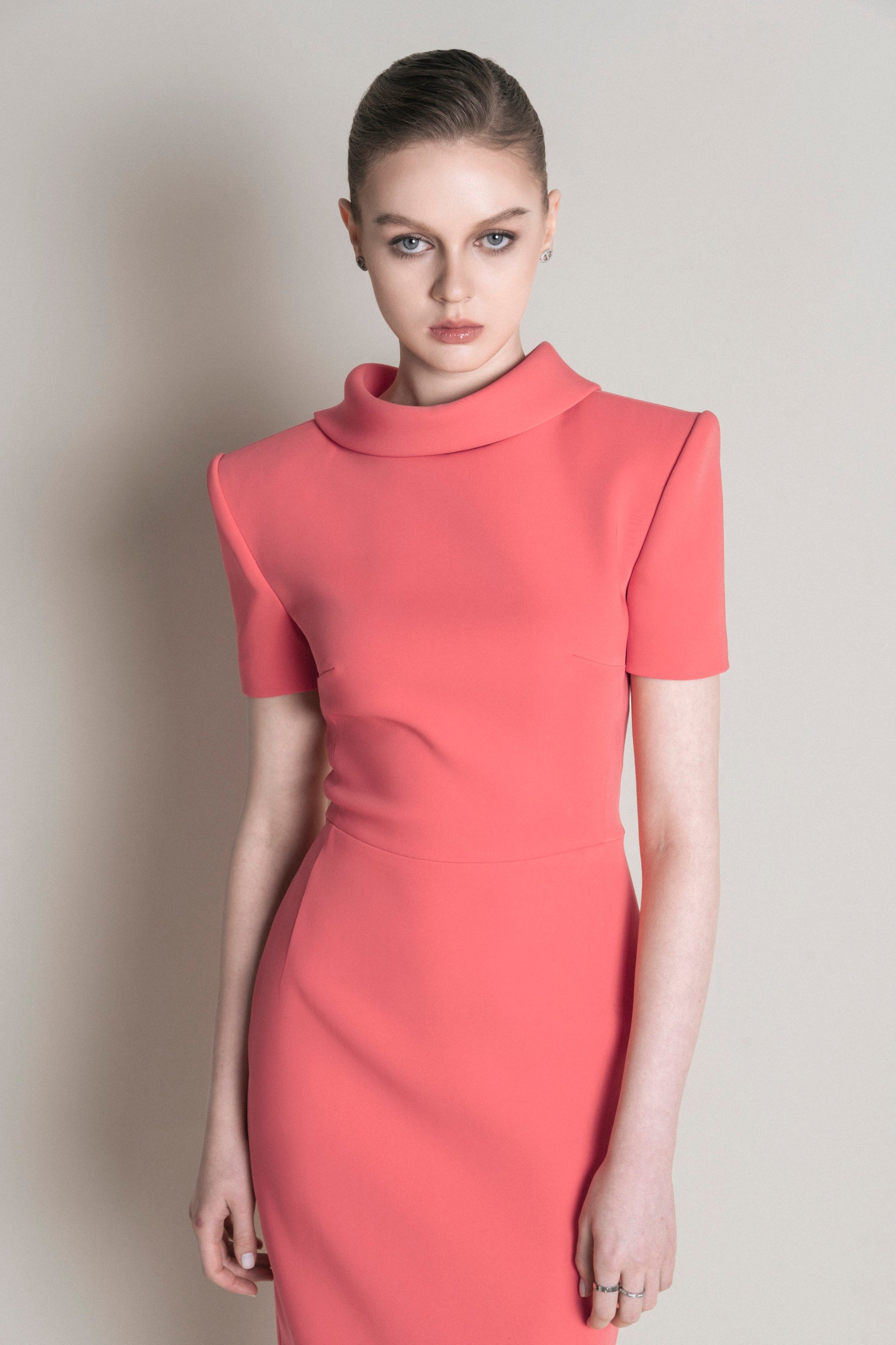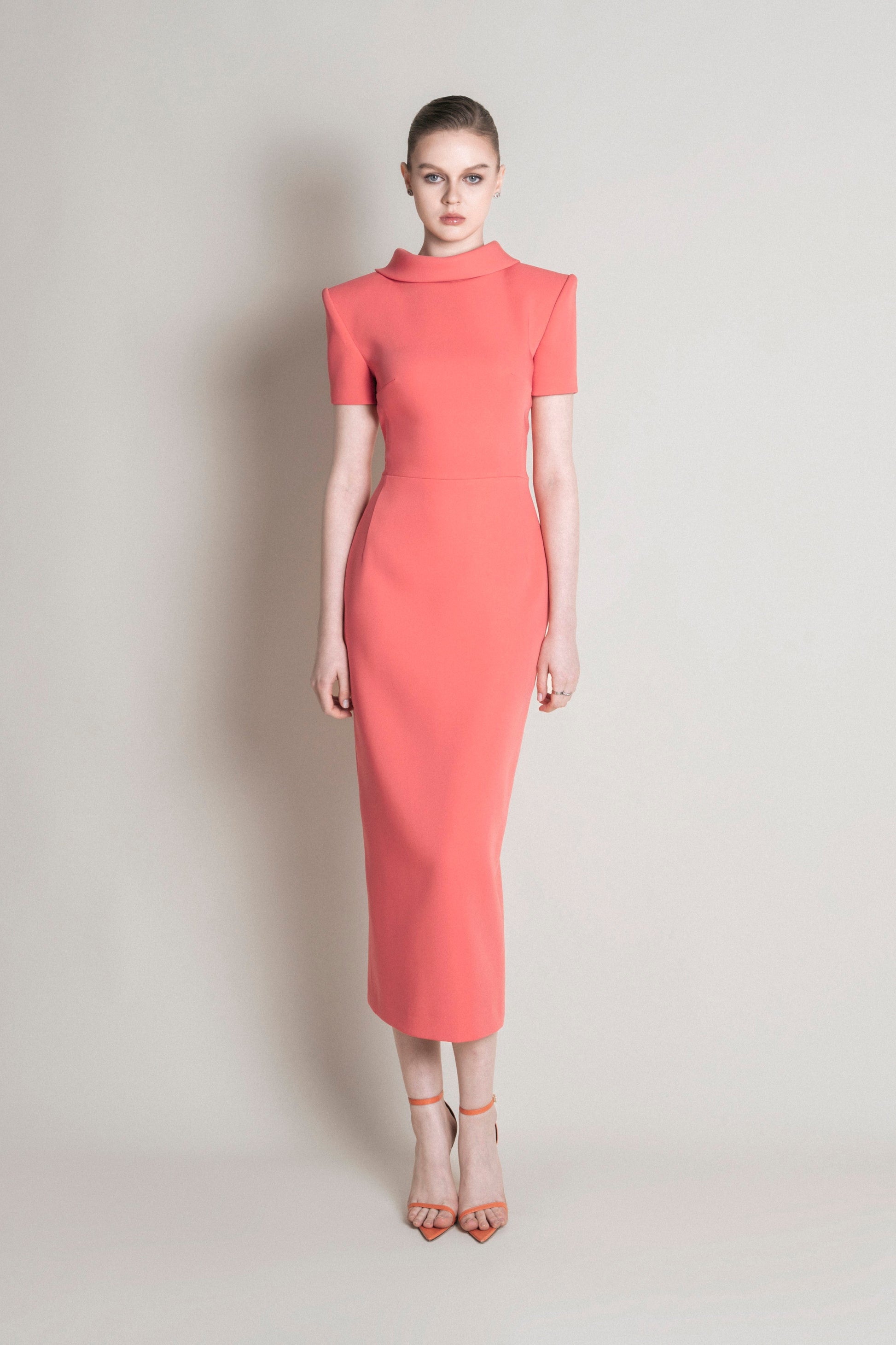 The pencil dress has off-the-shoulder sleeves with 2.5 cm shoulder pads and a collar with a folded-down design. The length reaches just below the calf. The collar is designed to stand up in the front, and the back has a slight adjustment that smooths into a soft, curved shape. The top of the dress is made with side seams connecting the front and back, while the lower part features two pleats in the front and back. The dress has a center back zipper with an overlapping slit.