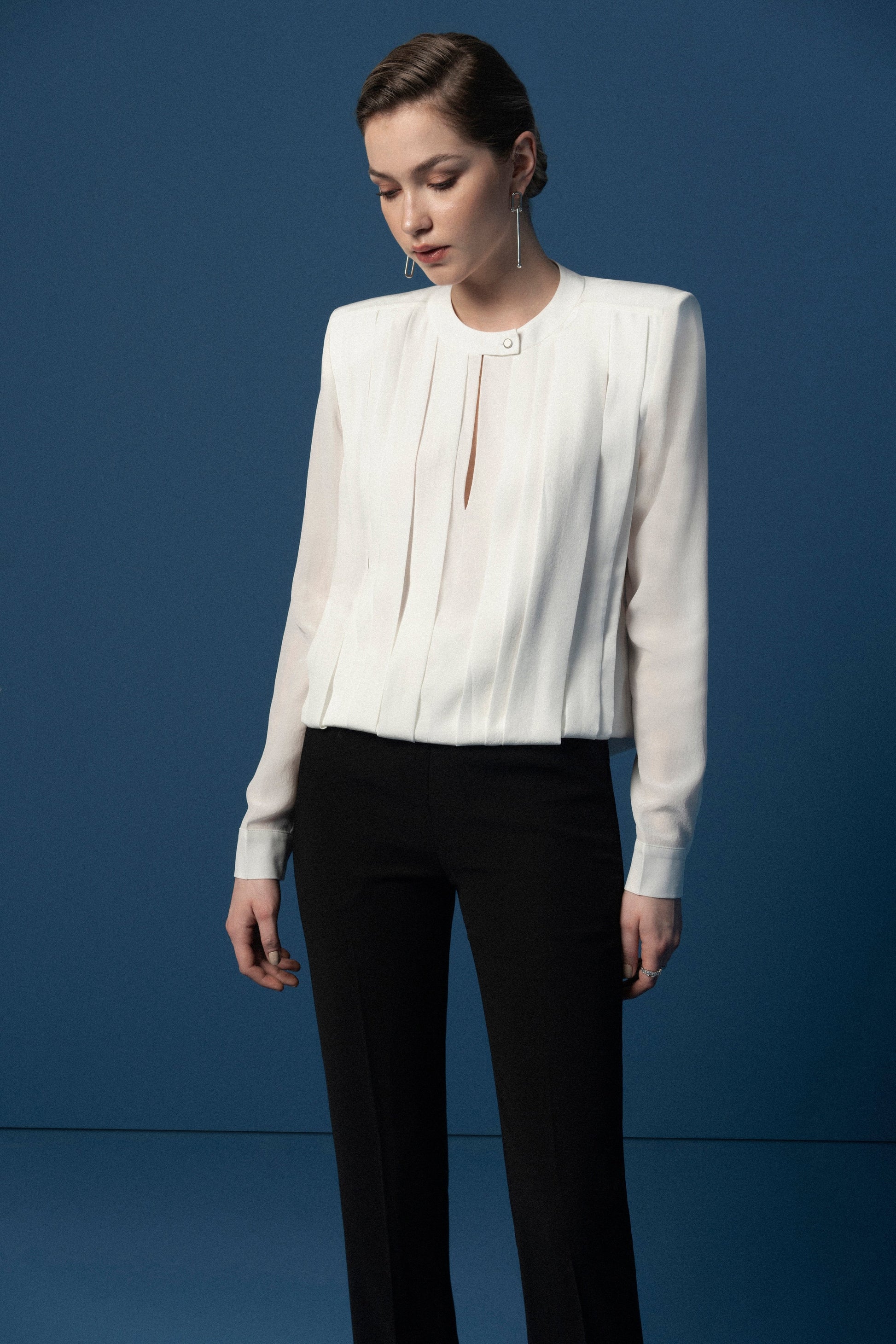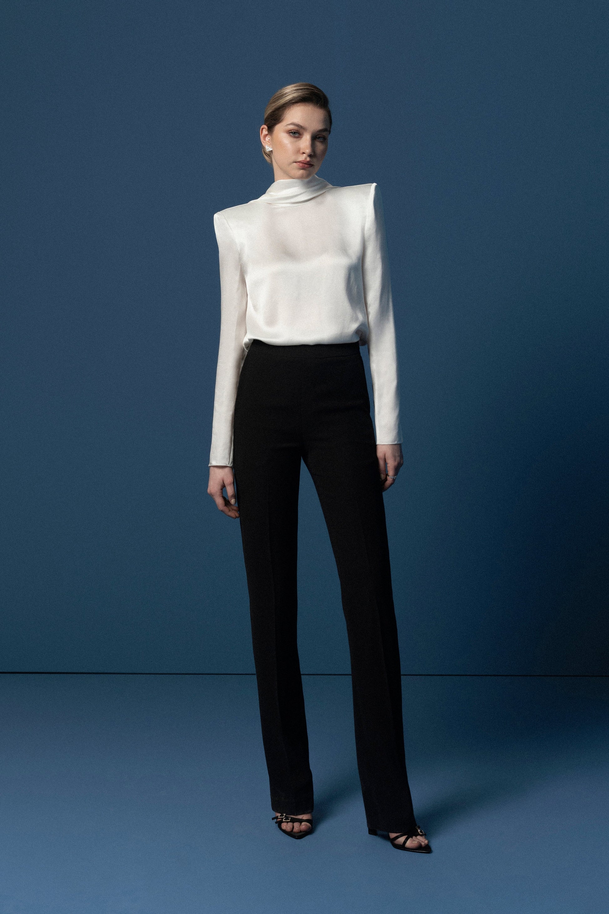 Nikora Pants với thiết kế quần dáng côn đứng cùng phần ly sử dụng kỹ thuật ép thẳng trên nền chất liệu Taffeta đem tới độ đứng phom hoàn hảo.