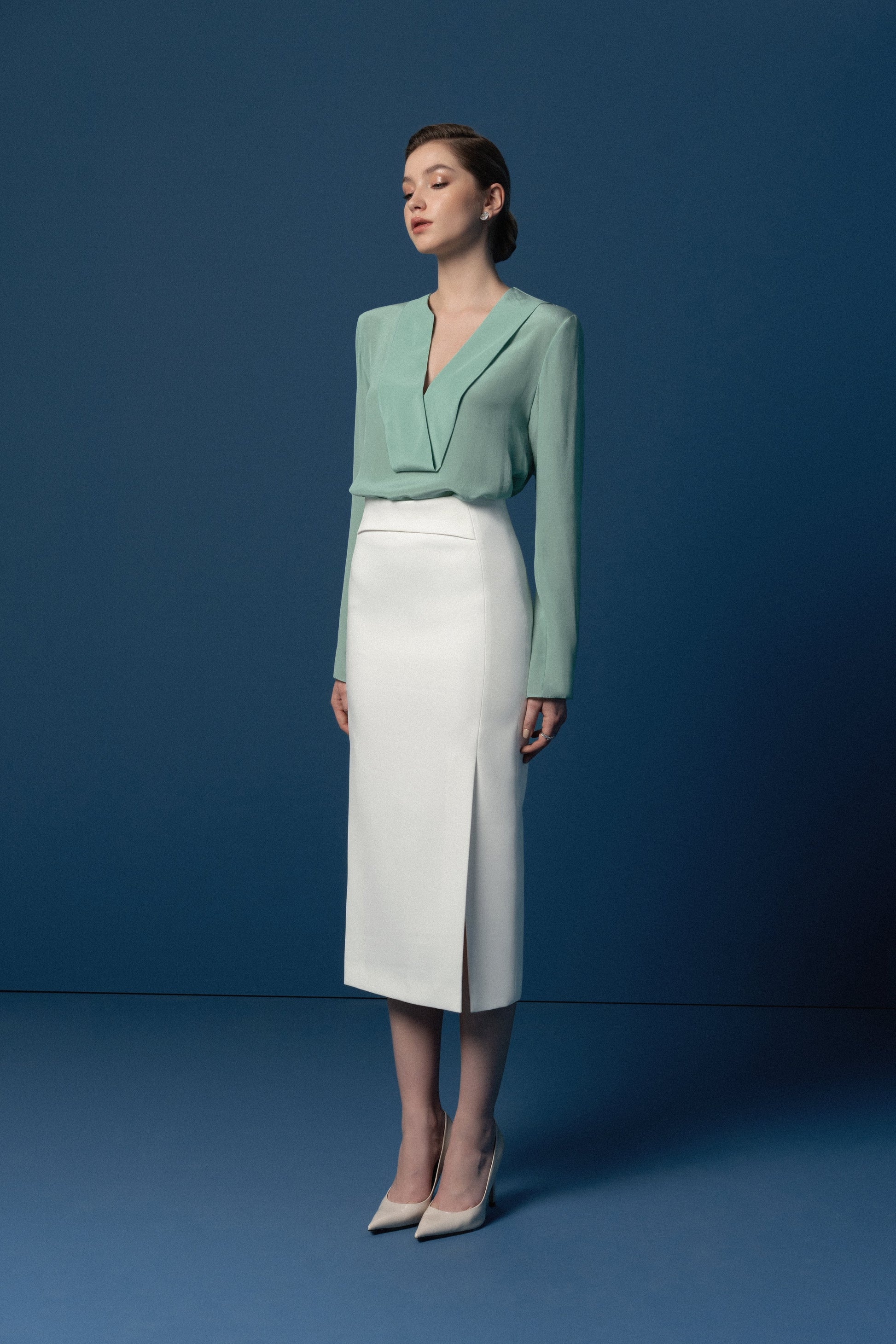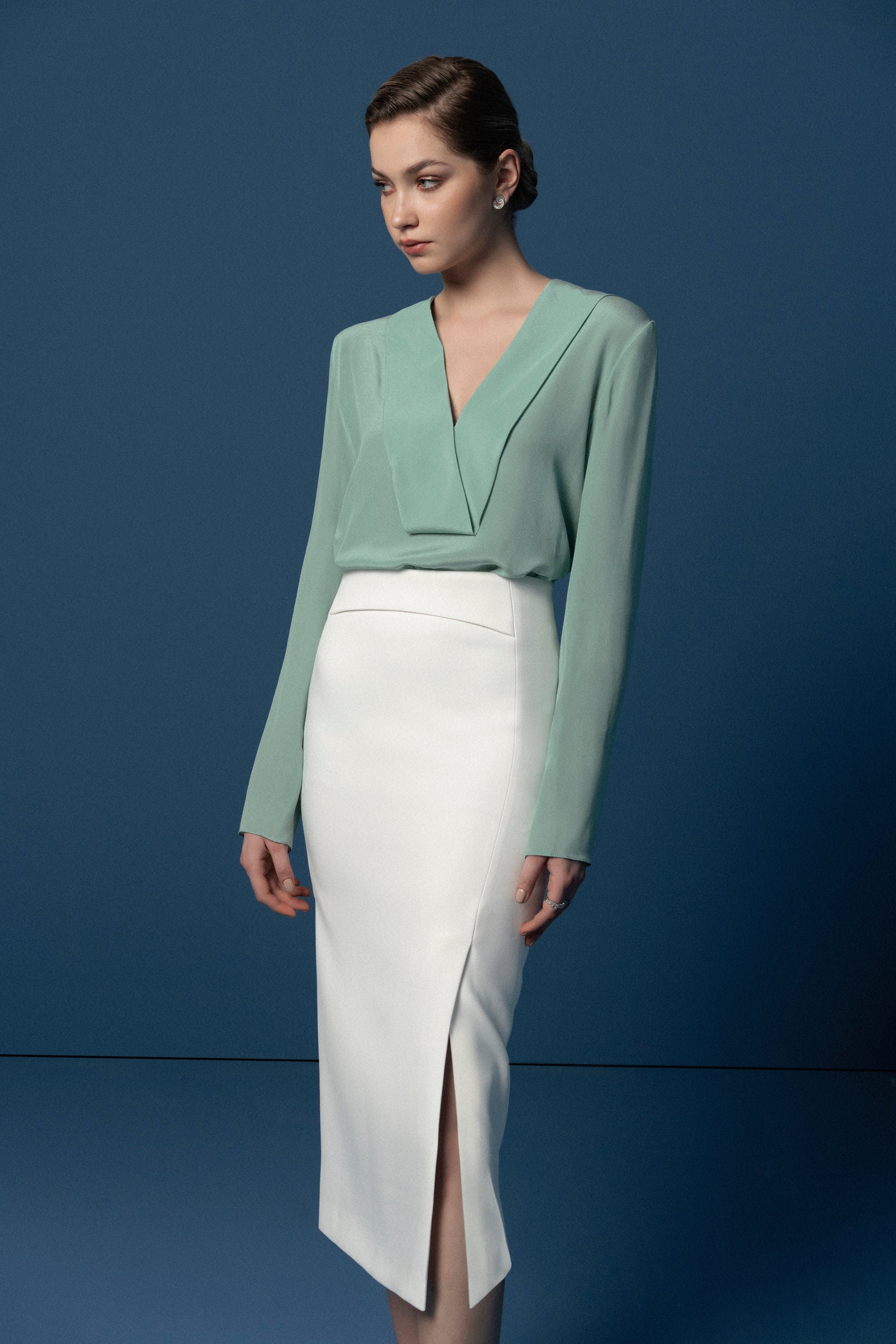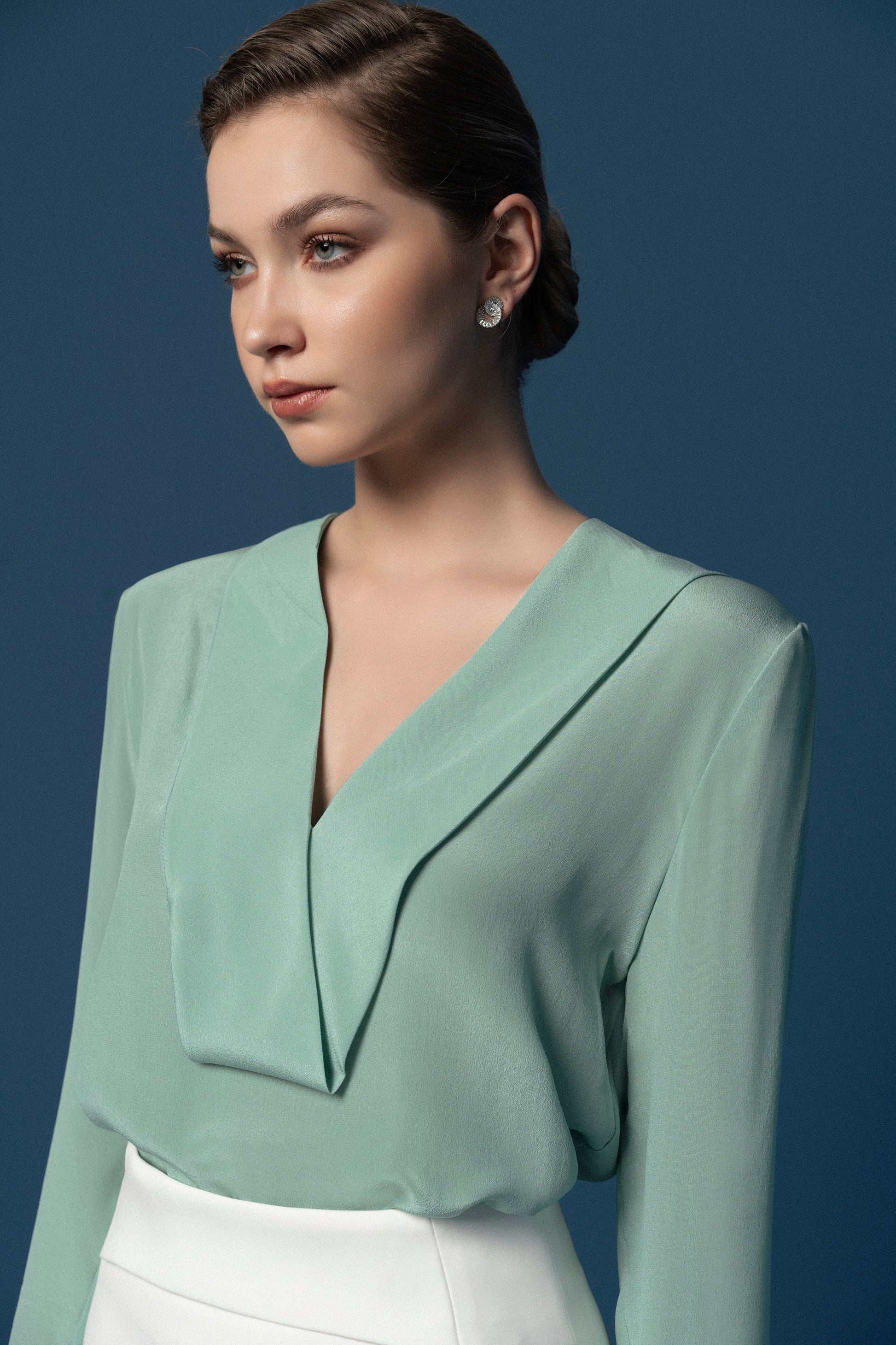 Cách điệu từ chiếc sơ mi cổ V thông thường, Opal Shirt với phần xếp nếp nhẹ phía thân trước trên nền lụa tạo độ mềm mịn và thoáng mát.