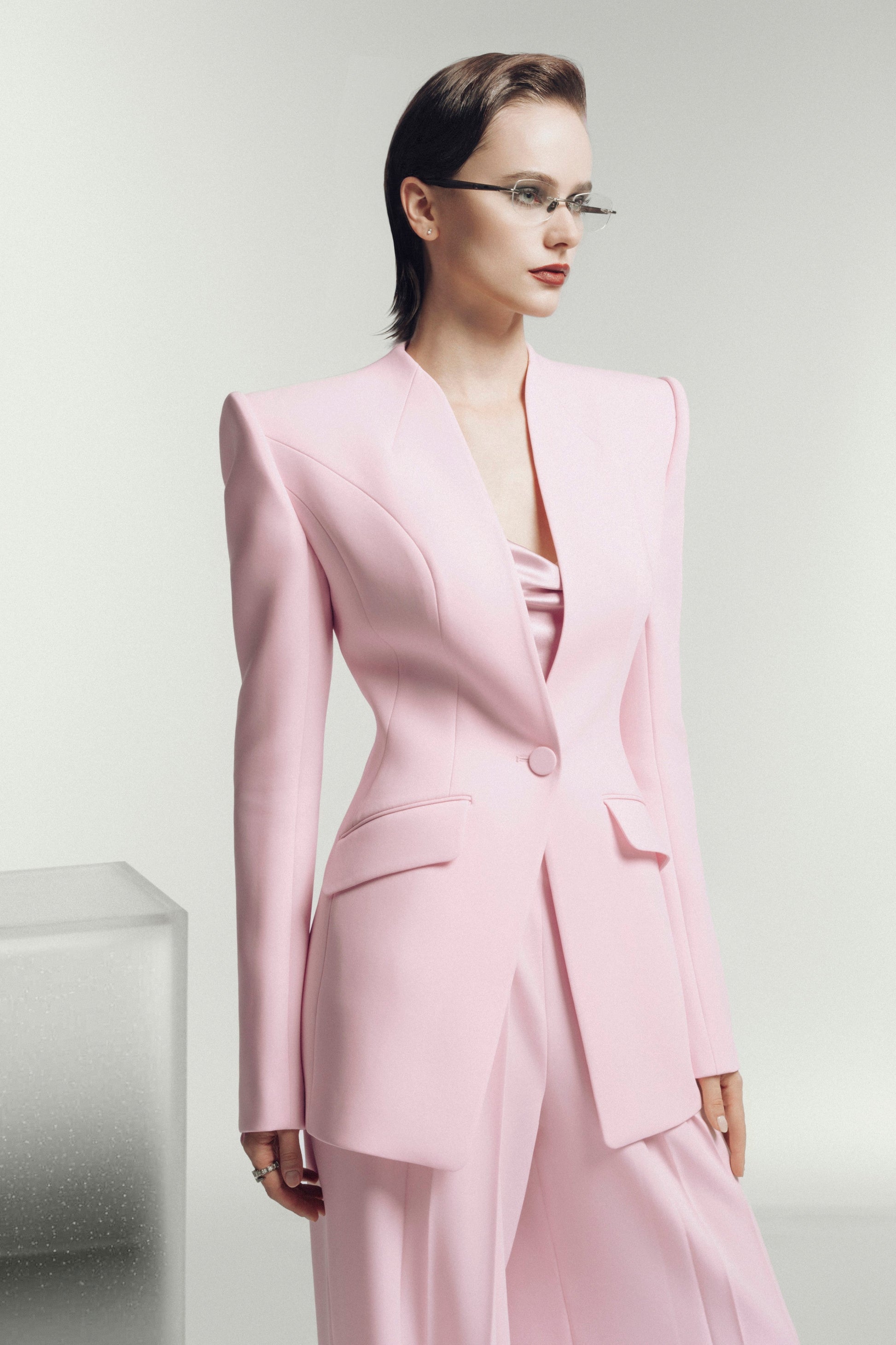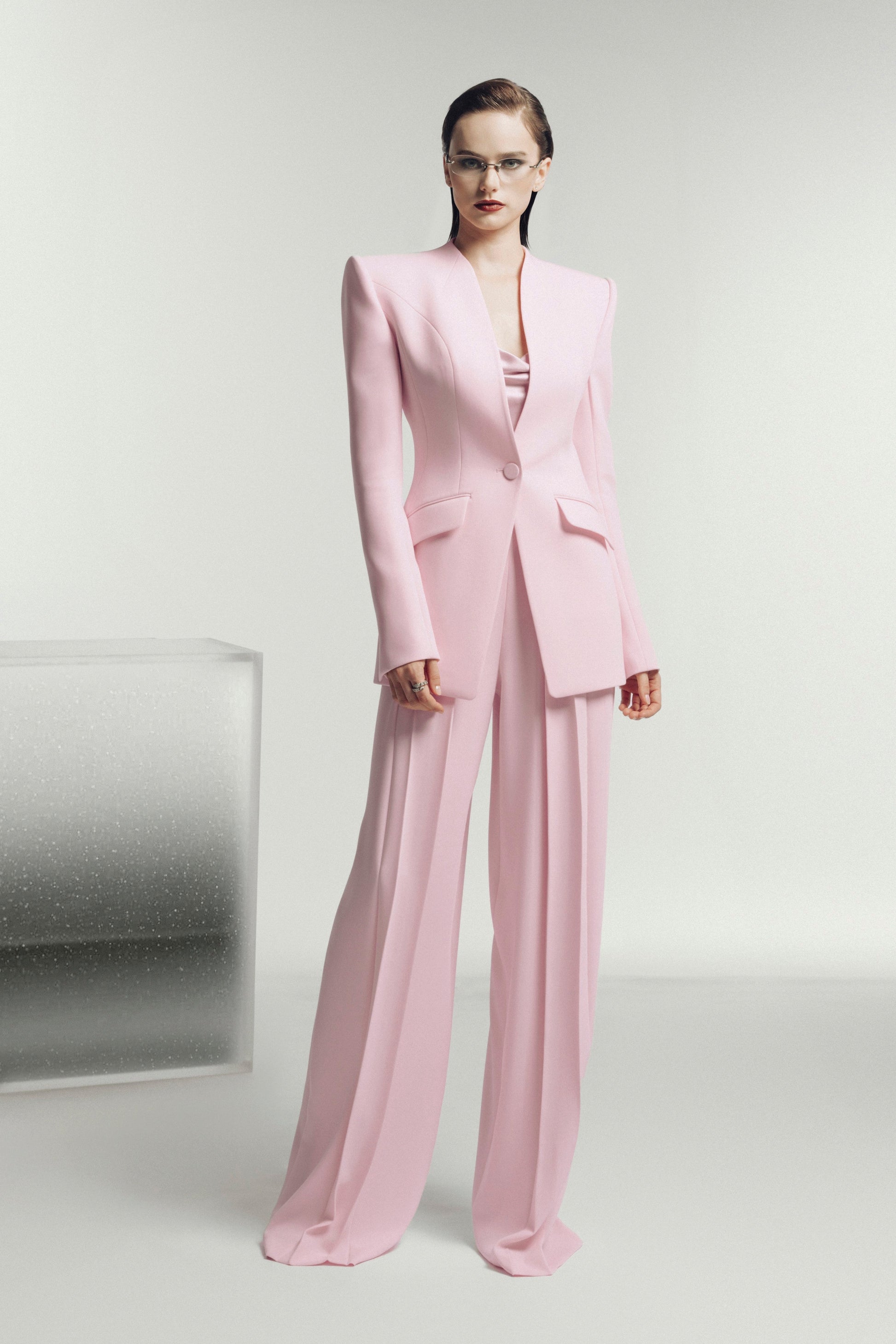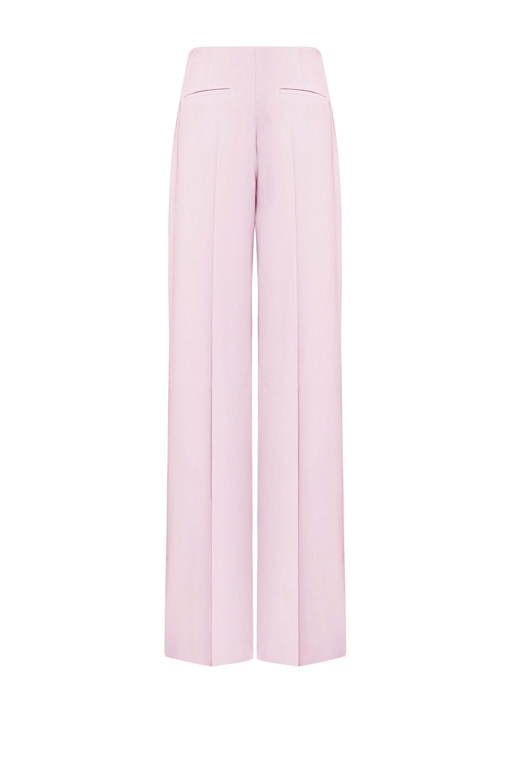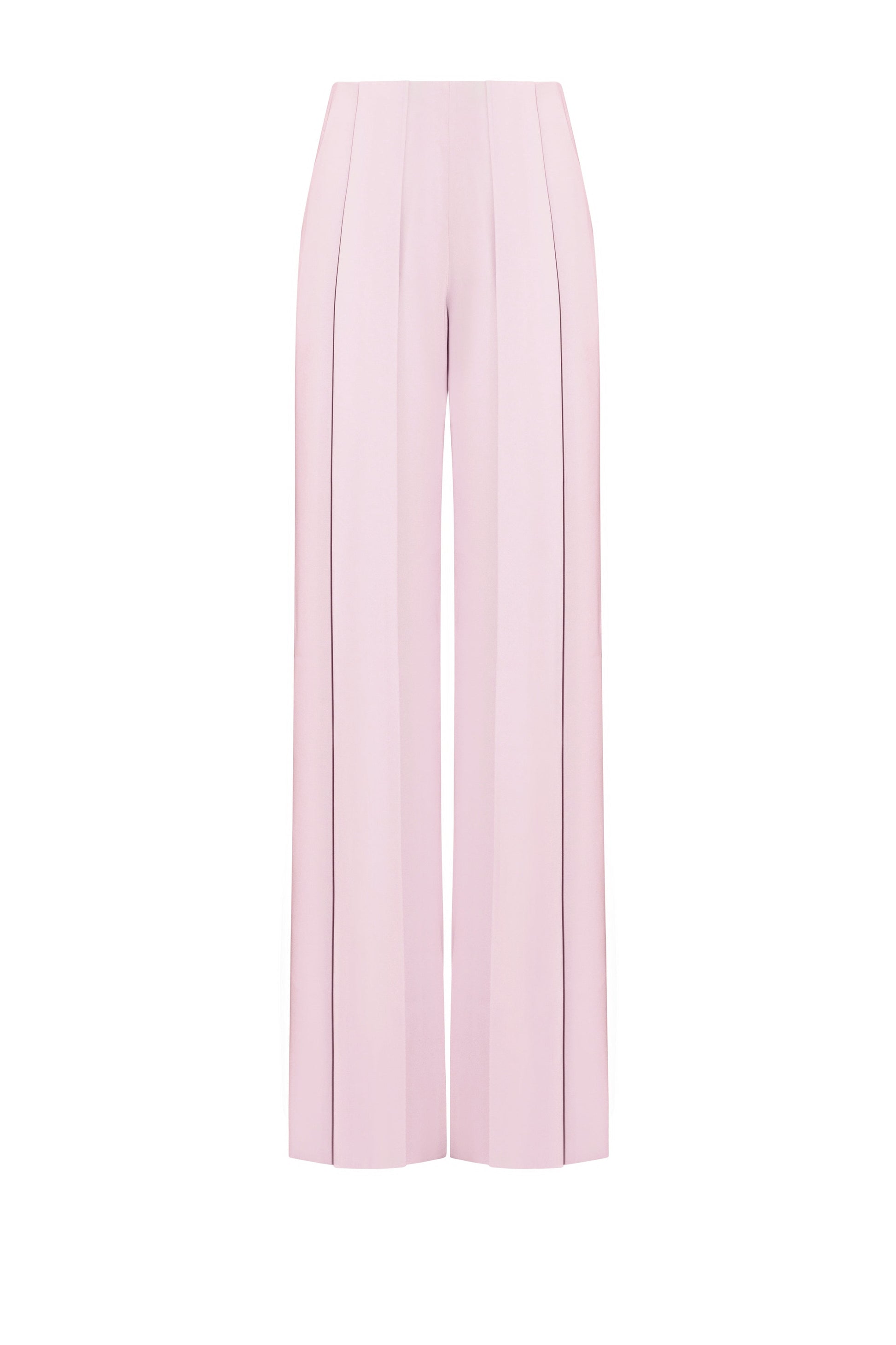 Low-rise wide-leg trousers with a seamless waistband. Inverted pleats extend from the waistband down to the hem, precisely pressed but left unstitched for a voluminous drape when worn. Side zipper closure with slanted pockets. The back features two classic darts and two welt pockets for a clean, tailored look.