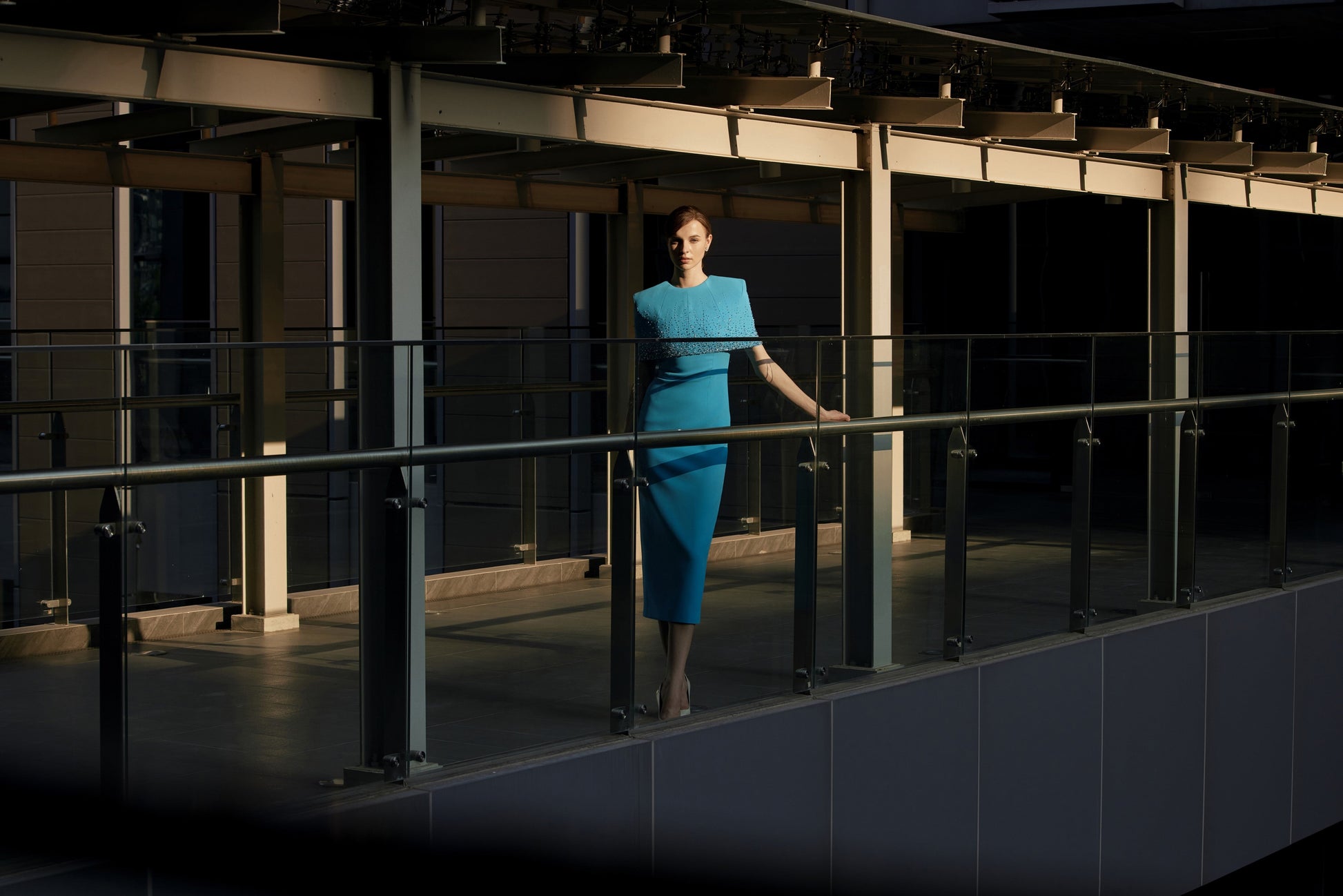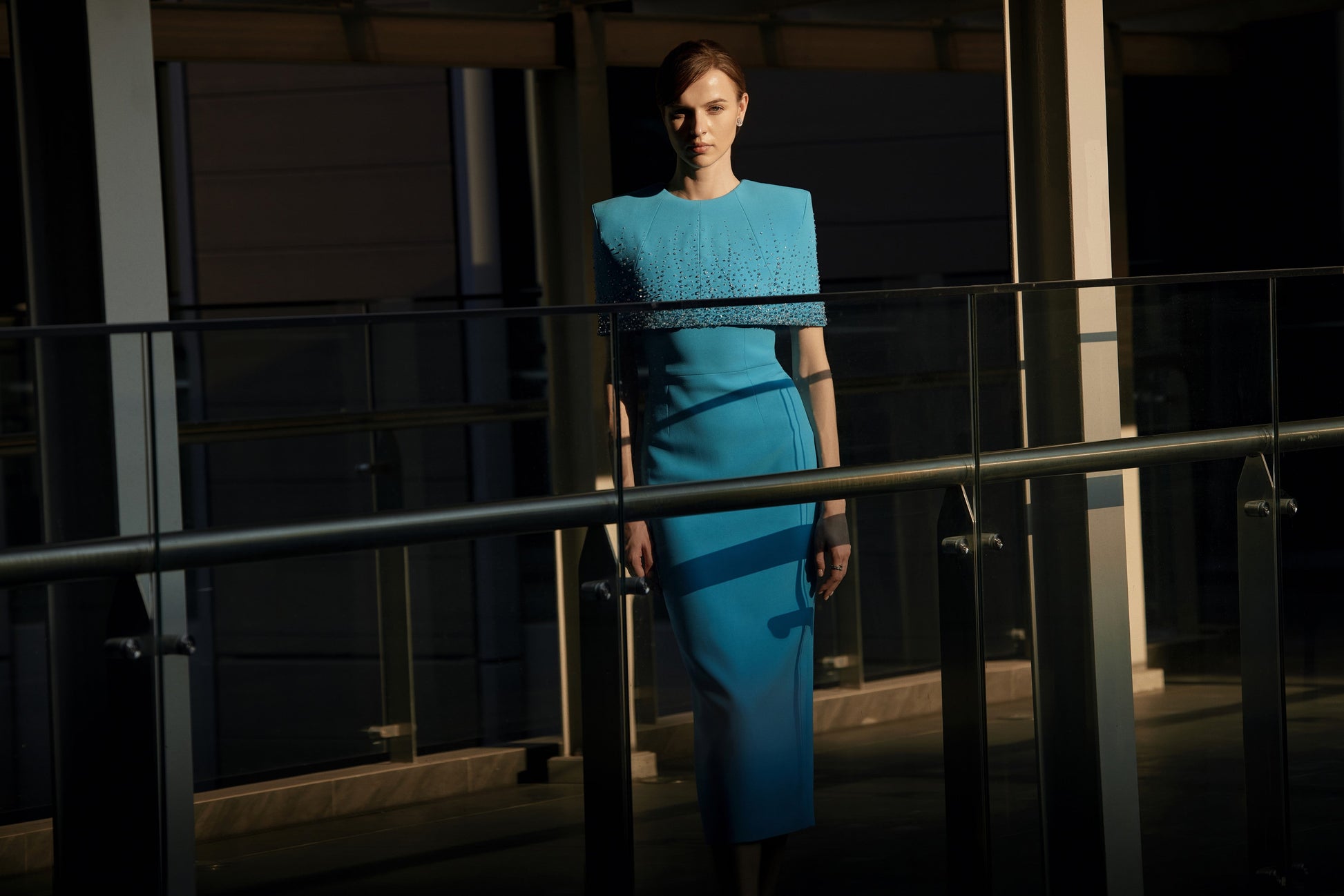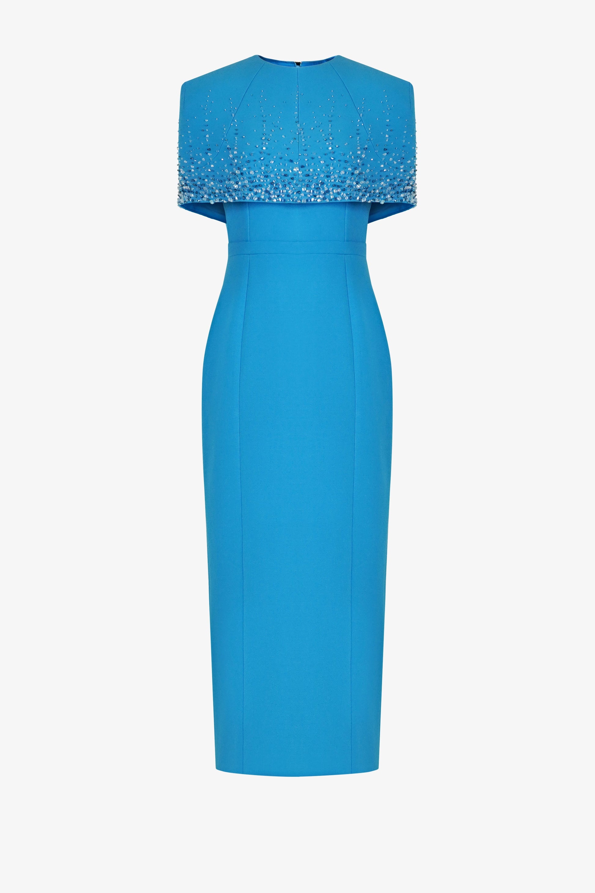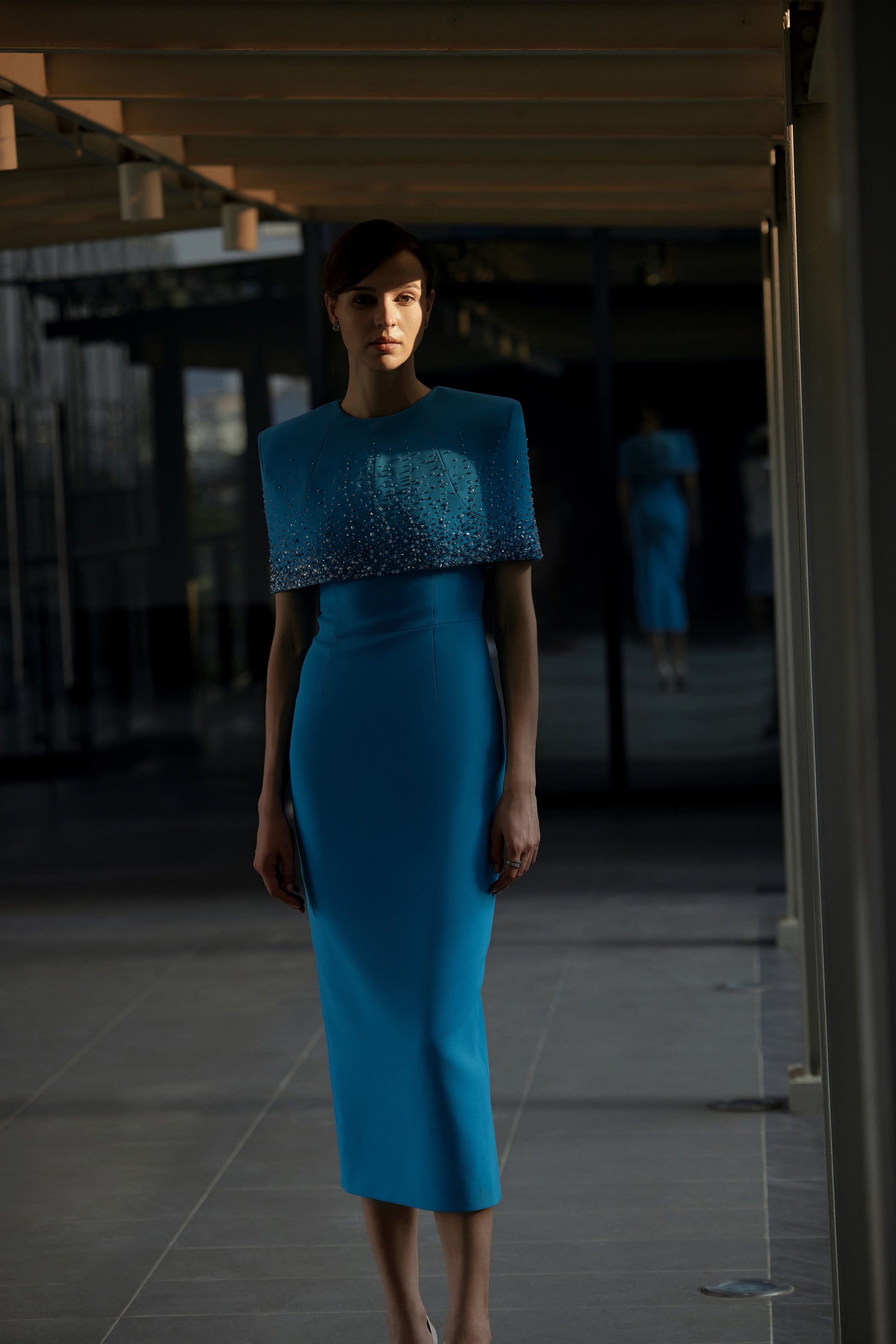 Đáp choàng vai kết hợp với váy dáng bút chì cổ tròn. Váy có hai đường li ở phần thân trên và hai đường li ở phần thân dưới. Phía sau có cùng một thiết kế đường li với thân trước. Đường may cắt ở eo. Đáp choàng được trang trí bằng kỹ thuật đính đá cao cấp để tạo ra hiệu ứng rơi và chuyển màu cả ở phía trước và phía sau. Váy có một chiếc khóa kéo kim loại ở giữa lưng sau của áo choàng vai.