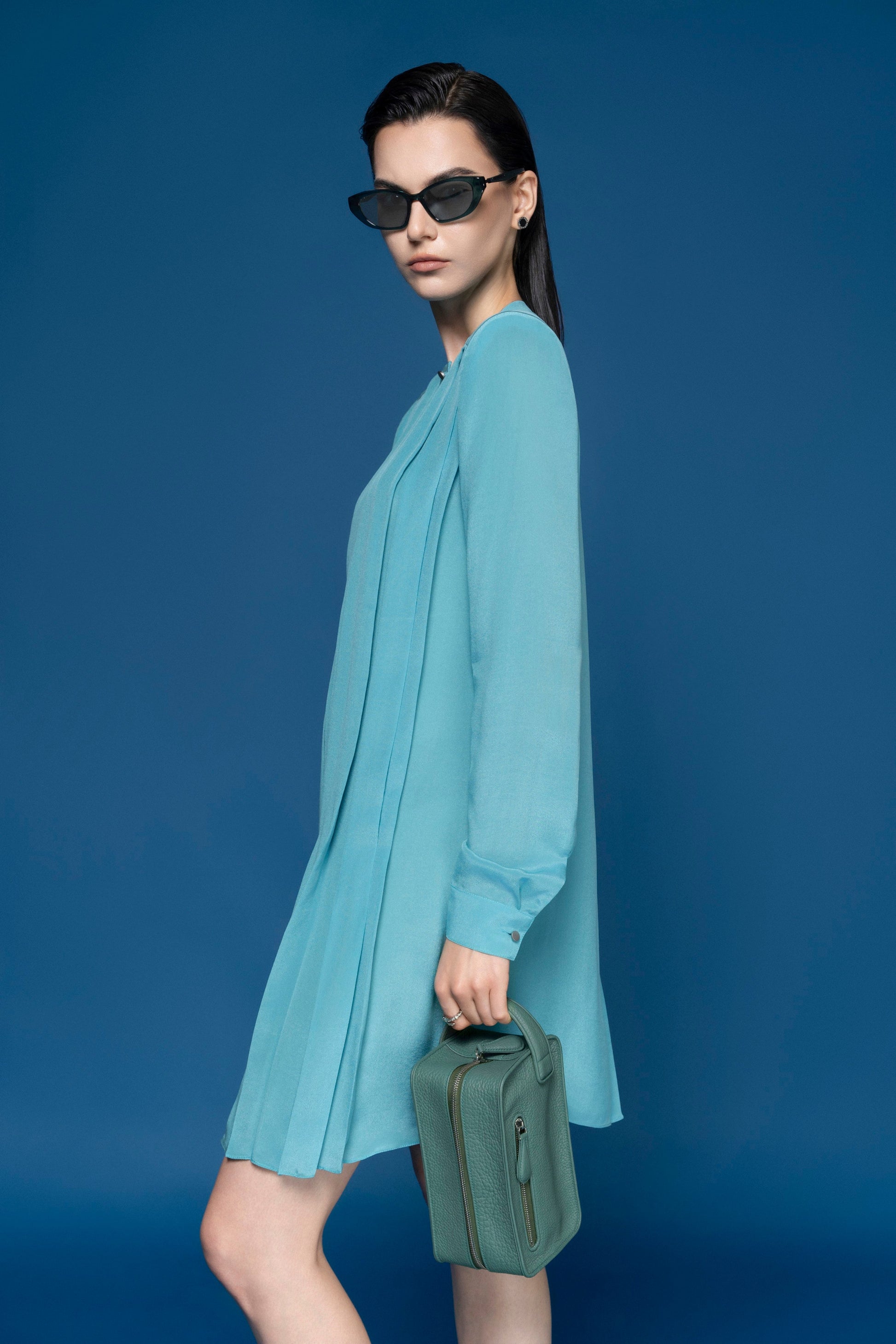 Relaxed-fit midi dress with a round neckline and structured, draped shoulders. The neckline features an offset button and a V-slit detail. Extended shoulder design with asymmetric pleats at the front, stitched down at varying lengths for a fluid, deconstructed look. Hem is rolled for a soft finish. Light shoulder pads add subtle definition, and sleeves feature inset gussets. The back includes a yoke with an inverted box pleat running down to the hem for added movement.