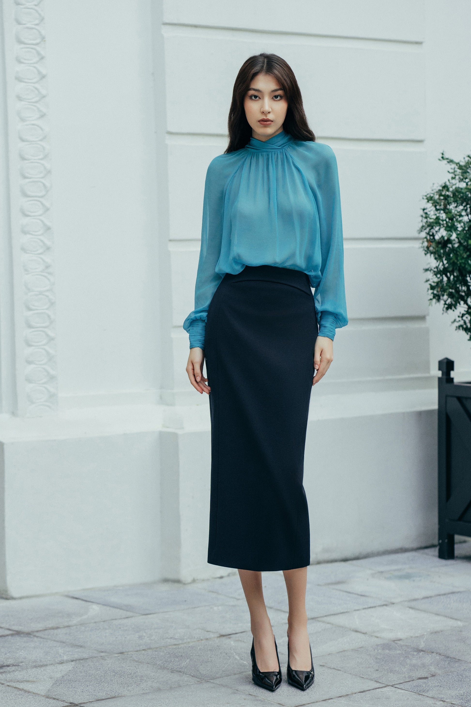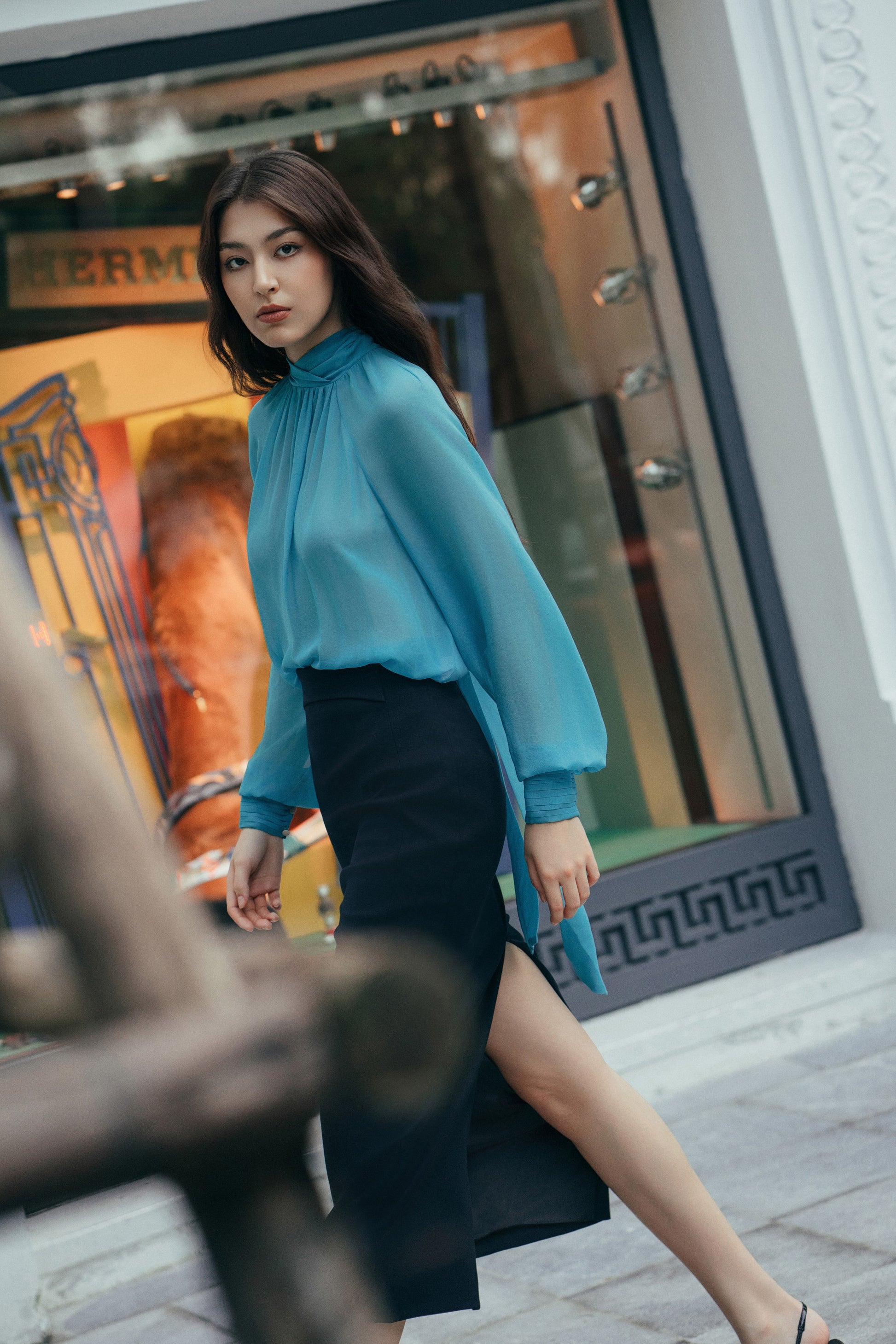 Sơ mi dáng suông, tay dài xếp phồng cửa tay, vai raglan xếp nếp, cổ vắt chéo, dây cổ dài 2m