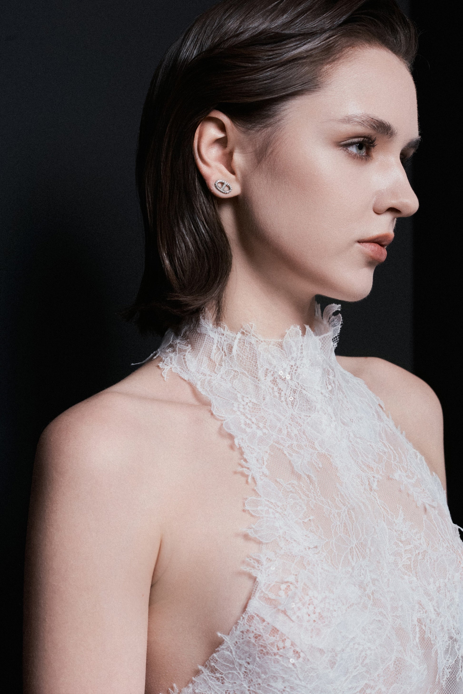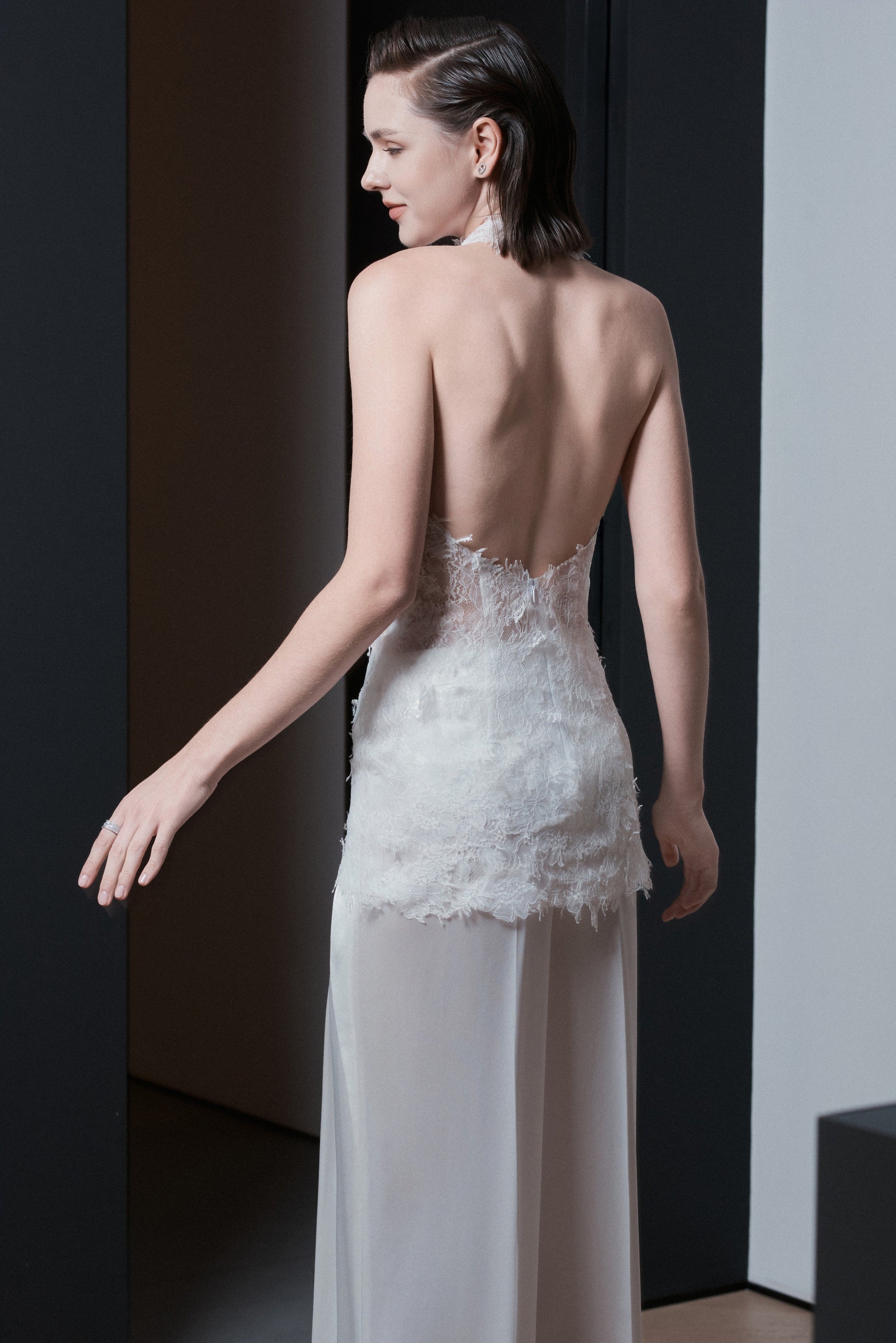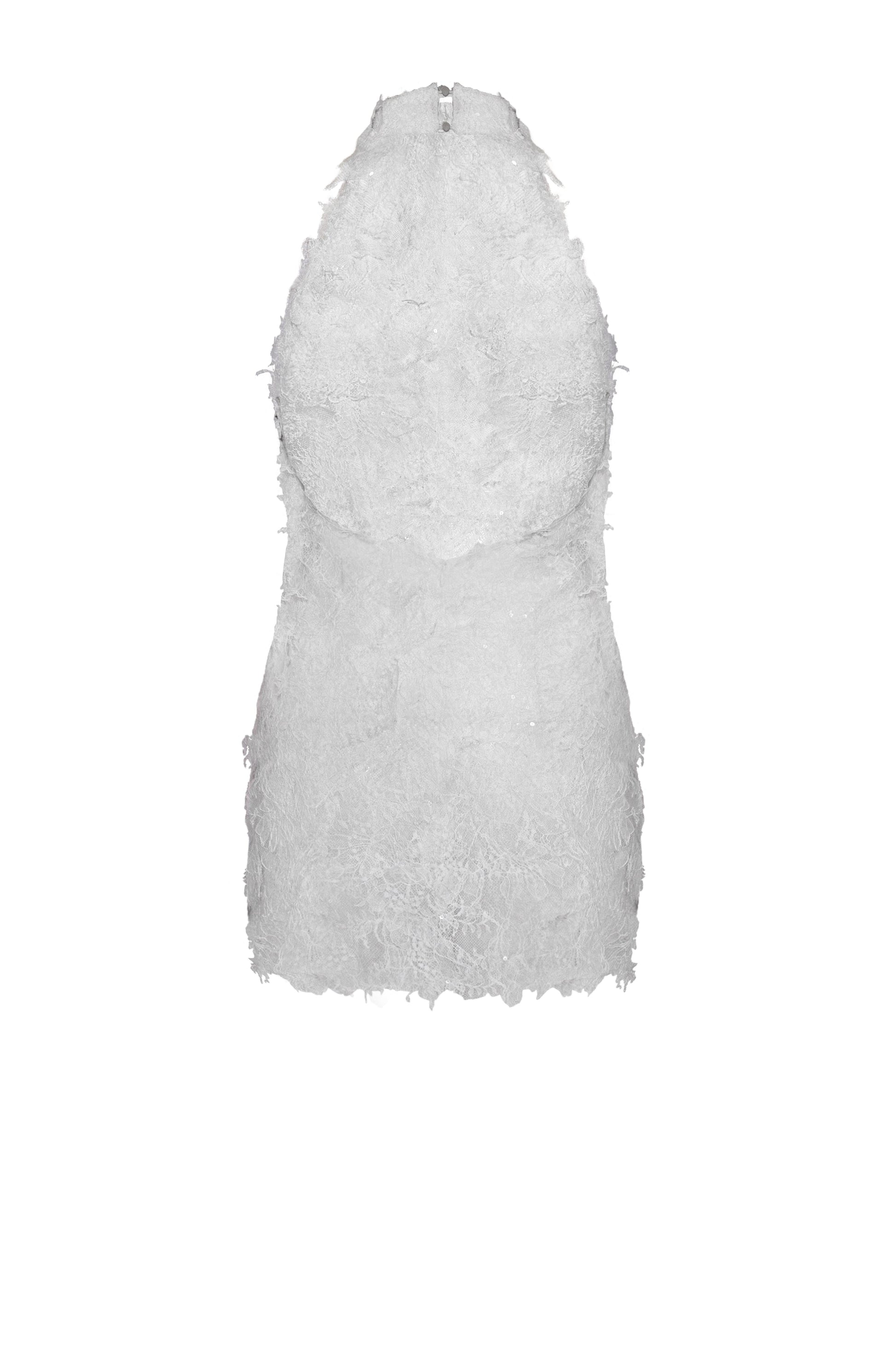 Halter-neck top with a back cutout and a center-back zipper. Simplified panel construction ensures a clean, close-fitting silhouette. Trimmed lace is hand-arranged and hand-stitched to create a soft, lightweight fringe effect across the garment.