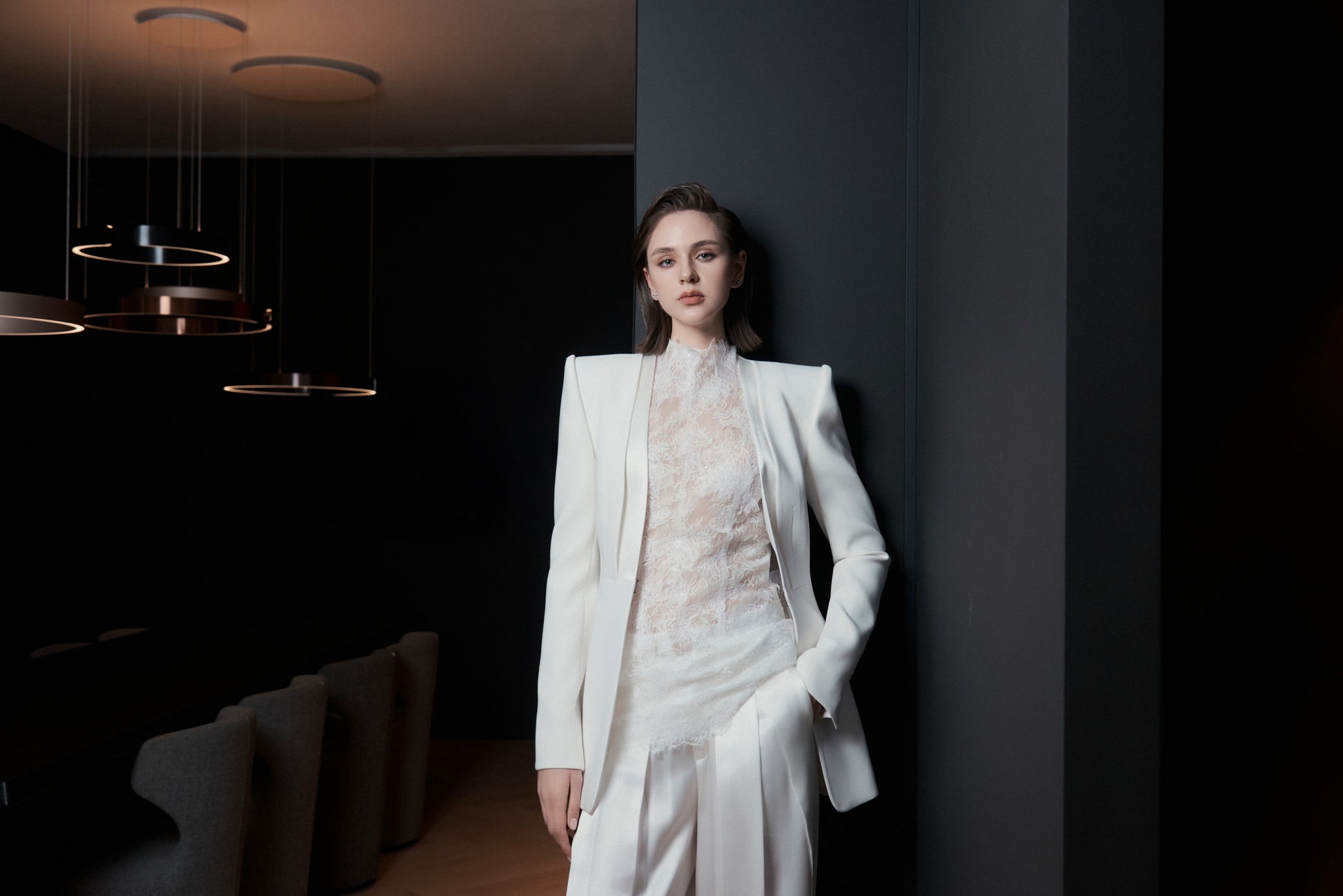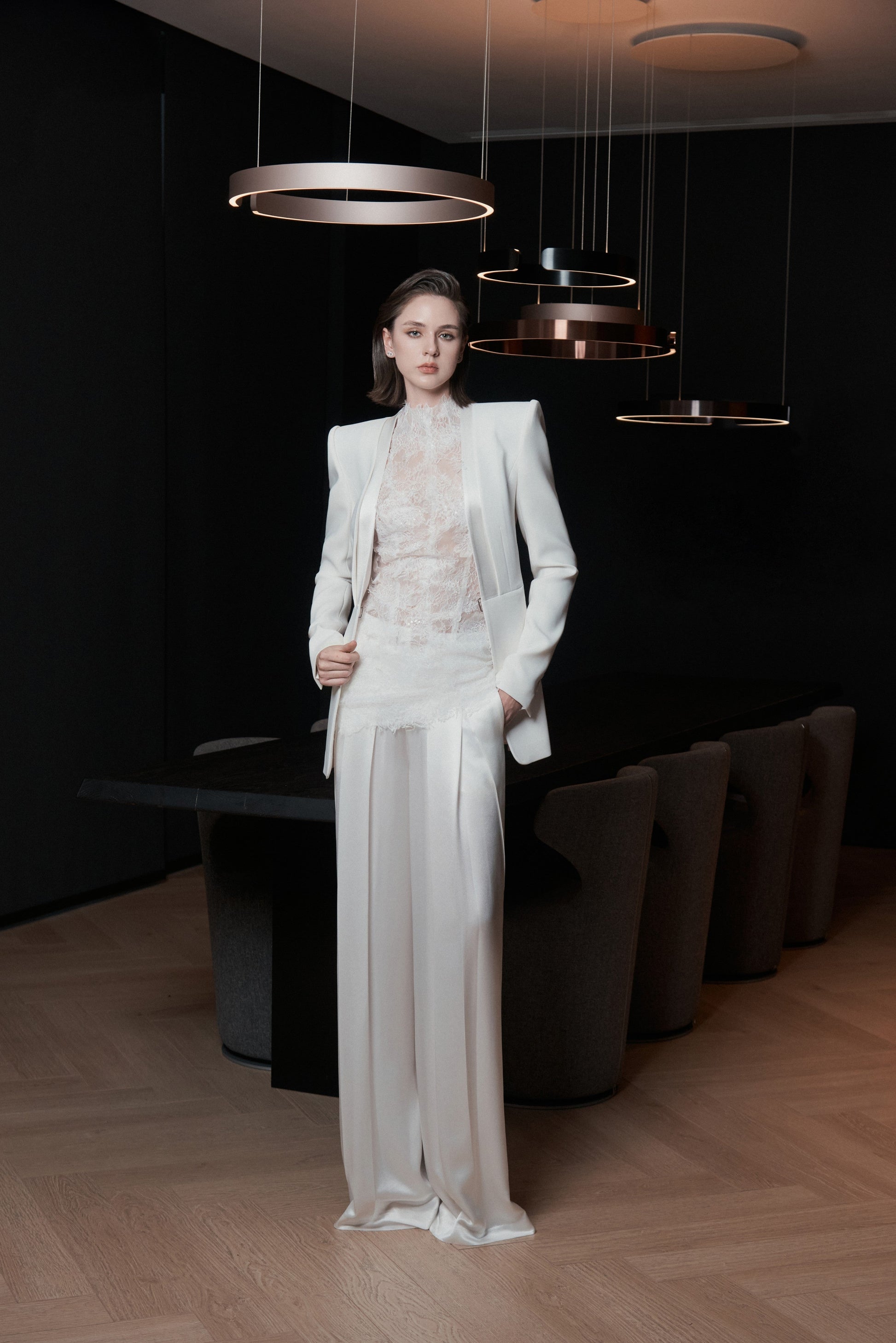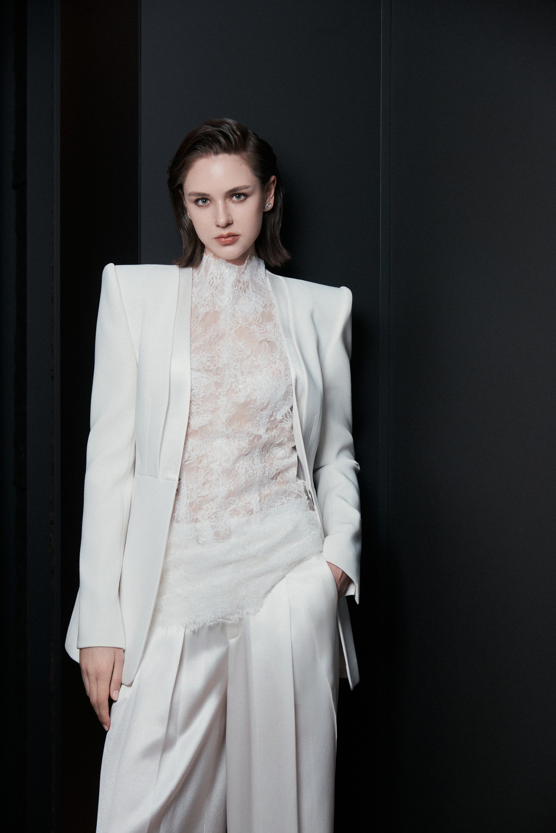 Halter-neck top with a back cutout and a center-back zipper. Simplified panel construction ensures a clean, close-fitting silhouette. Trimmed lace is hand-arranged and hand-stitched to create a soft, lightweight fringe effect across the garment.