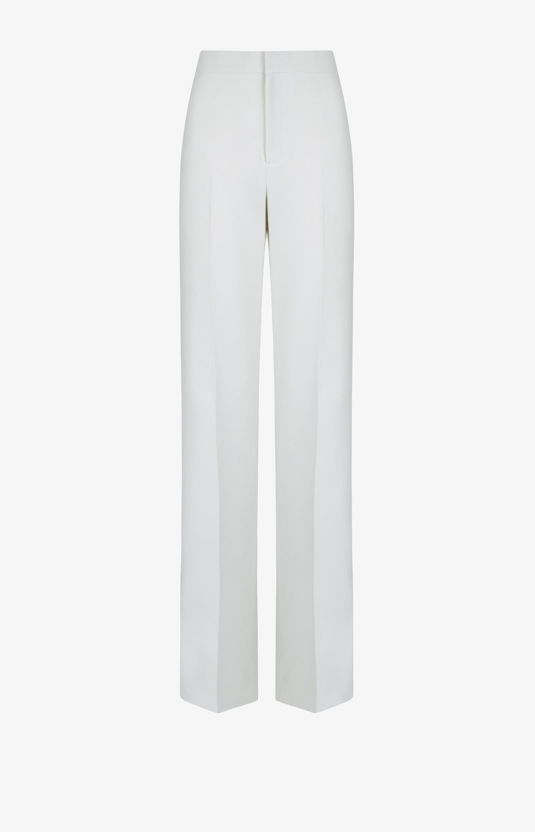 Quần suông rộng có 1 ly lật thân trước. Sườn phối dải satin từ chân cạp quần đến gấu. 2 túi cơi thân sau. Ống 29, dài phủ giày. Khóa lệ tại sườn trái.