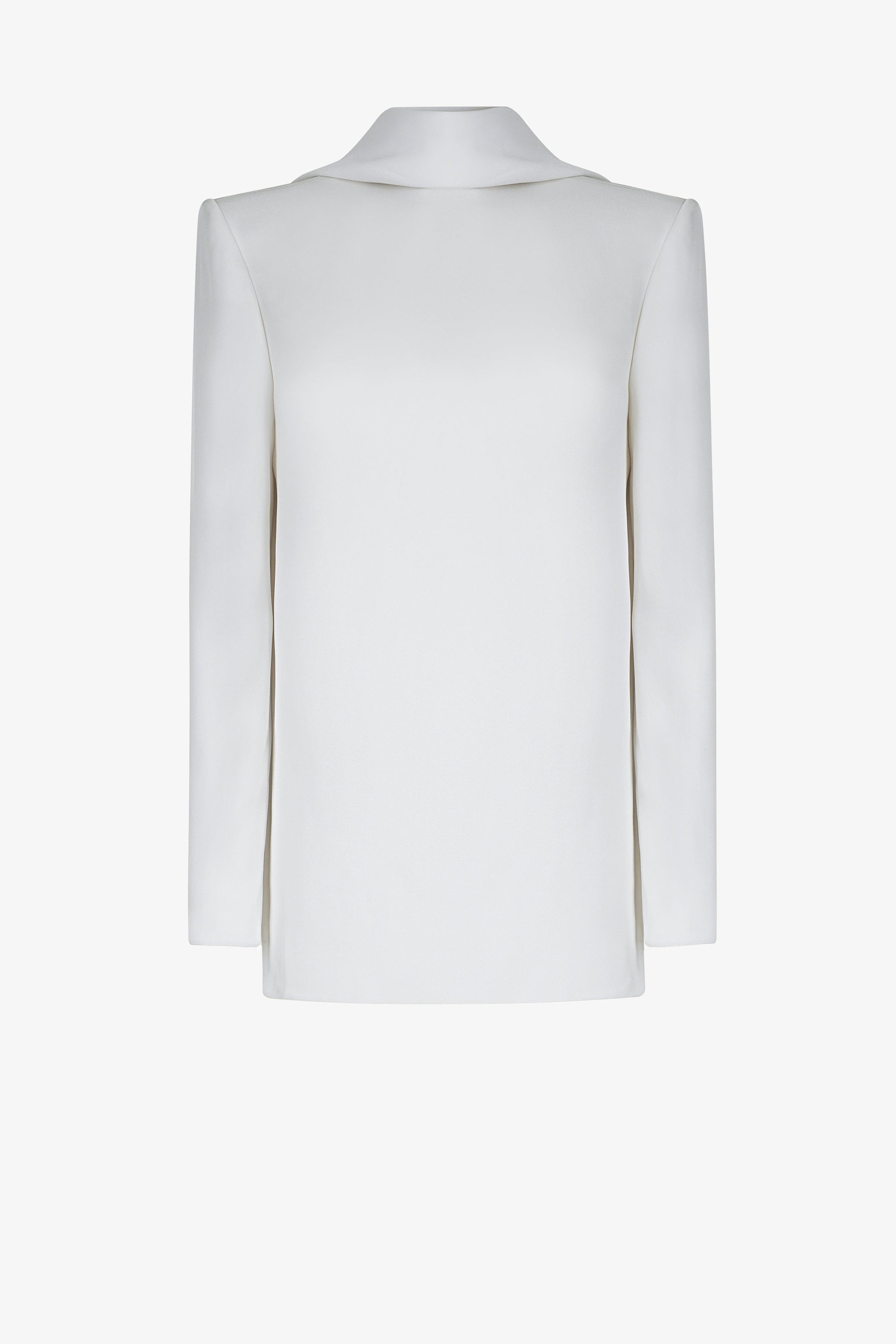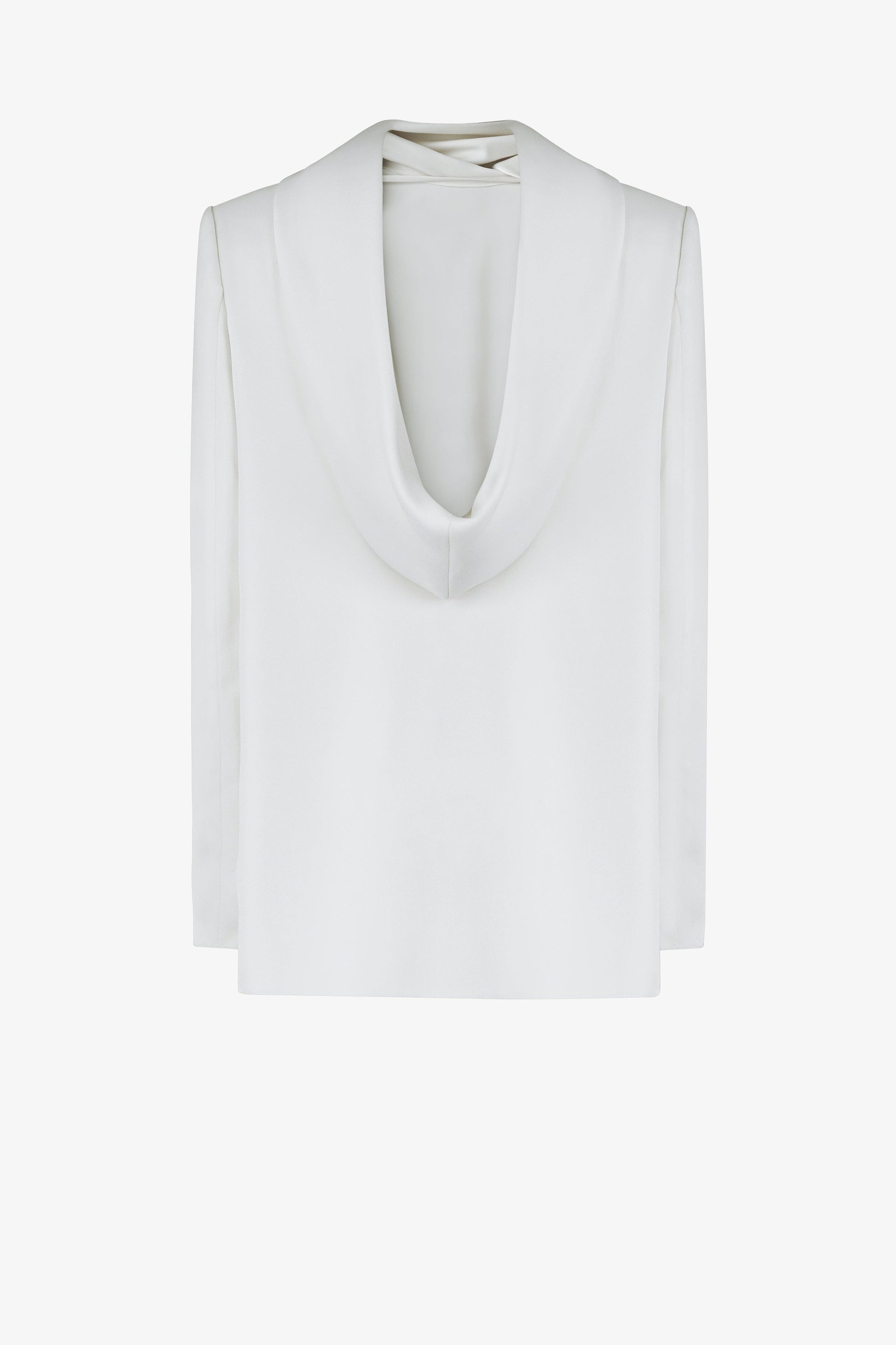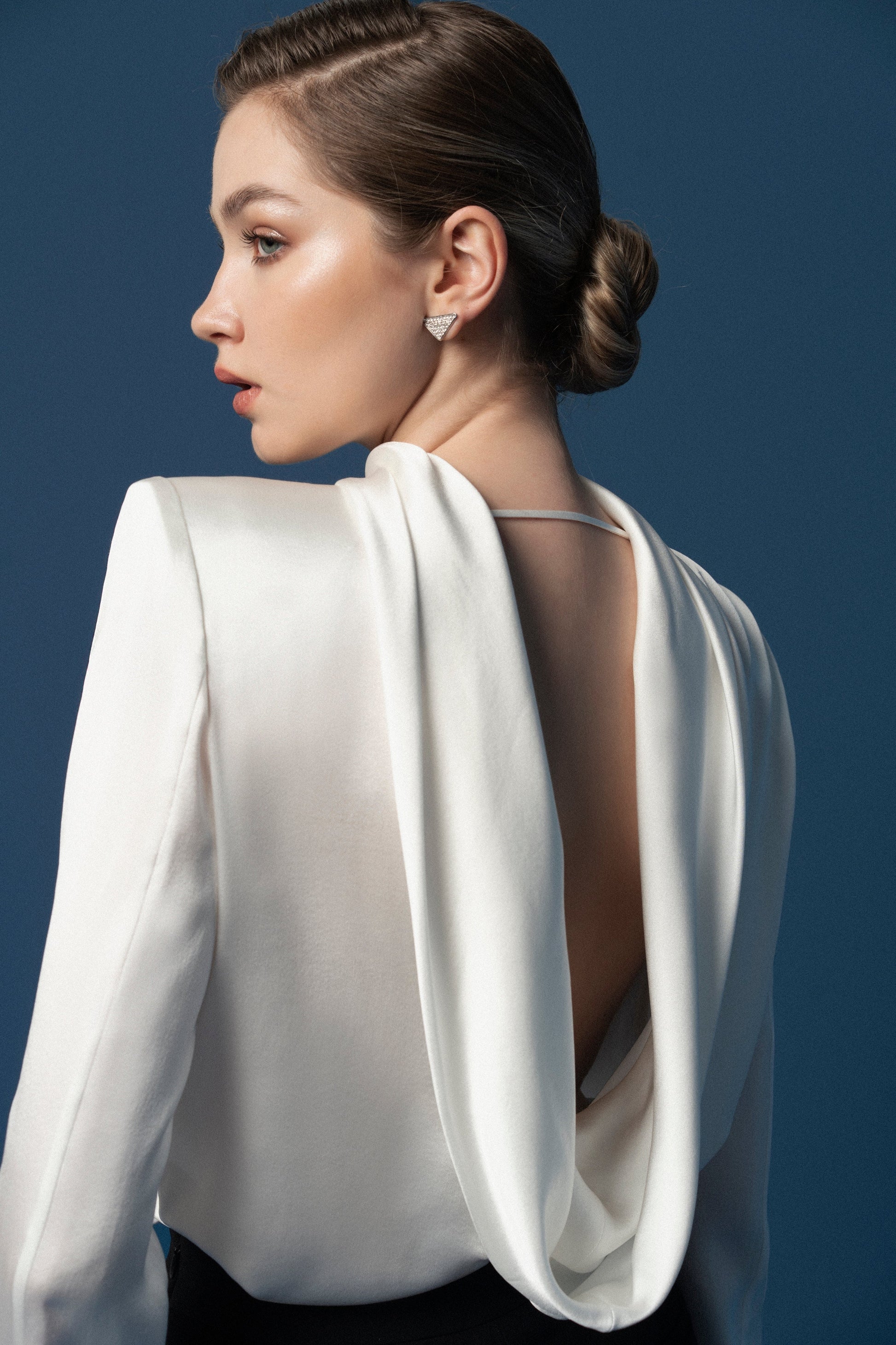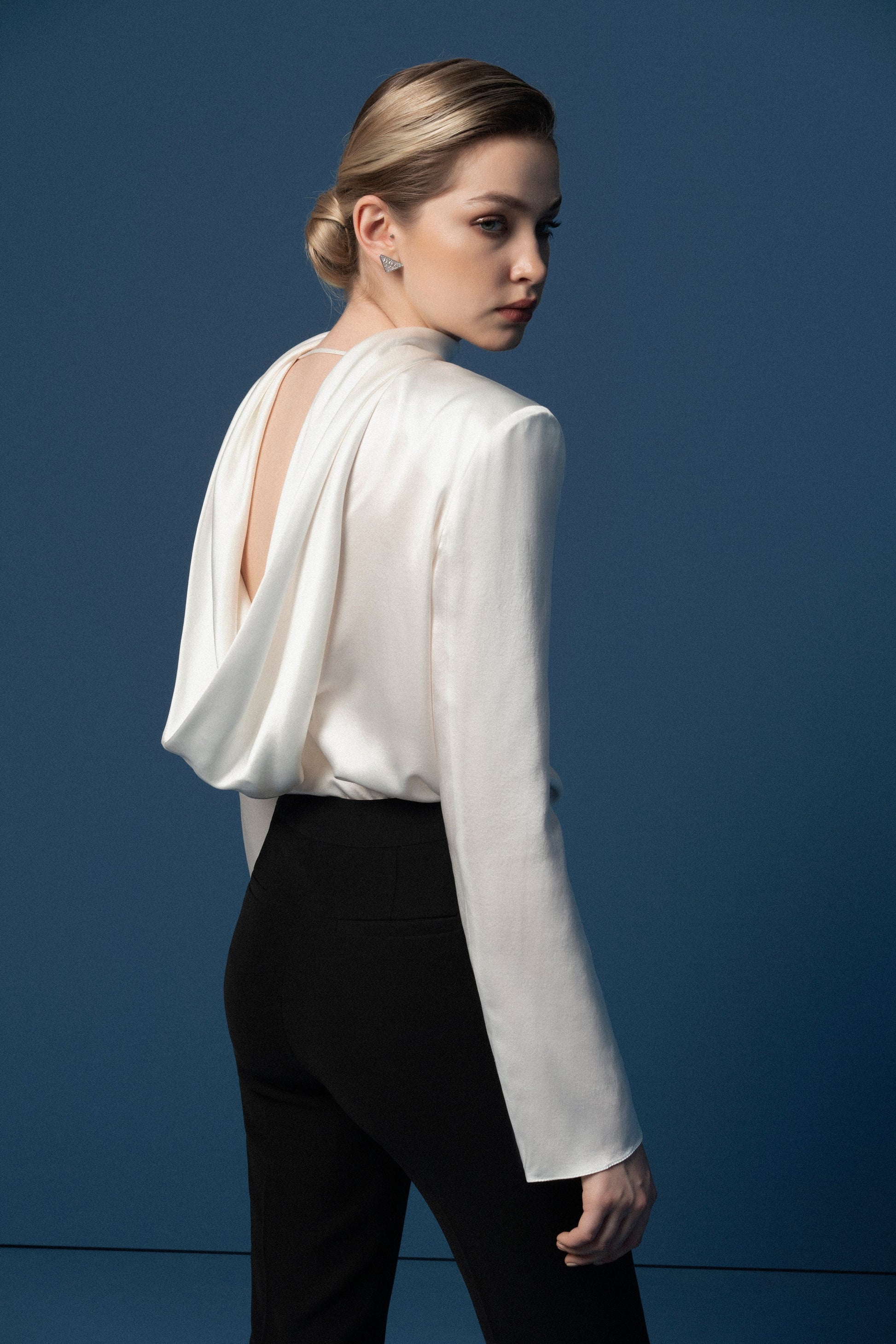 Sơ mi suông, cổ khăn đổ thân sau, vai ngang có độn, tay dài, cutout lưng sau.