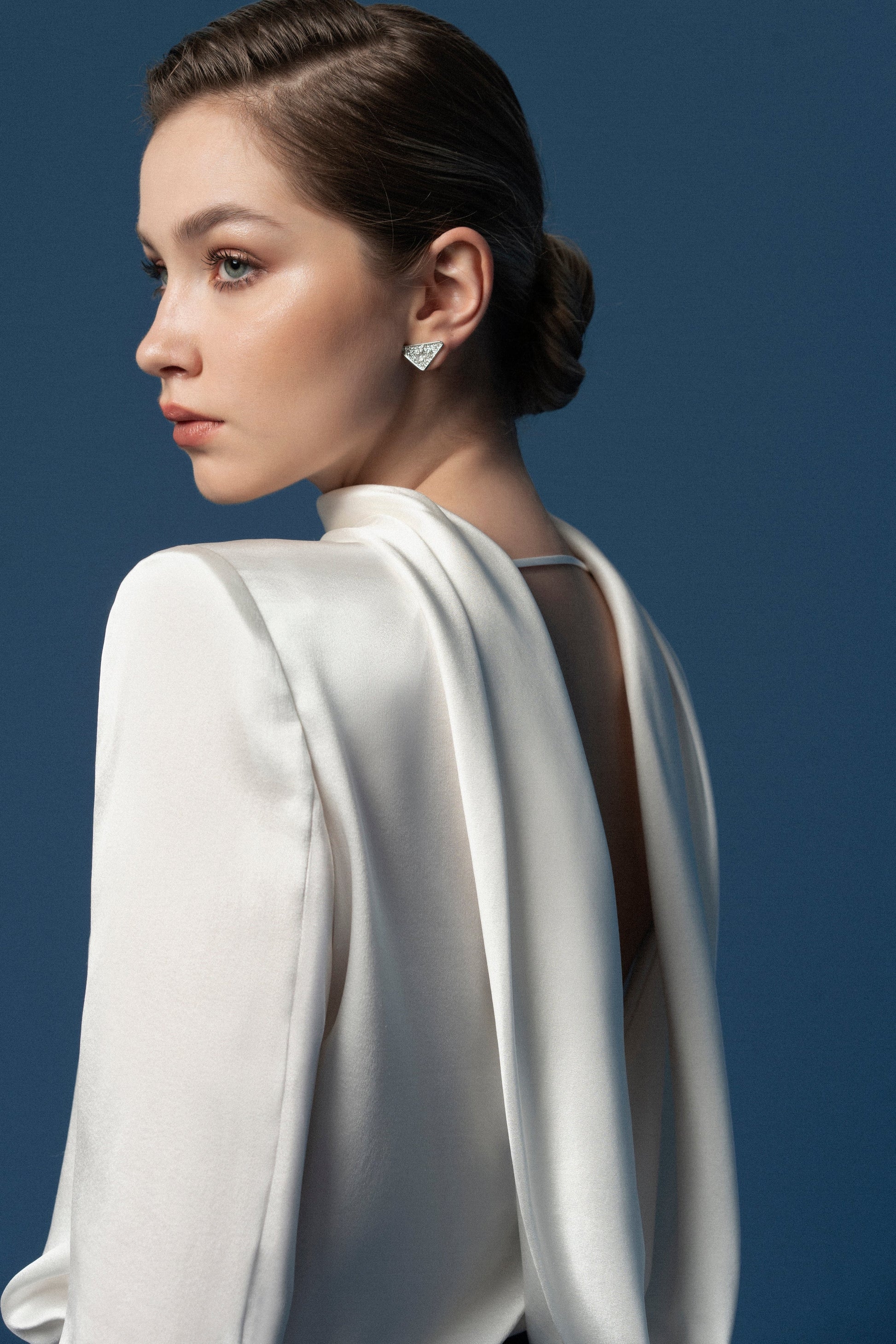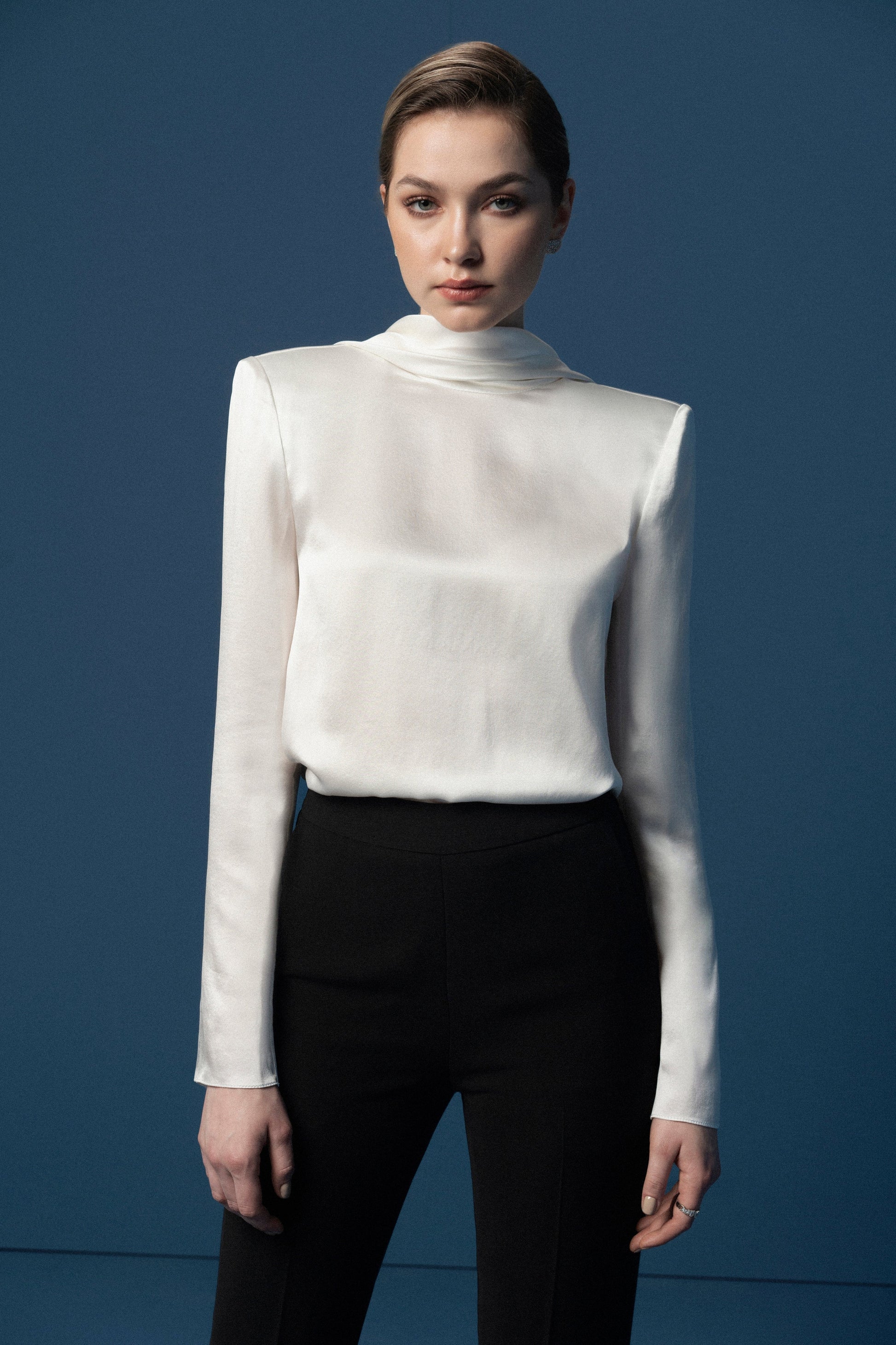 Tưởng chừng là đối lập nhưng tổng thể vô cùng hài hòa do cảm quan của chất liệu Sateen mang lại, Eldora Shirt mang hơi hướng của powerful shoulder, một ttrong những chi tiết mang đậm phong cách Women Boss. Phần cổ khăn đổ sau được cách điệu để luân phiên dung hòa sự mạnh mẽ và nữ tính trên trang phục.