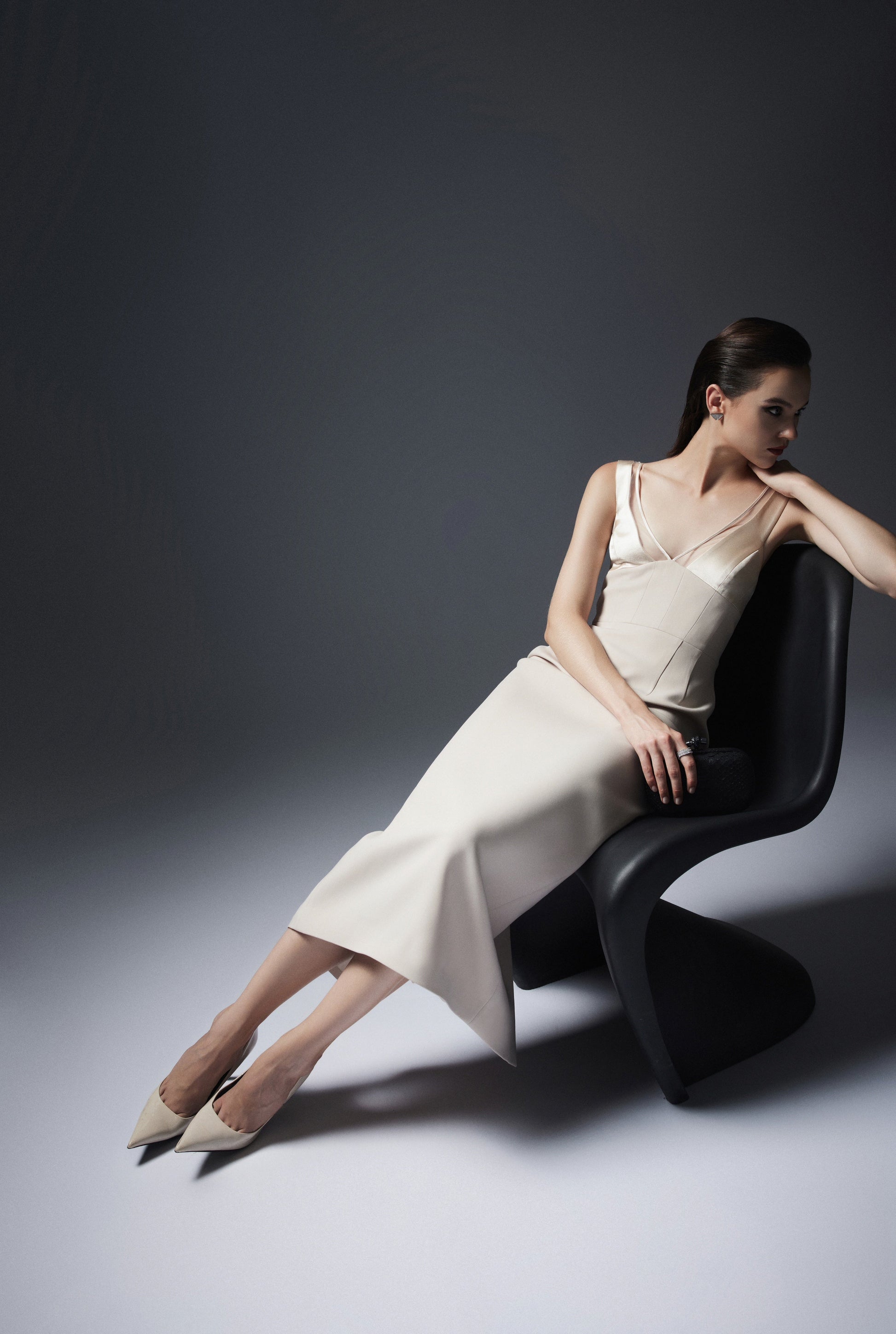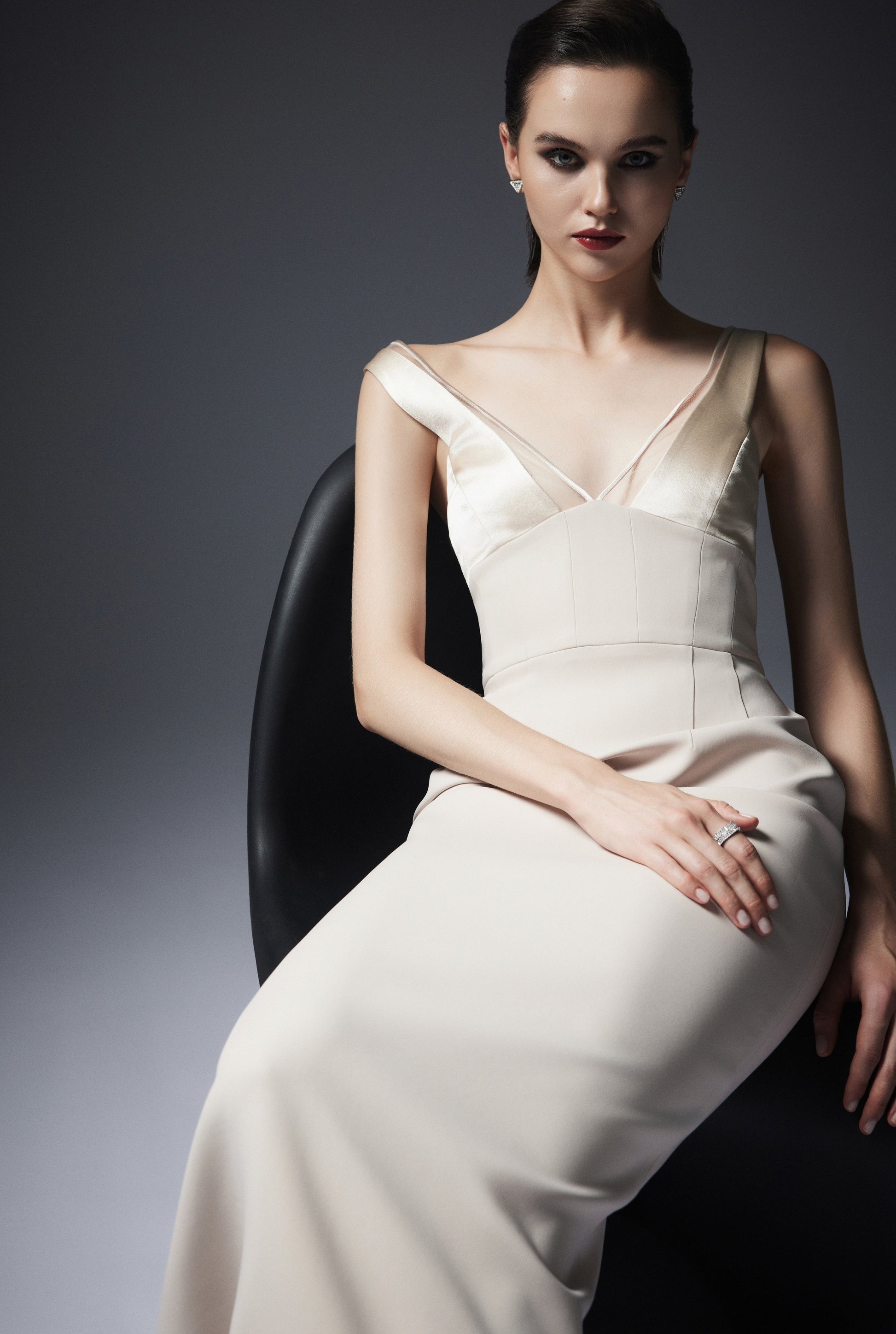 Đầm dài tới mắt cá, có phần thân corset được dựng phom bằng gọng. Cổ V với phần ngực bổ các miếng hình khối tạo độ ôm. Dây áo được phối cùng với vải lưới có bọc viền satin. Khoá đồng phía sau và xẻ chồng