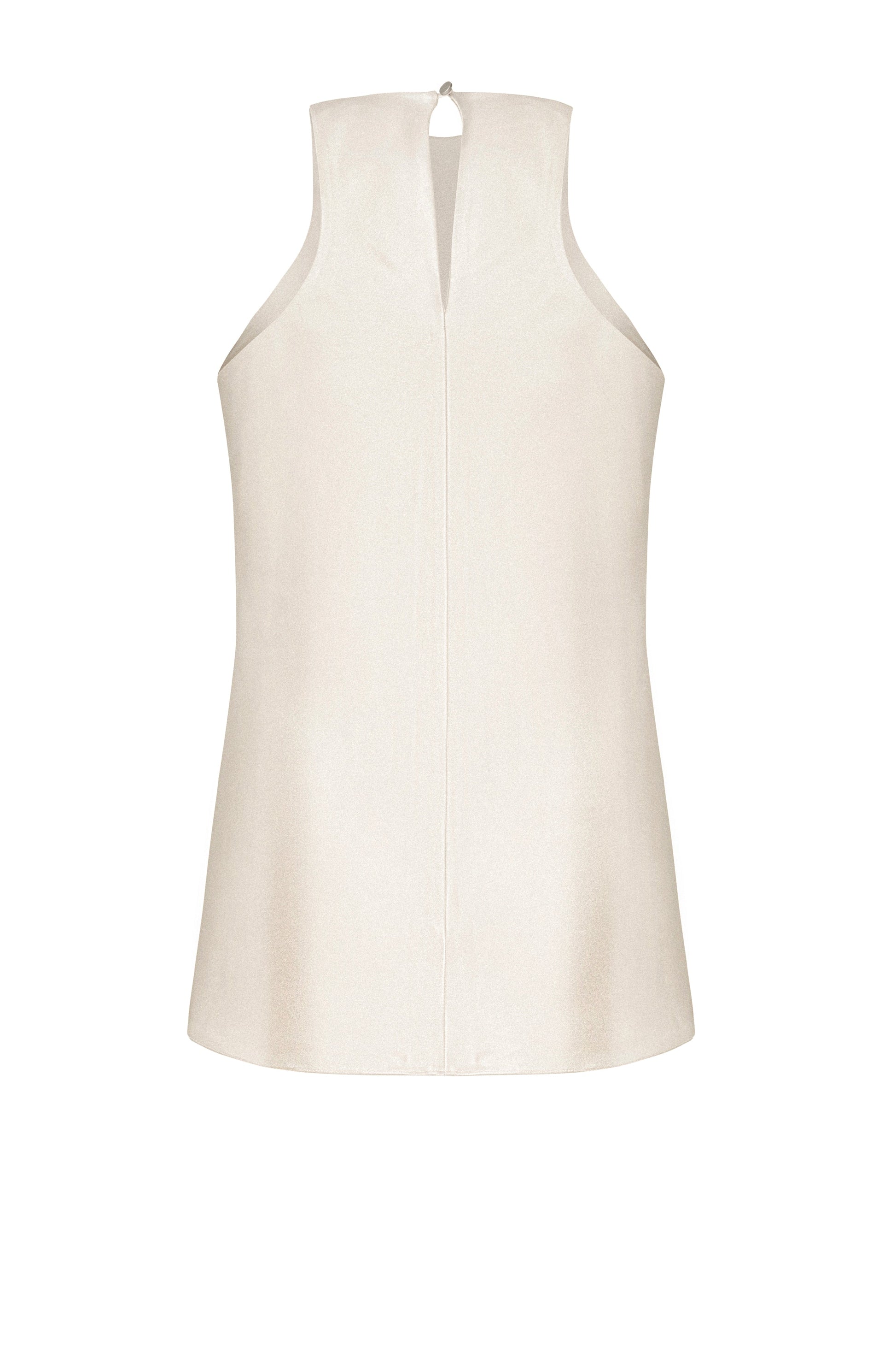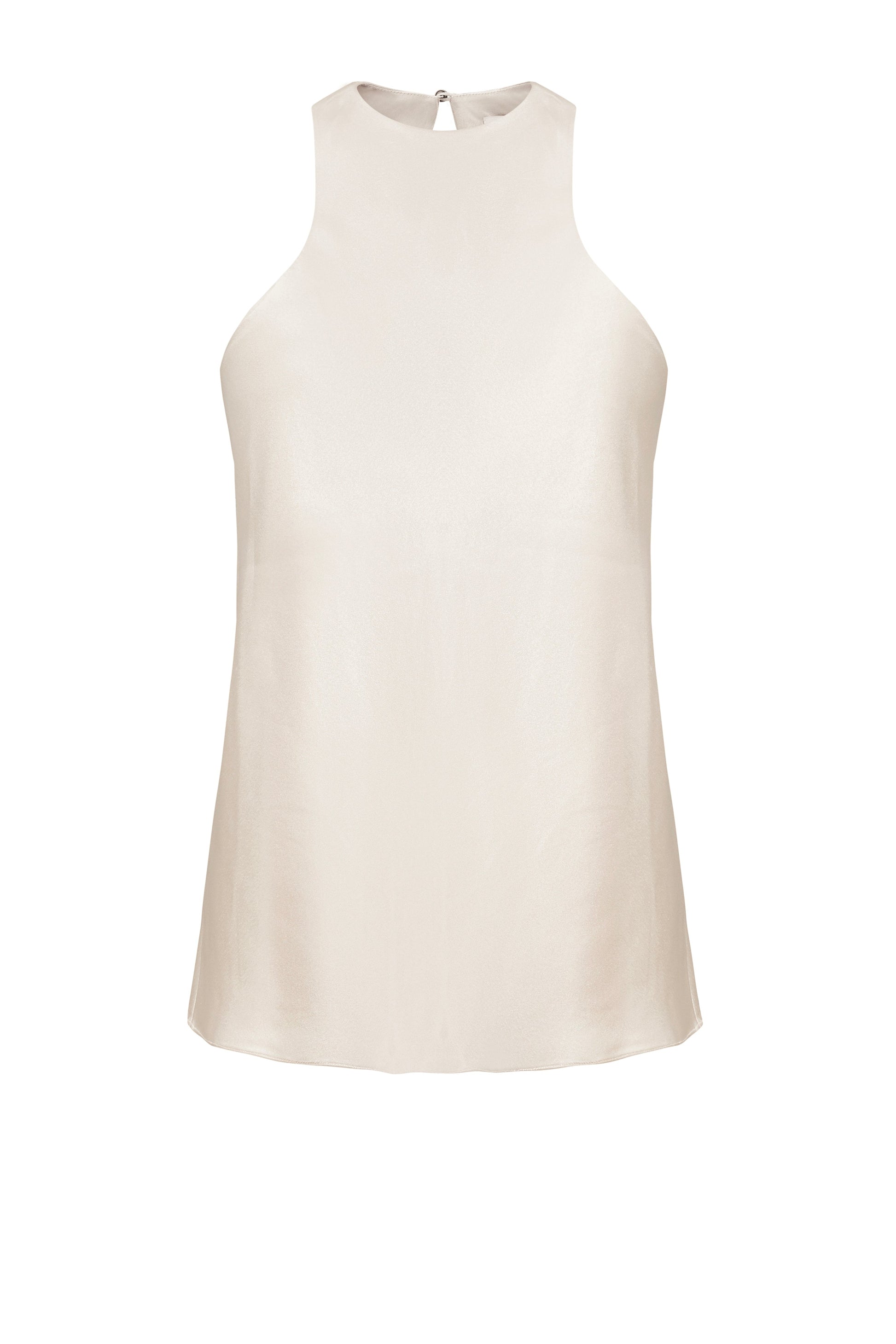 Round-neck tank top with deep curved armholes cut inward at the front for a sleek, sculpted look. Bias-cut body enhances fit and contours to the form. Back features a slit with hook-and-eye closure for easy wear.